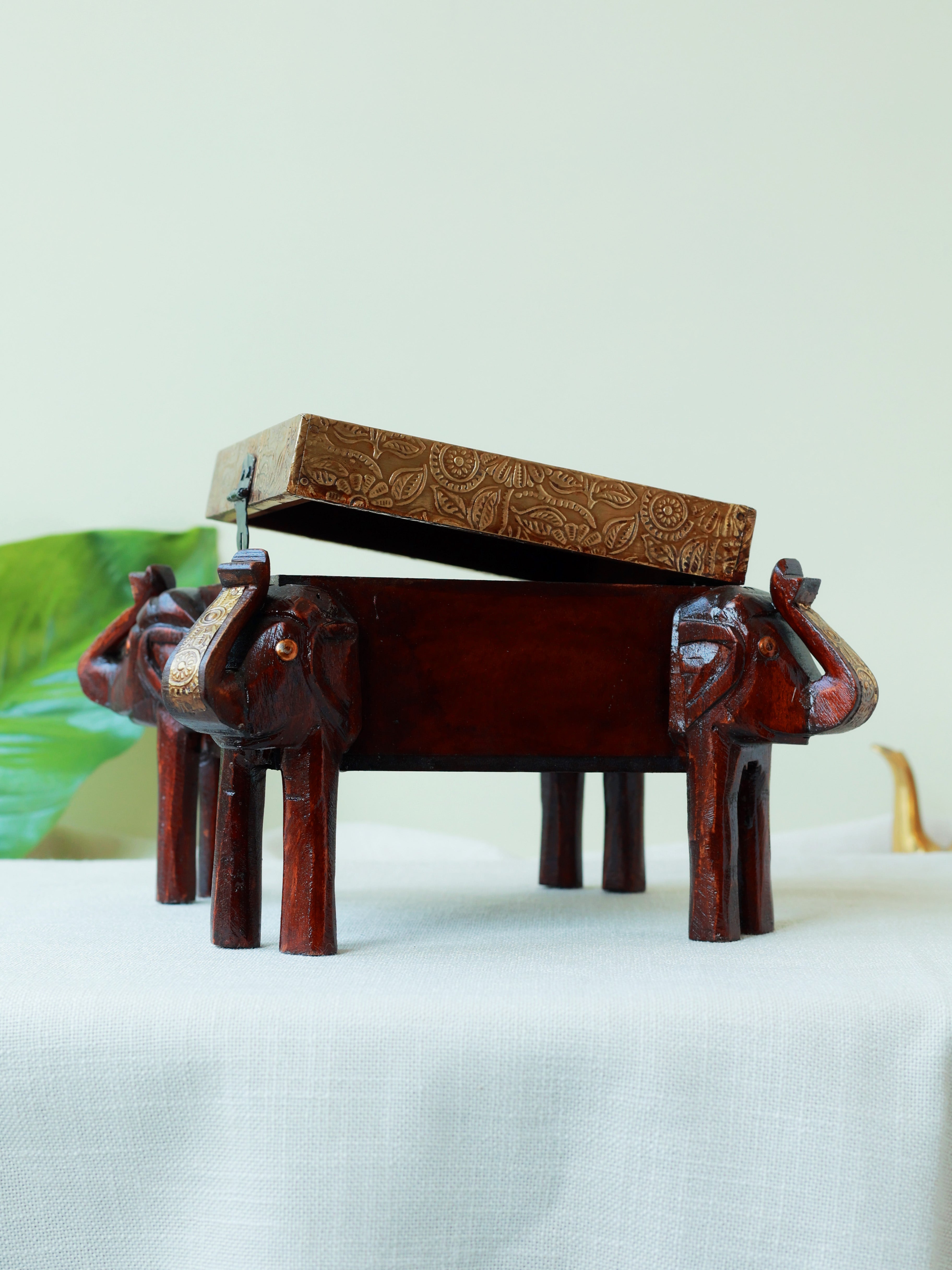 Wooden Handcrafted Brass Elephant Storage Box