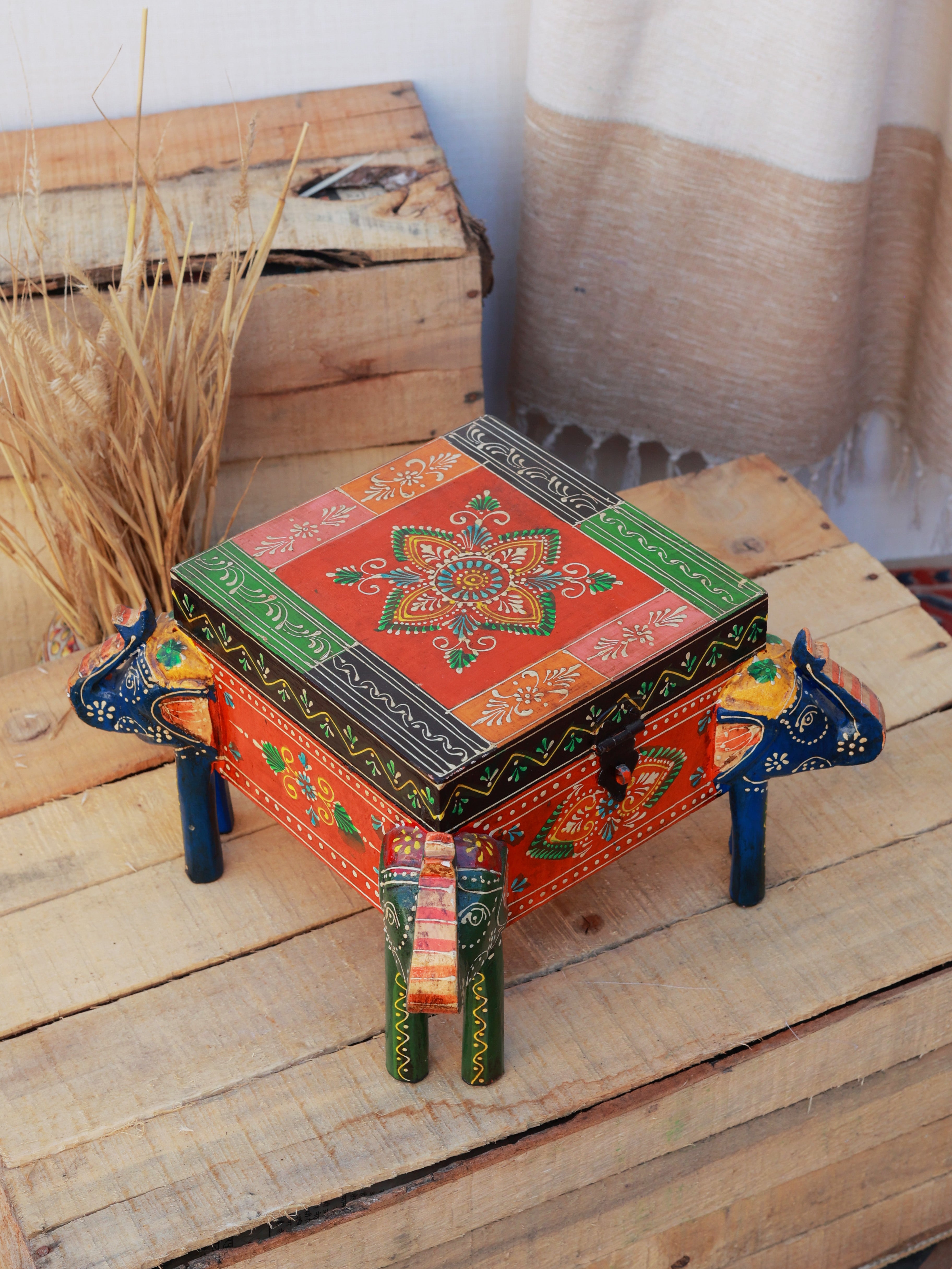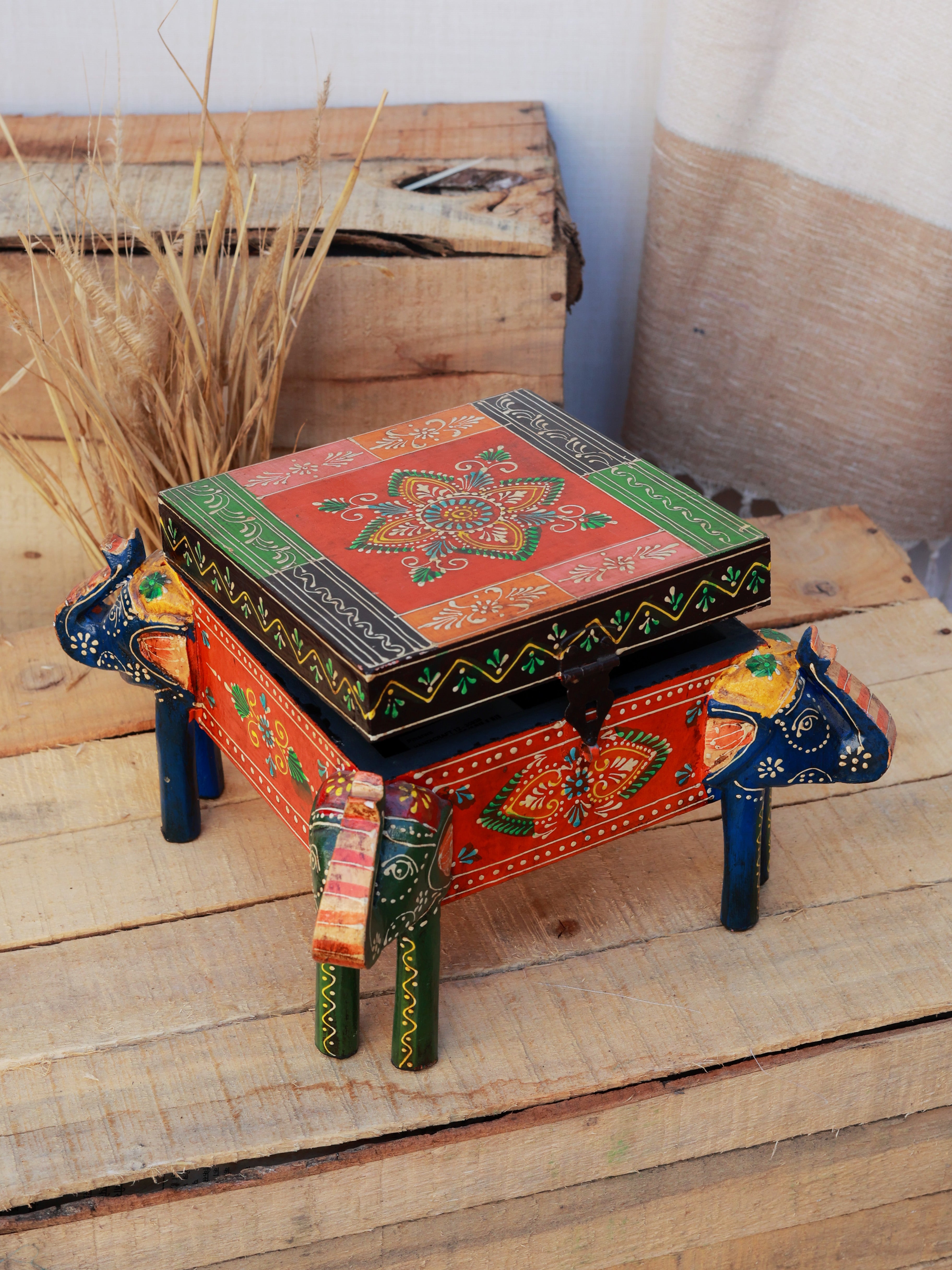 The Rangrez Elephant Mini Treasure Box is a vibrant piece of traditional Indian craftsmanship. Hand-painted with intricate elephant motifs and colorful patterns, this miniature box is perfect for storing small keepsakes, jewelry, or trinkets. Its charming design and sturdy build make it a delightful décor accent for shelves, tabletops, or display corners. A fusion of art and functionality, it brings color, culture, and elegance to any space.