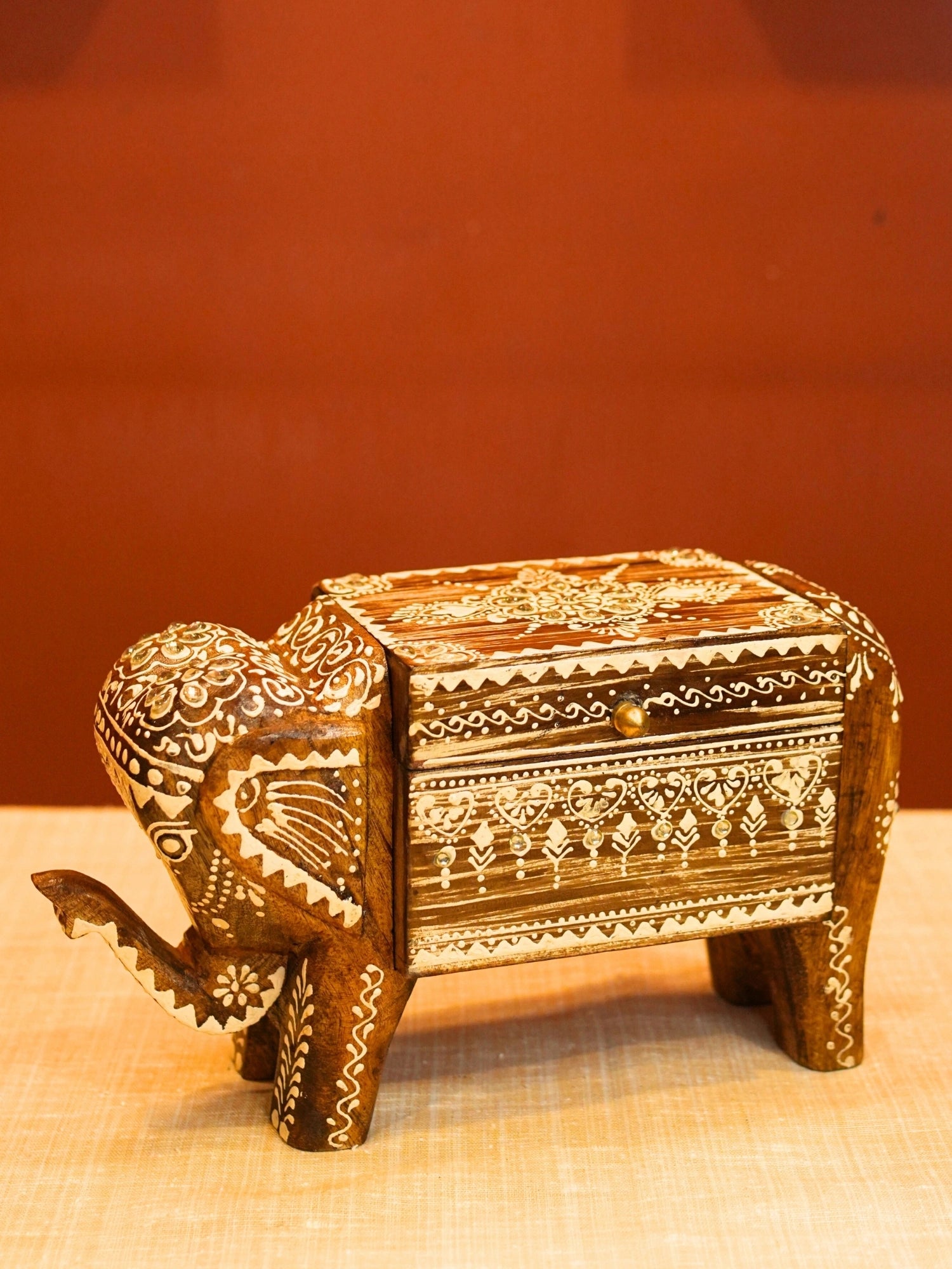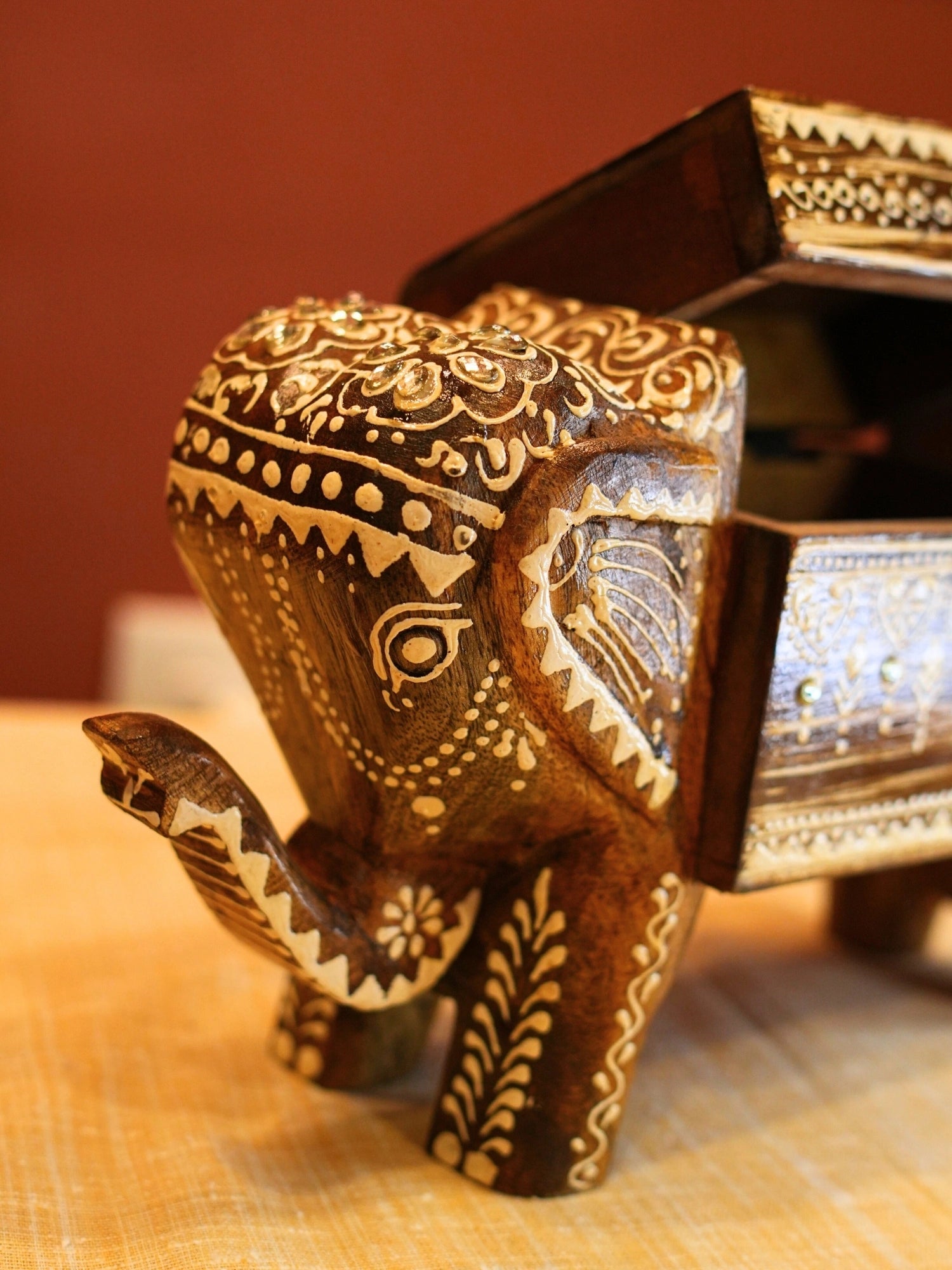 A beautifully hand-painted wooden elephant box, combining artistry with functional storage.