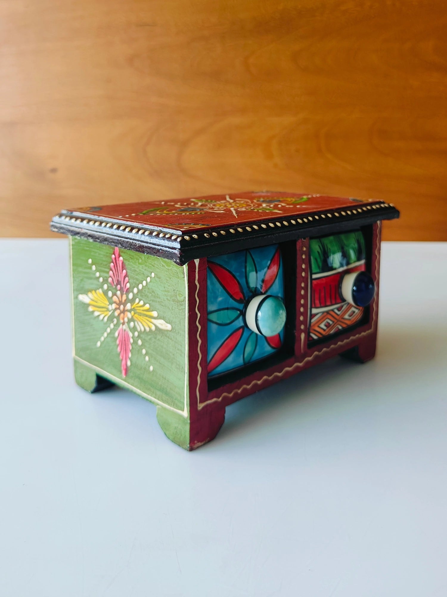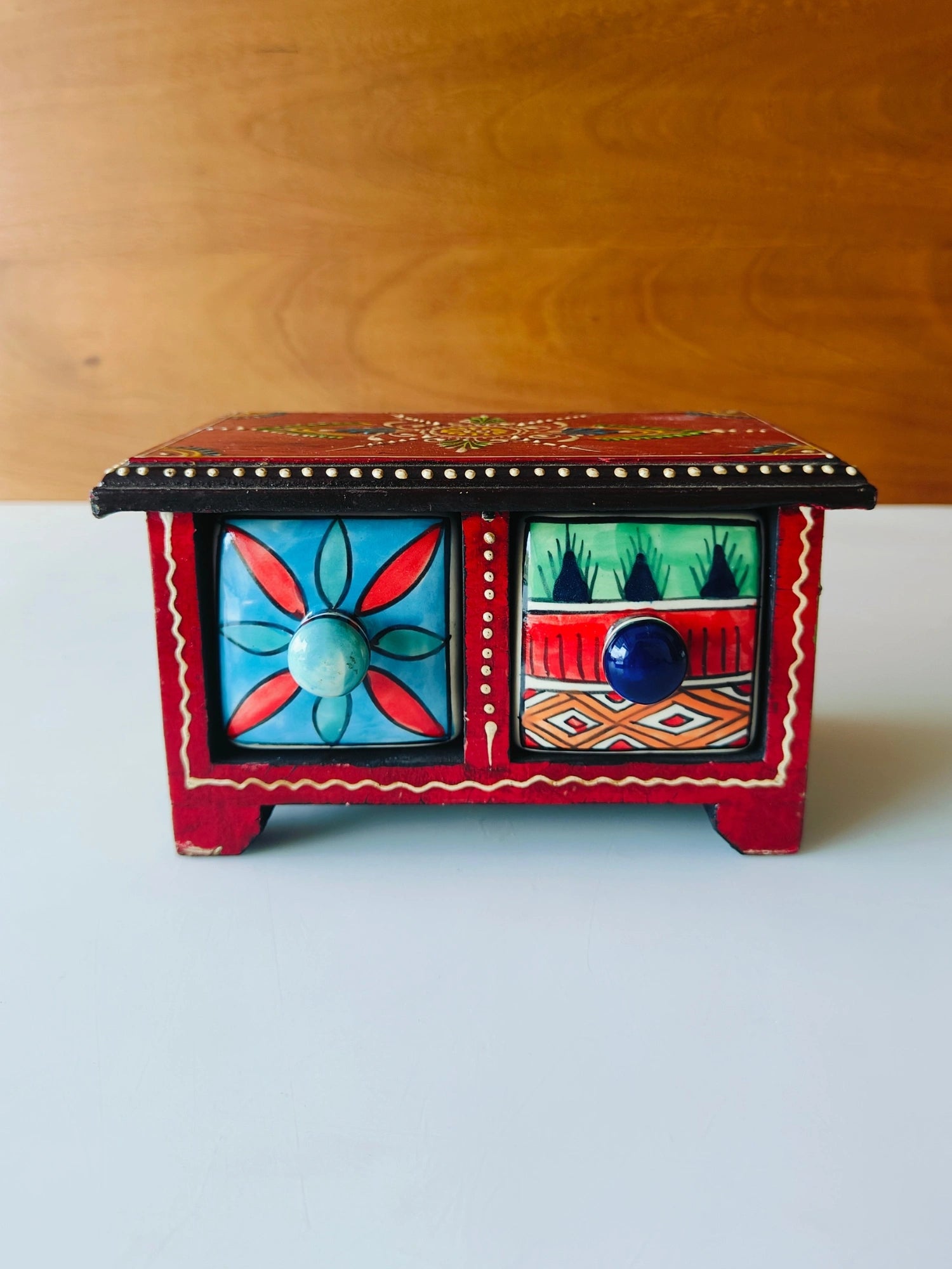 - Handcrafted Design: Hand-painted wood and two unique ceramic drawers with vibrant, intricate detailing.