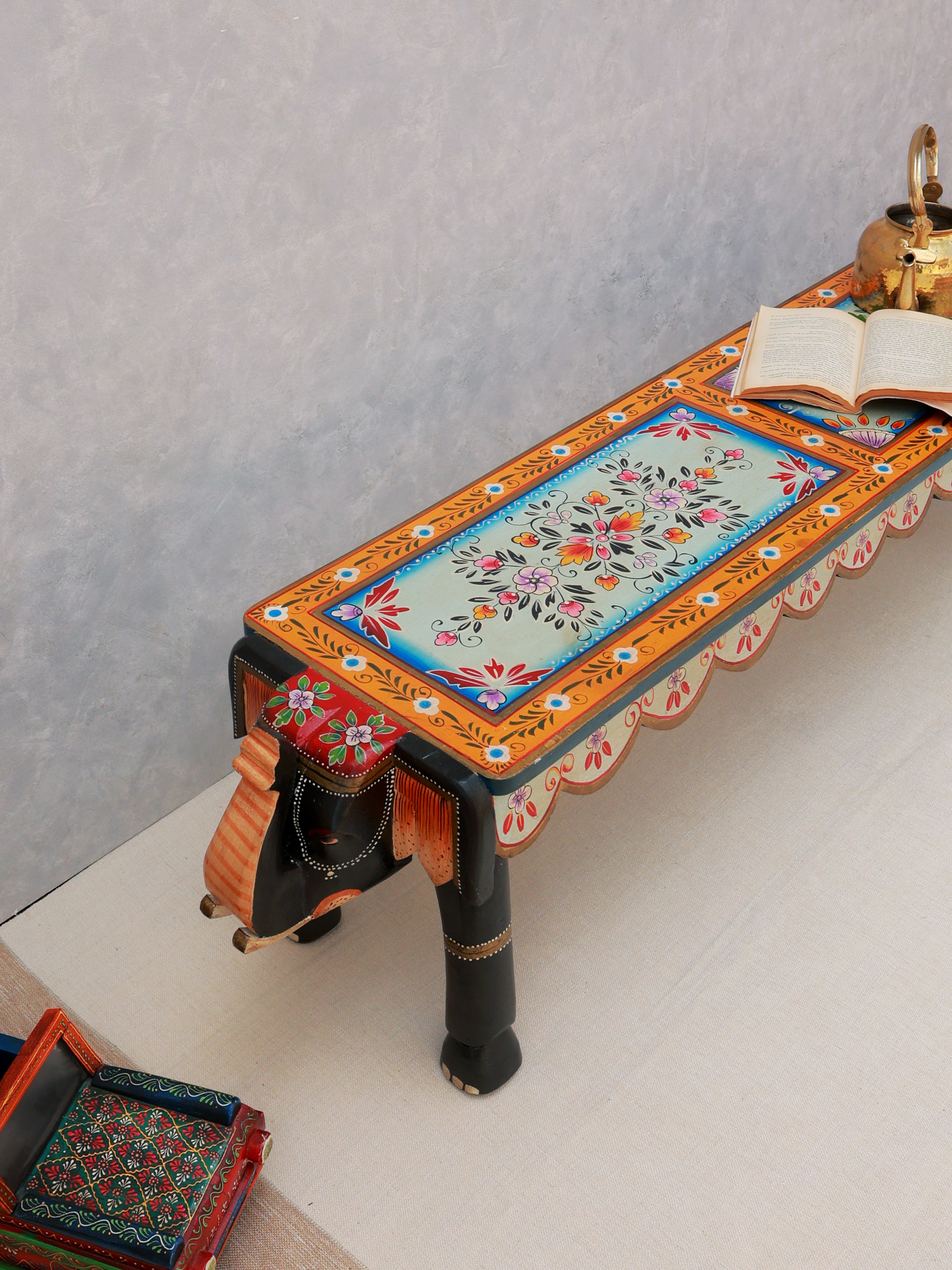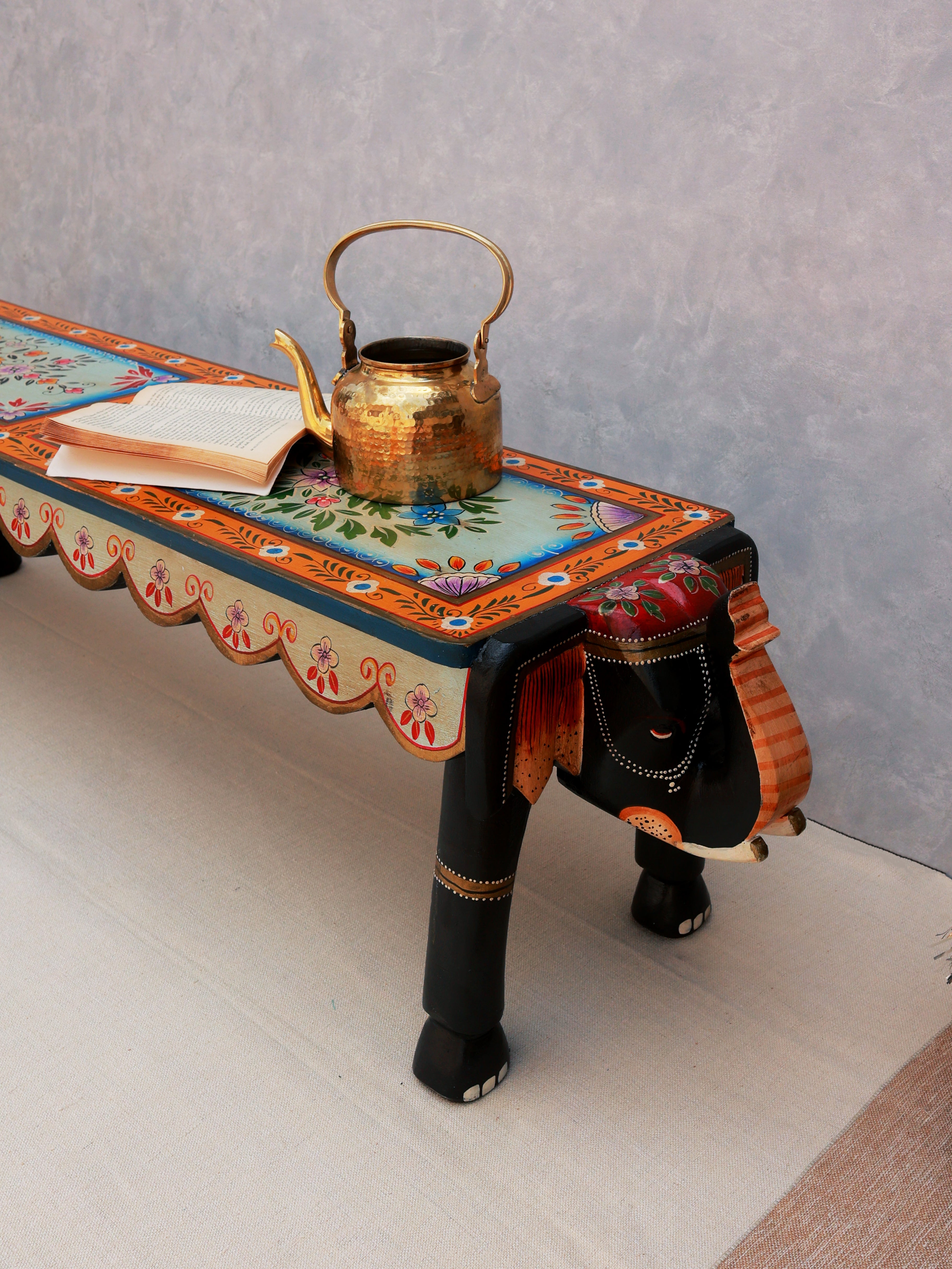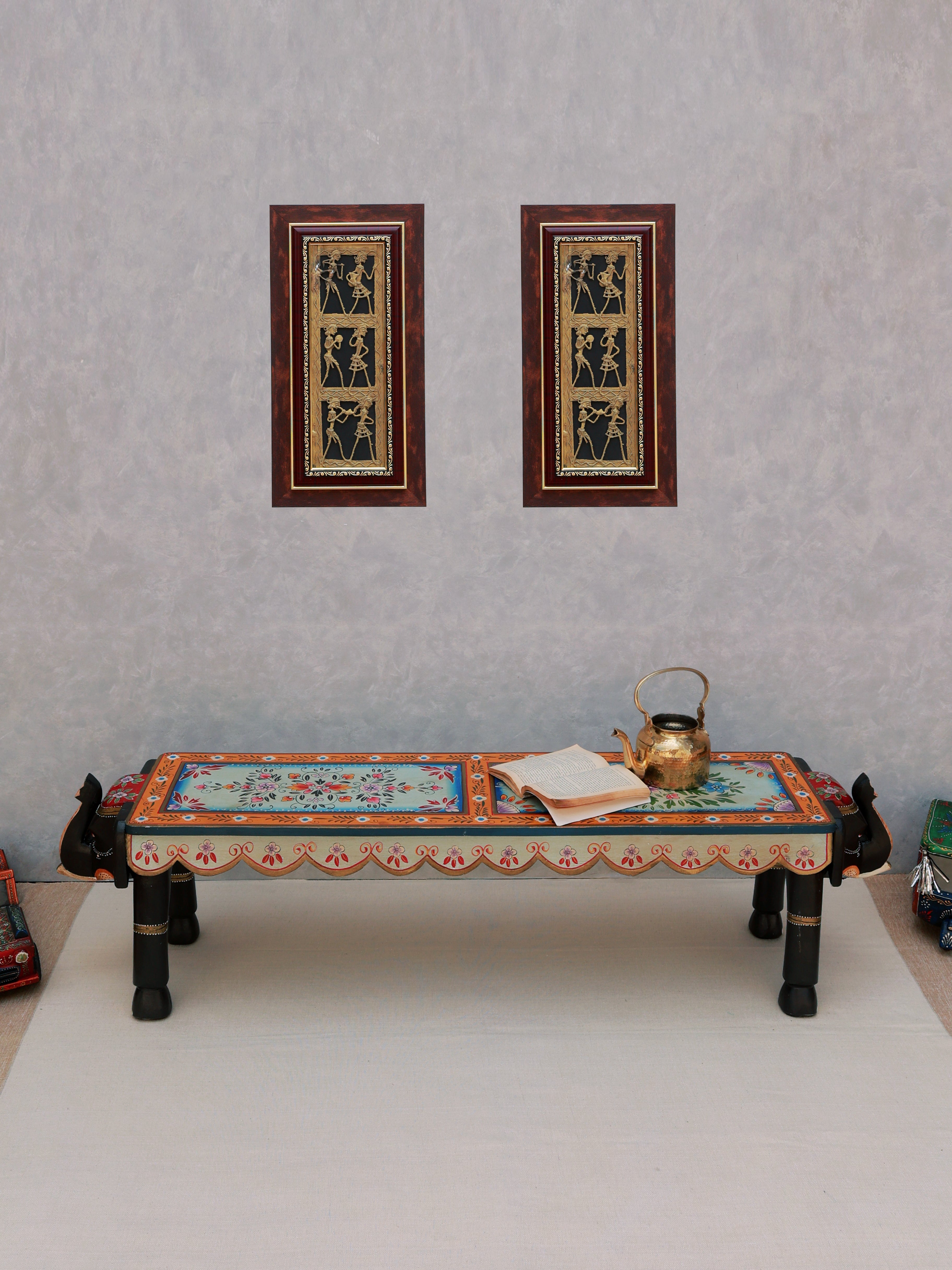 Where Exquisite Craftsmanship Meets Timeless Elegance — this handcrafted three-seater bench captures the essence of Indian artistry with its Pichwai-inspired detailing. Adorned with intricate hand-carved wooden elements, it stands as a testament to heritage, tradition, and refined design, adding a touch of regal charm to any space.
