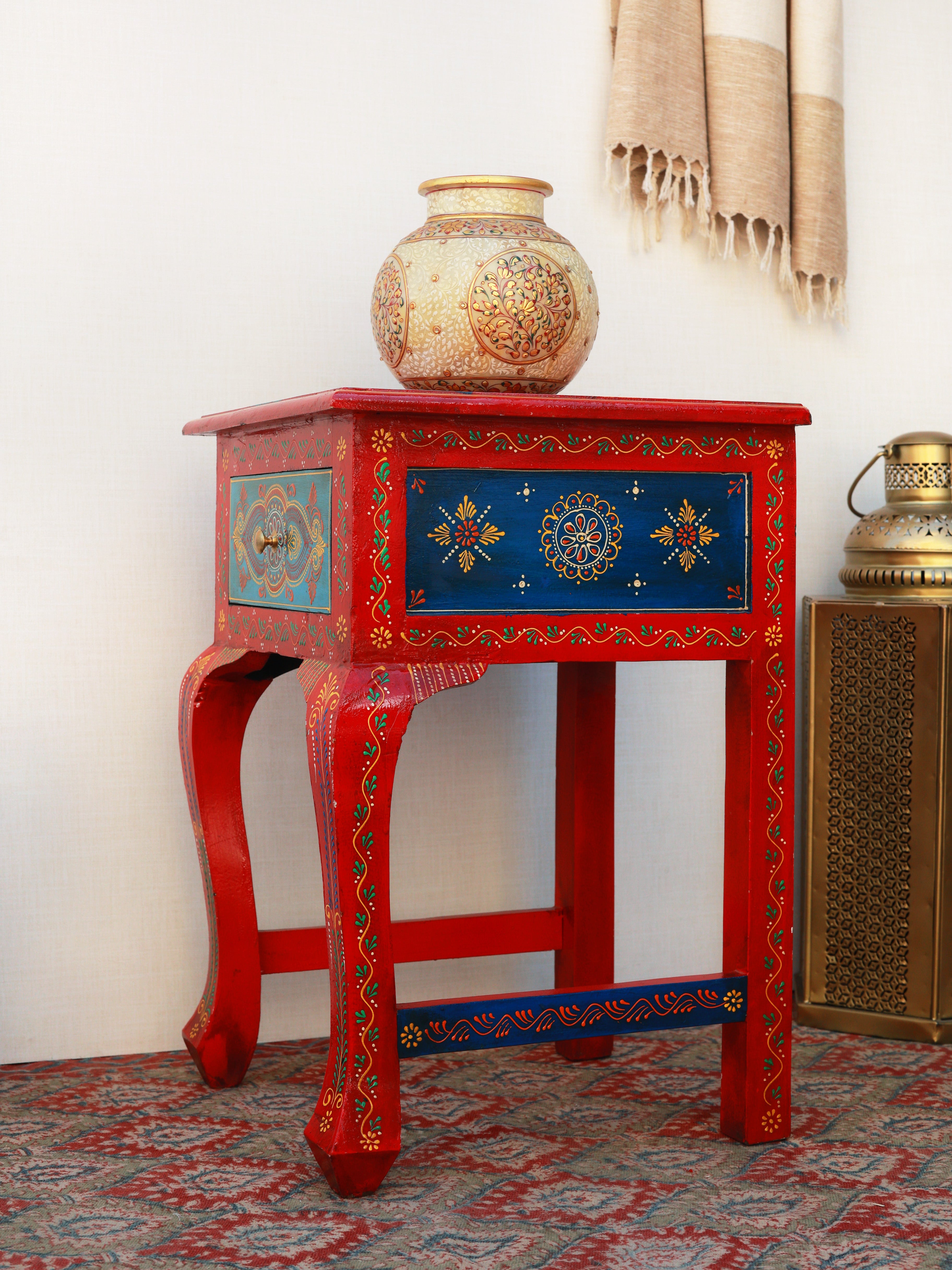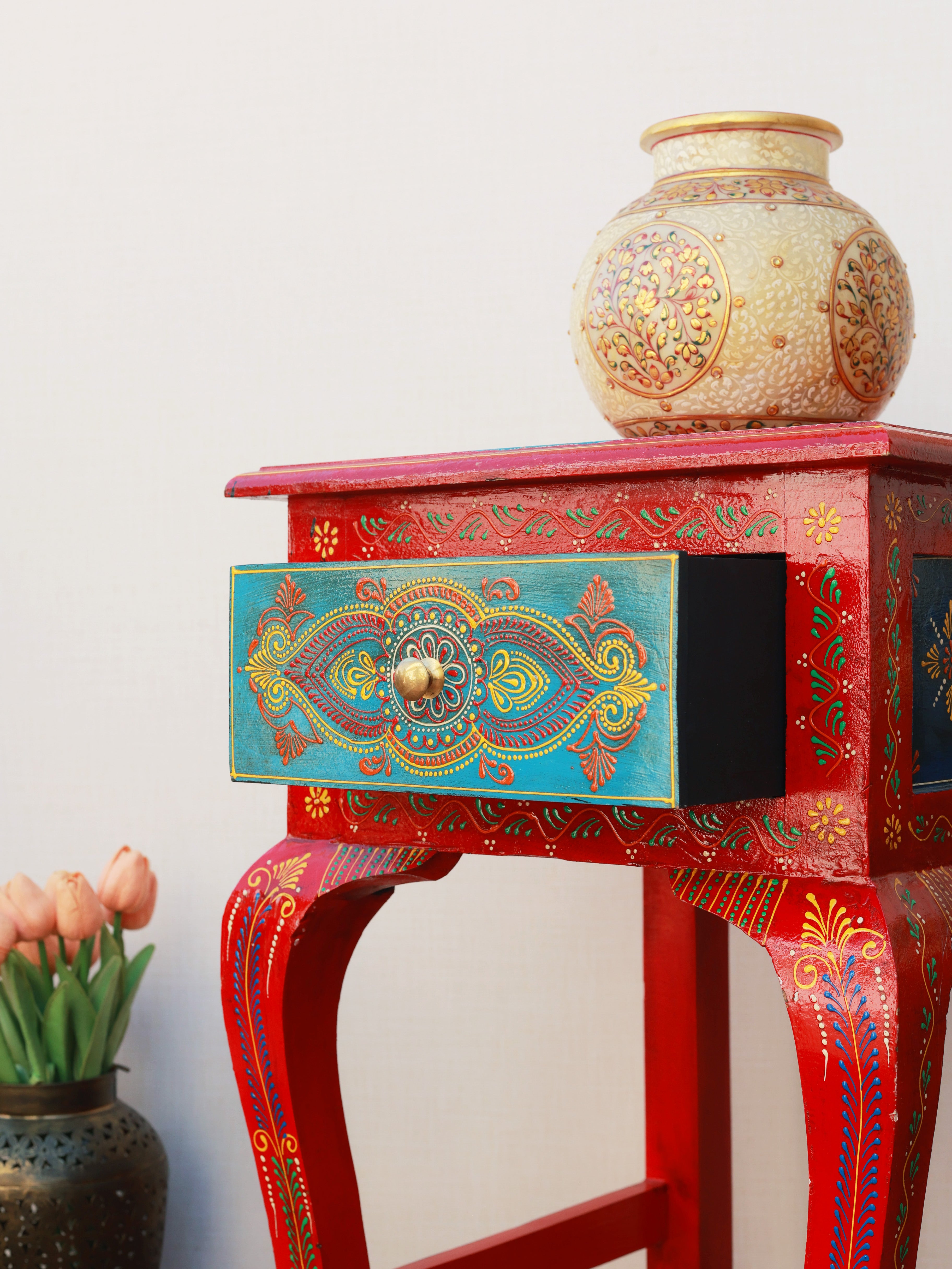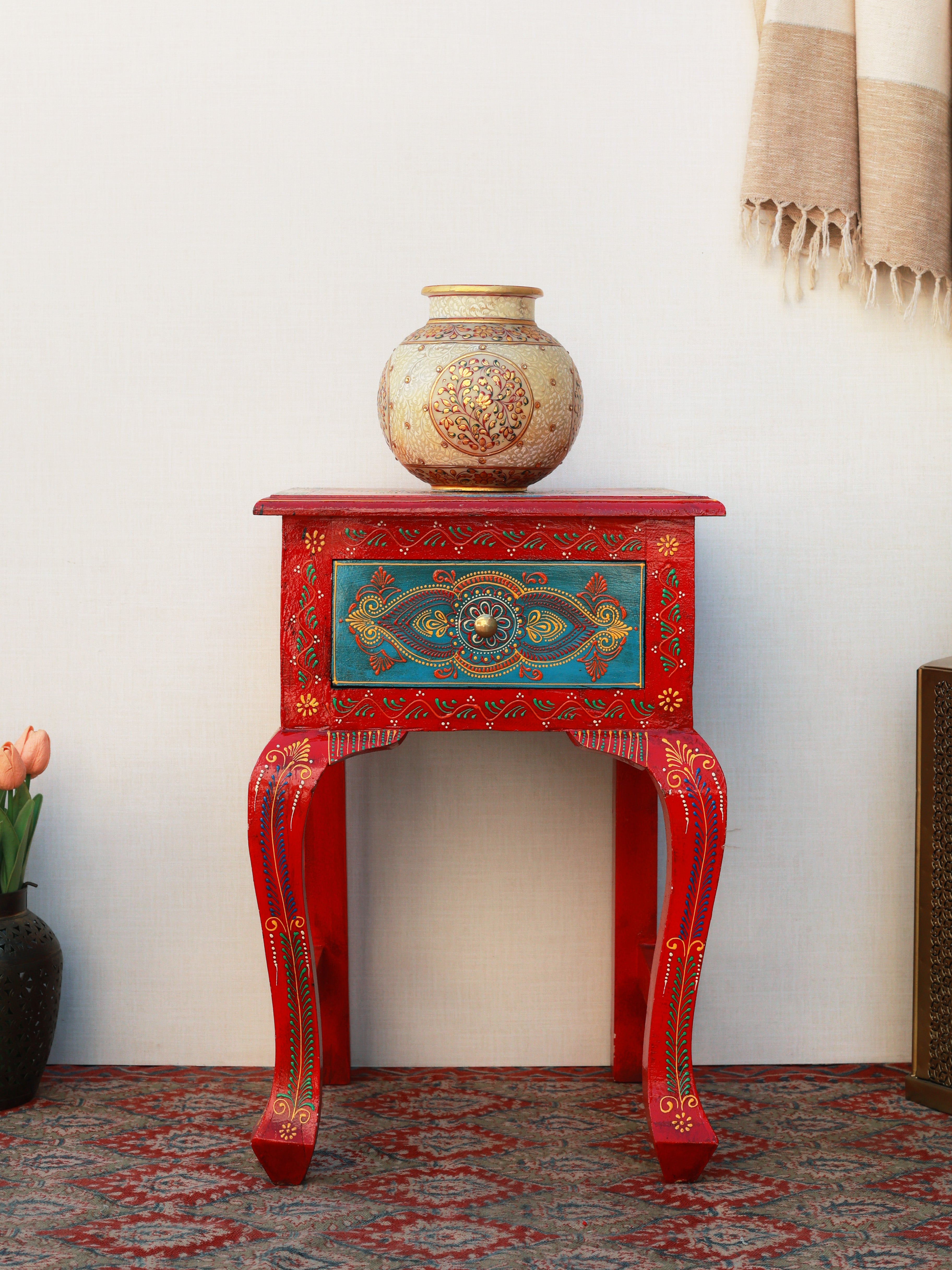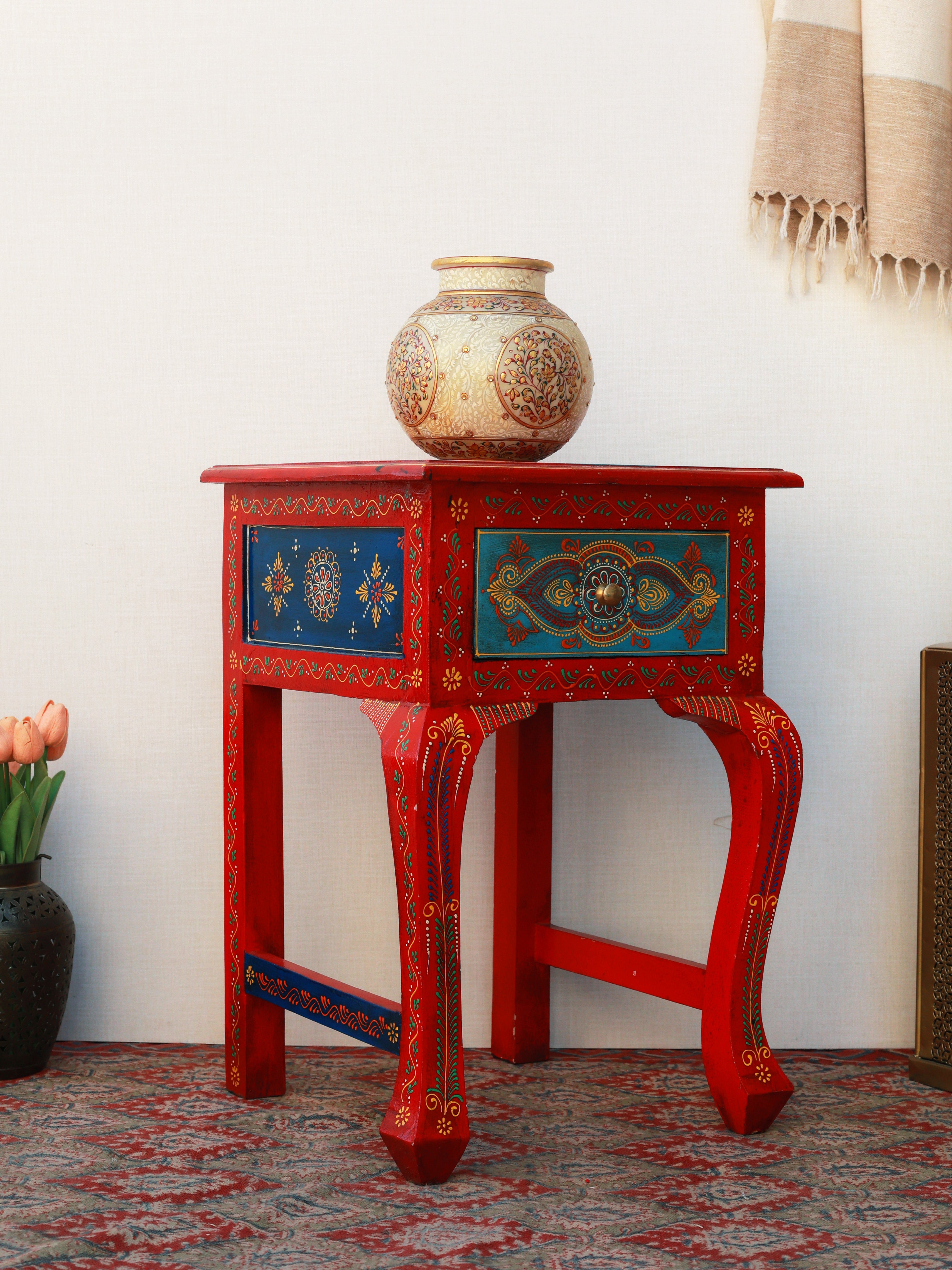 The Regal Rouge Hand-Painted Side Table is a stunning blend of artistry and heritage craftsmanship. Adorned with intricate motifs and vibrant colors, it instantly elevates any space with its royal charm. The beautifully contoured legs and detailed drawer front reflect meticulous handwork, making it both functional and decorative. Perfect as an accent table or bedside piece, it brings a luxurious, ethnic-inspired elegance to your home décor.