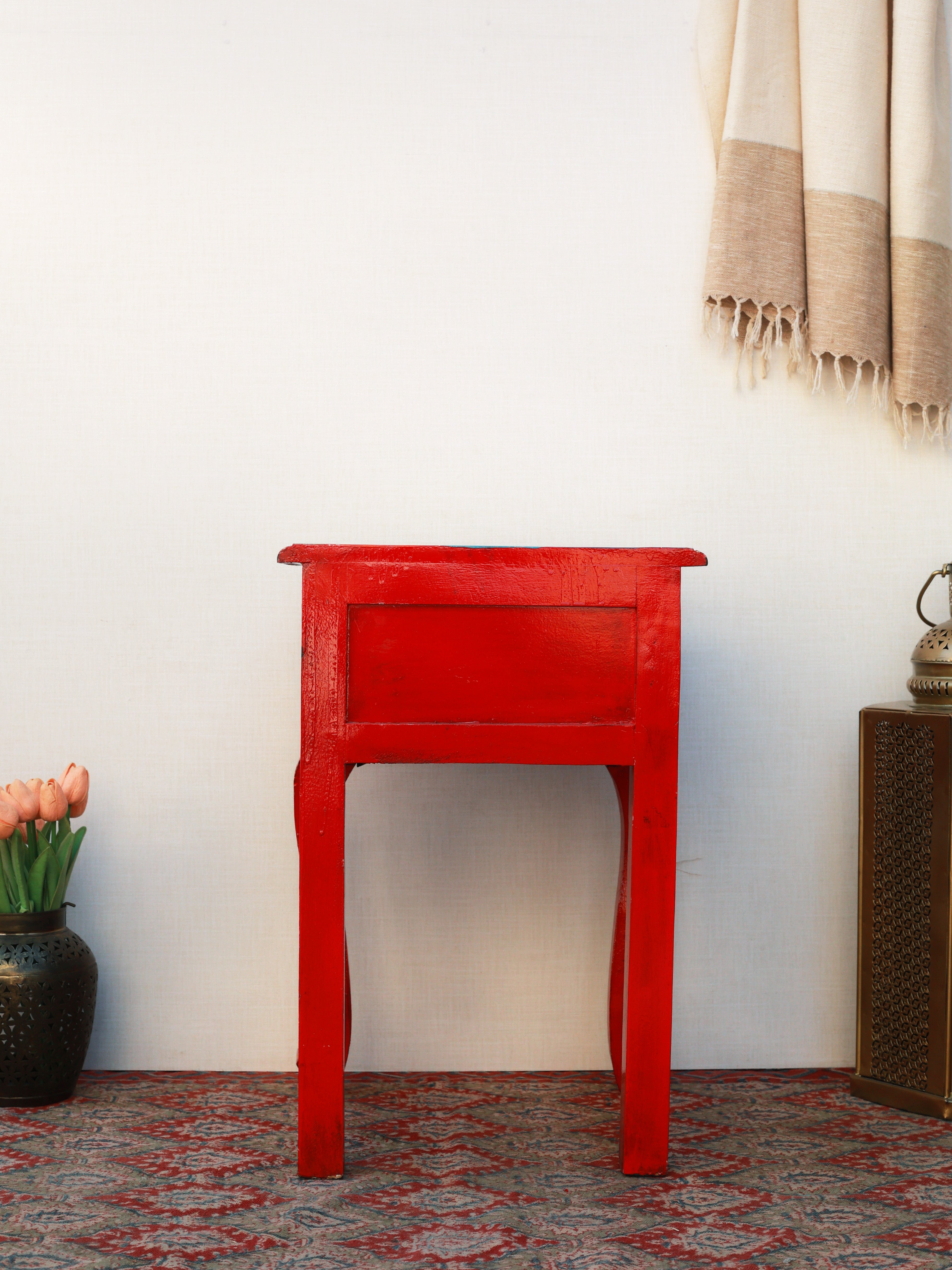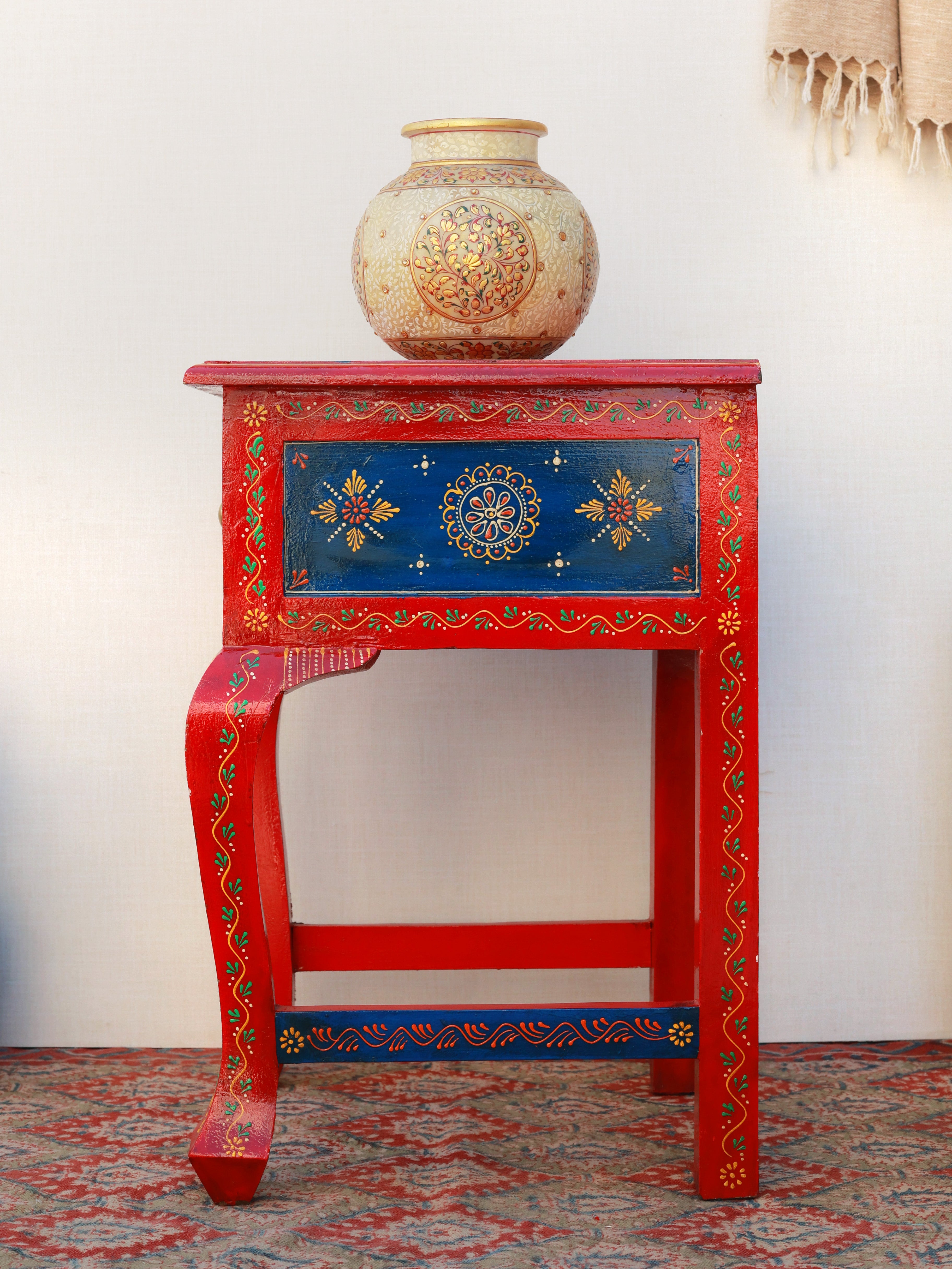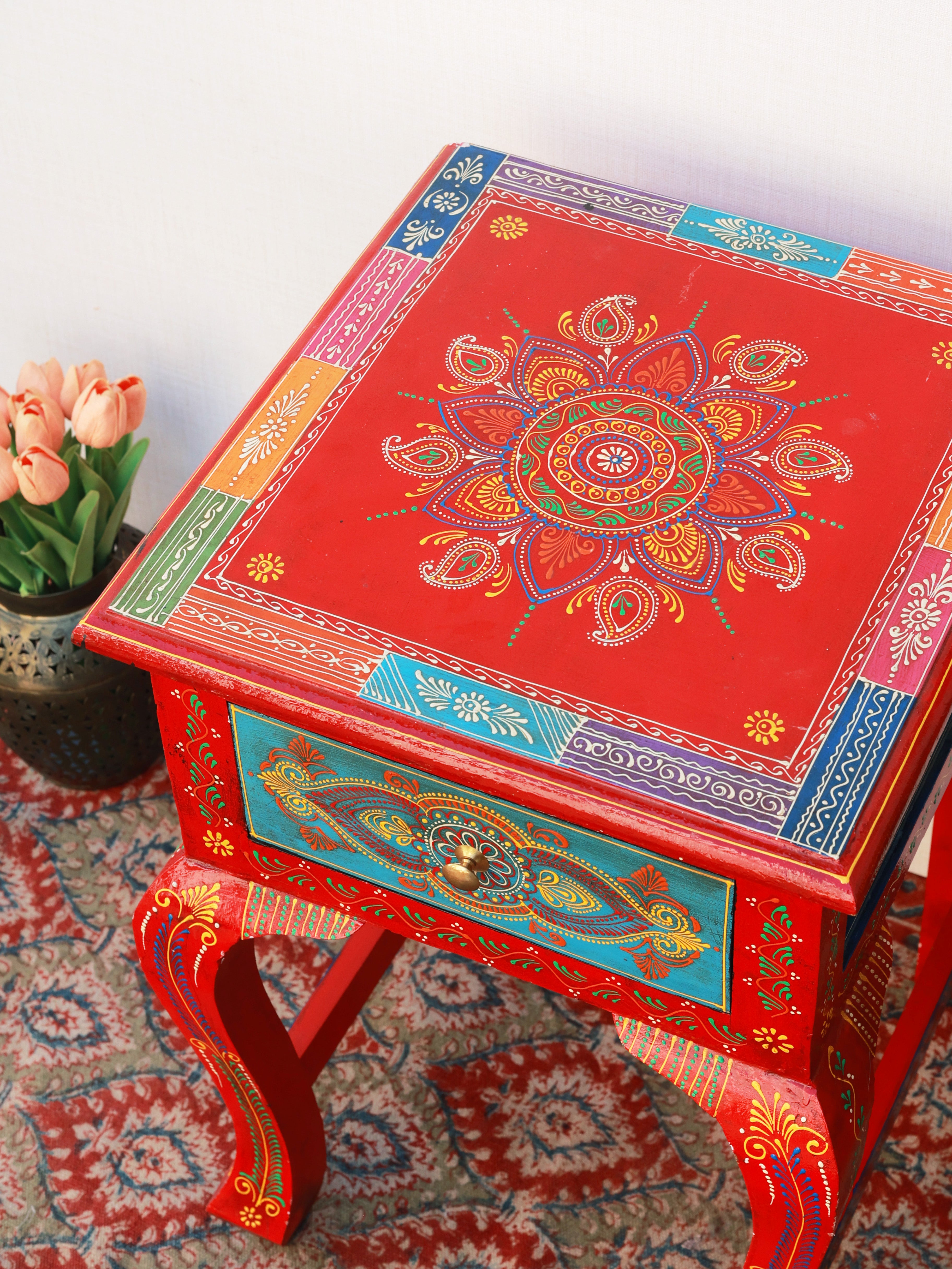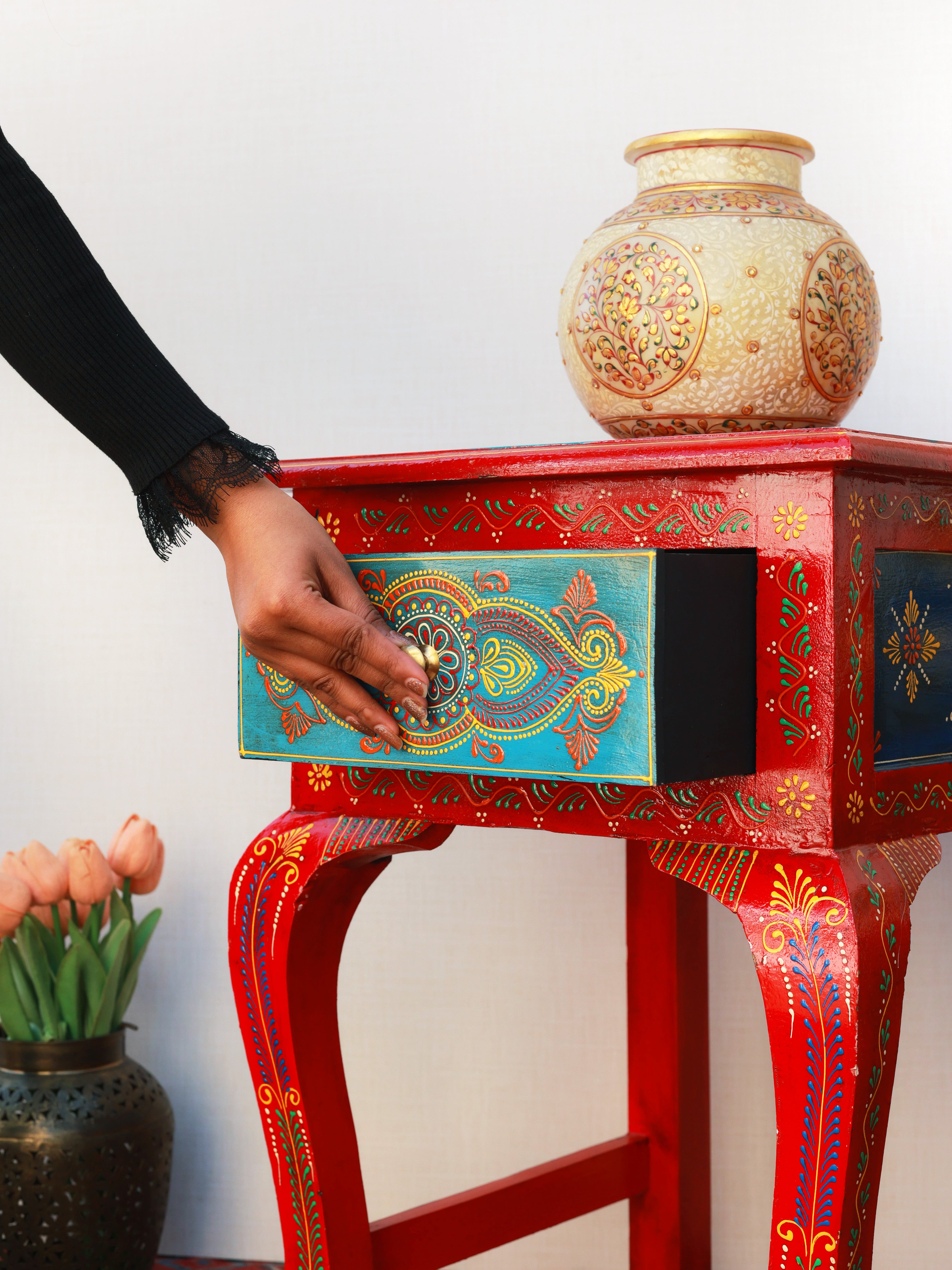The Regal Rouge Hand-Painted Side Table is a stunning blend of artistry and heritage craftsmanship. Adorned with intricate motifs and vibrant colors, it instantly elevates any space with its royal charm. The beautifully contoured legs and detailed drawer front reflect meticulous handwork, making it both functional and decorative. Perfect as an accent table or bedside piece, it brings a luxurious, ethnic-inspired elegance to your home décor.