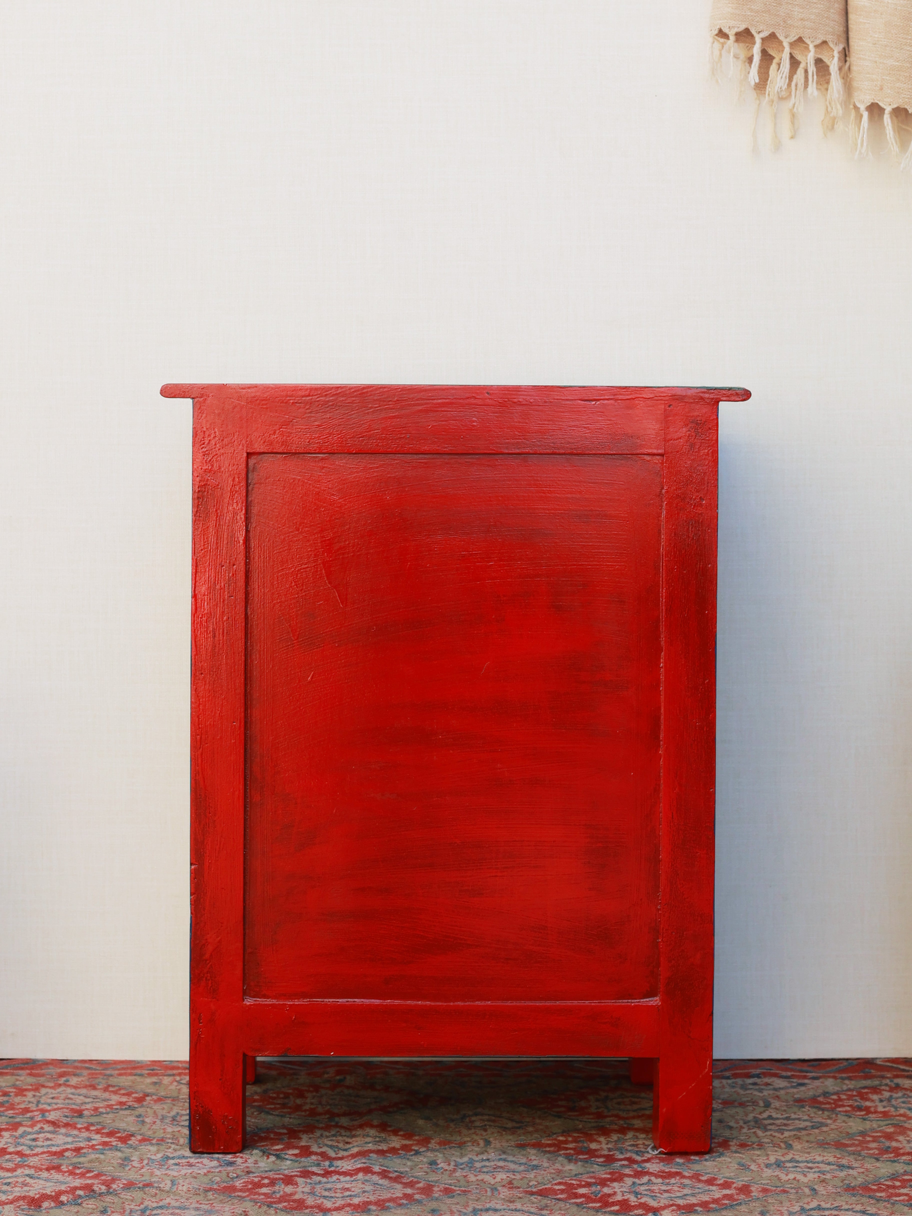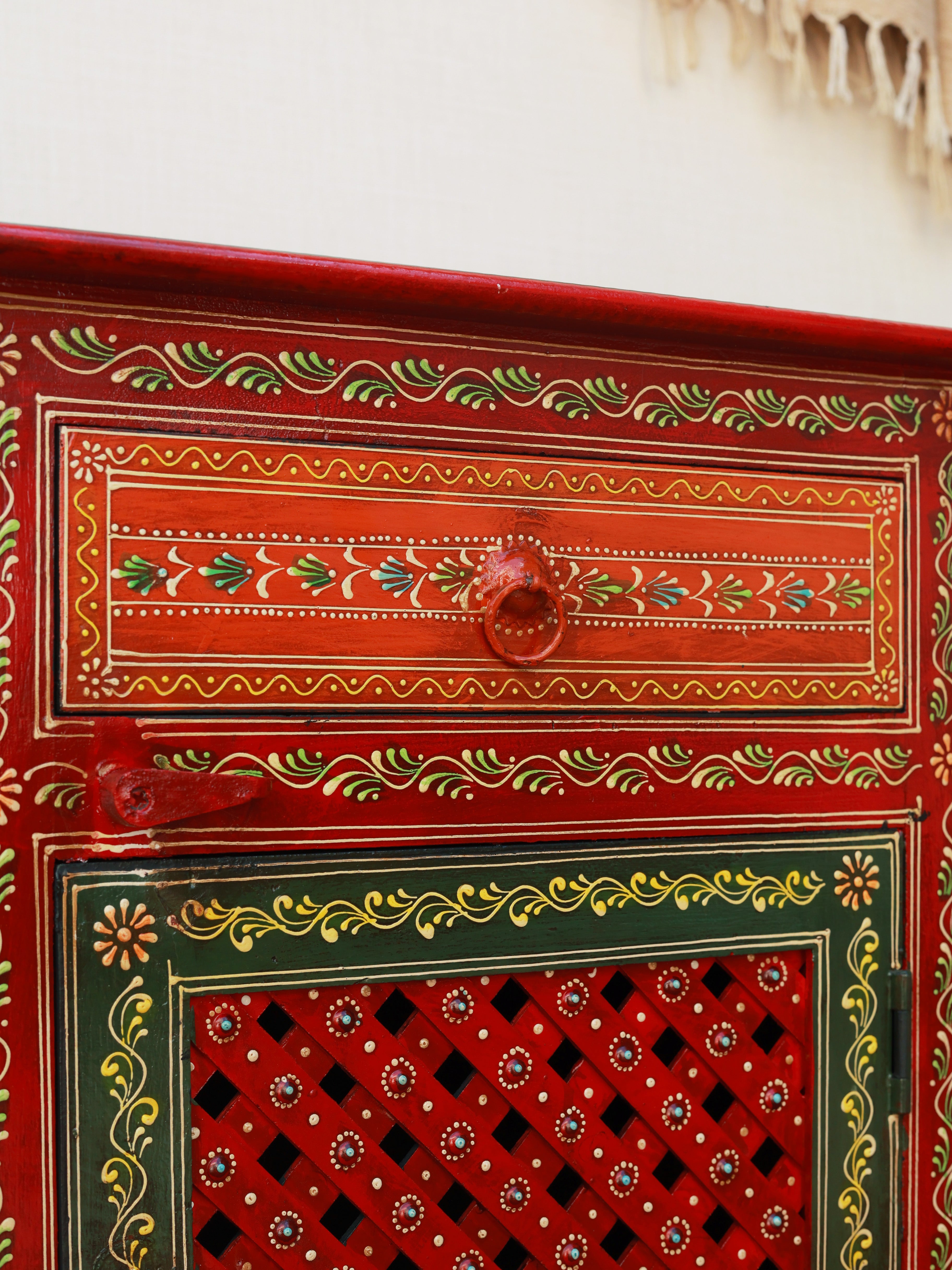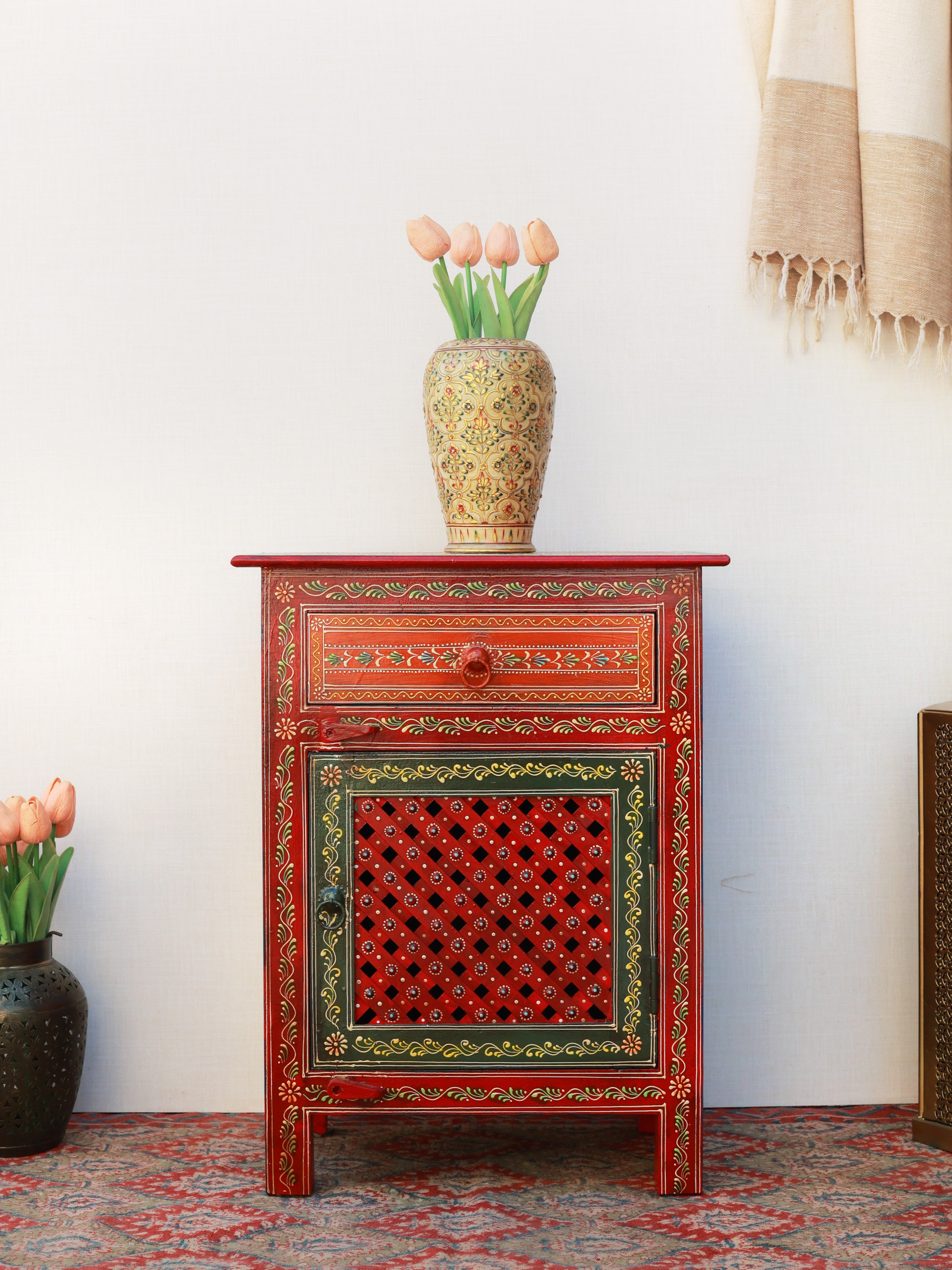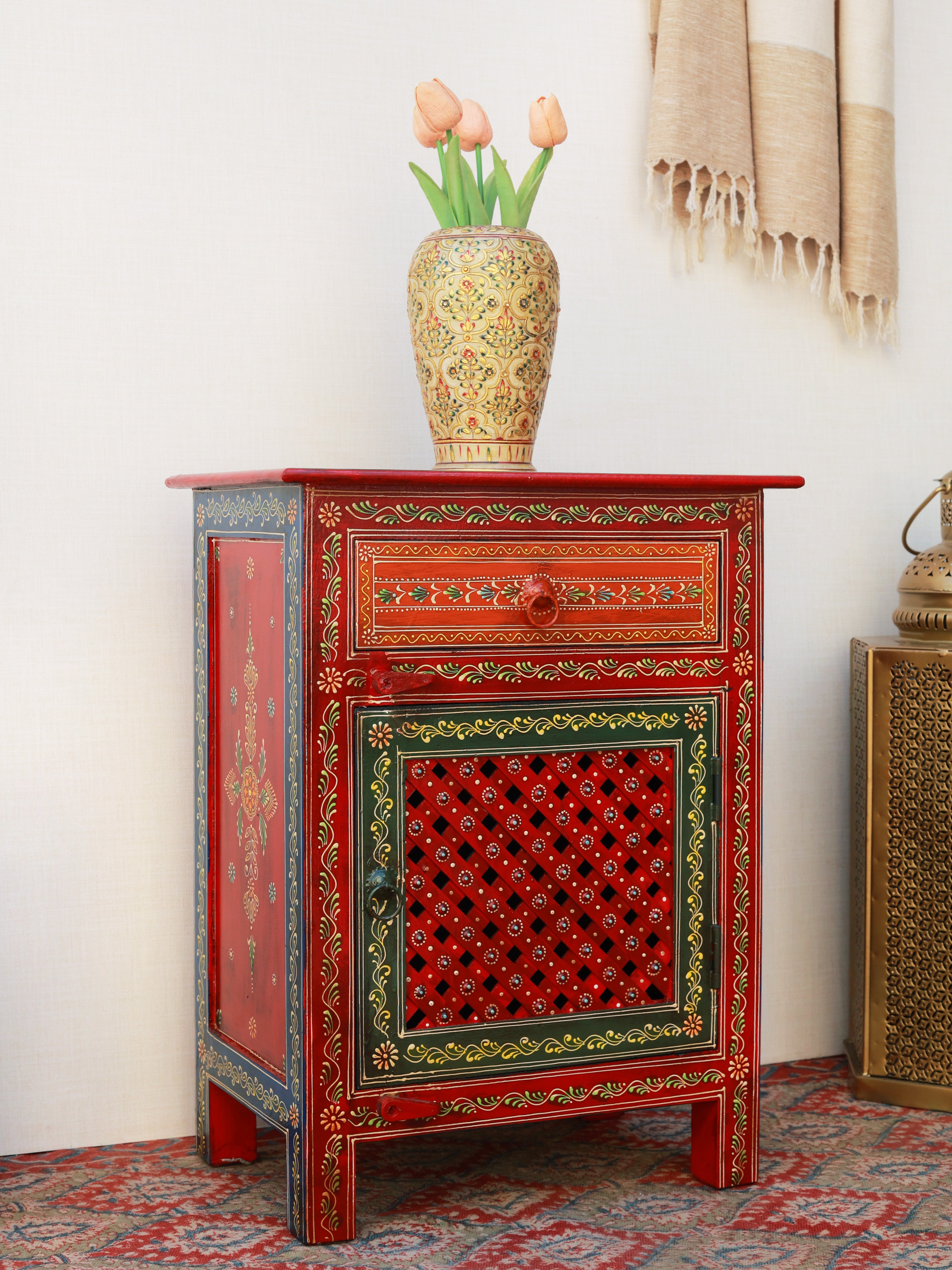 The Mughal Mosaic Bedside Cabinet is a stunning fusion of traditional artistry and functional design. Hand-painted with intricate Mughal-inspired motifs, it features a beautifully detailed drawer and a lattice-patterned door that adds depth and character. Crafted in rich, warm tones, this cabinet brings cultural elegance to any space while offering convenient bedside storage. A perfect statement piece to elevate classic, eclectic, or contemporary interiors.