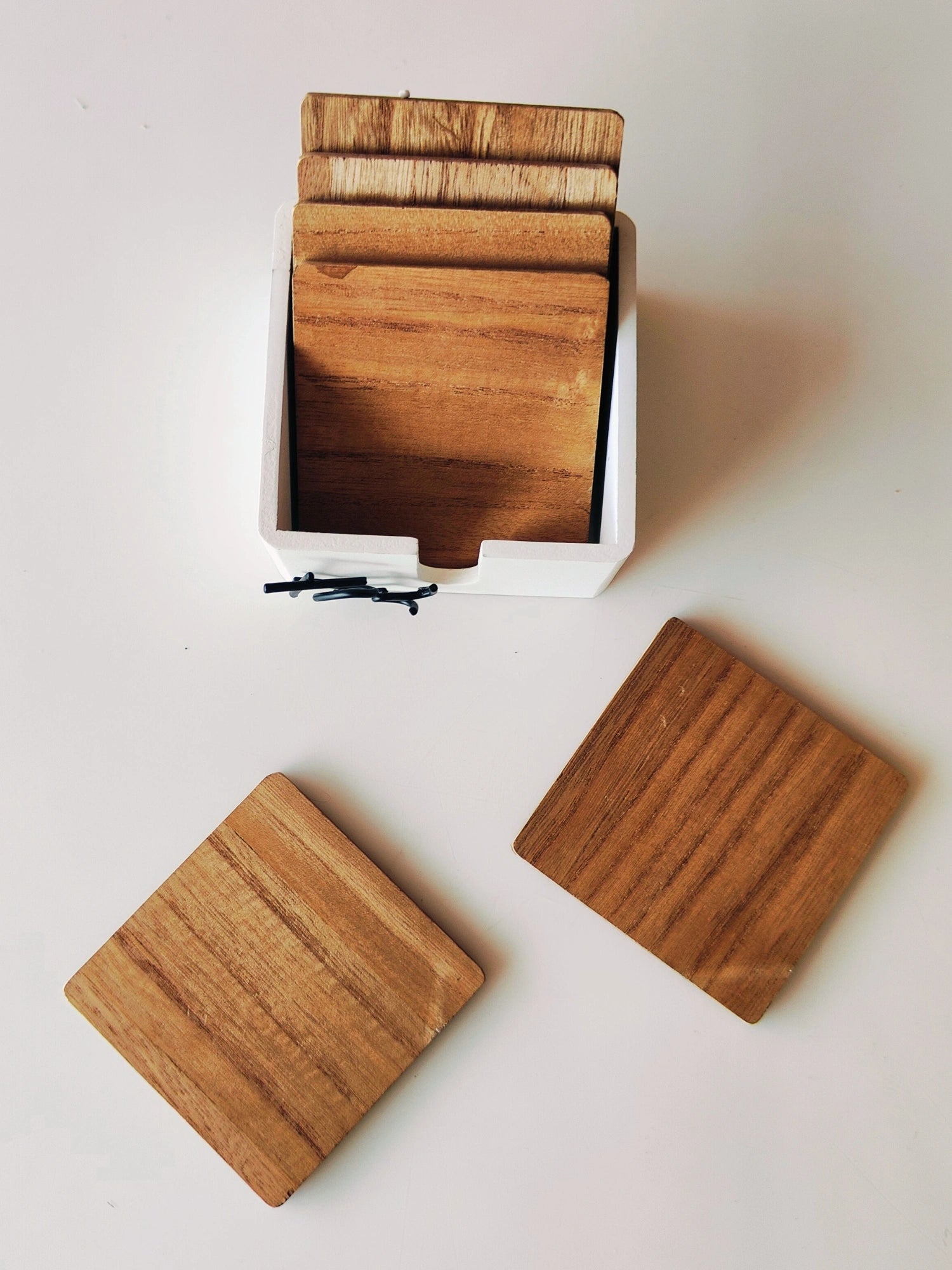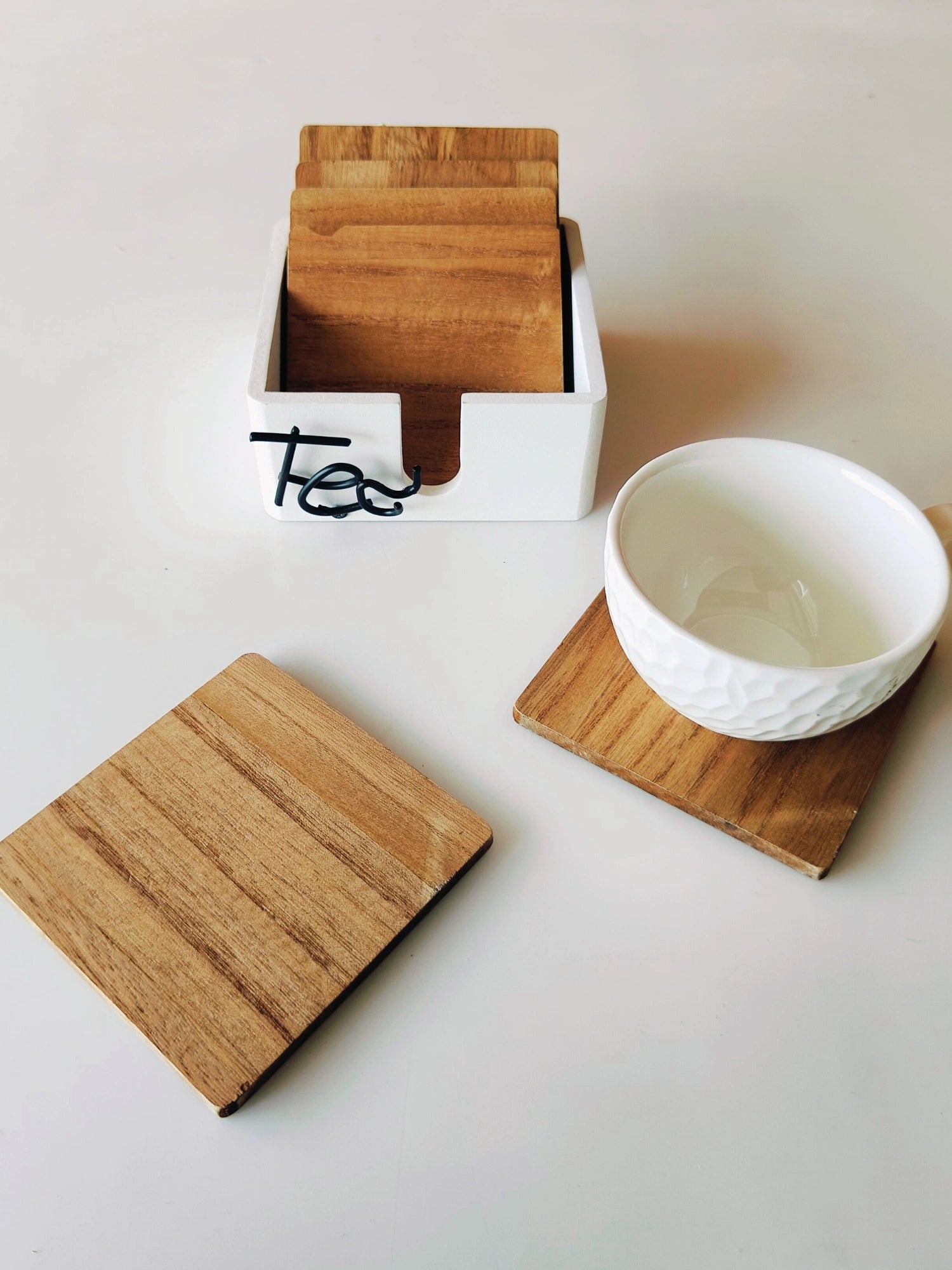 This wooden coaster set adds a warm, modern touch to any space. Each coaster features a smooth natural finish and fits neatly into a sleek white holder accented with a playful black wire “Tea” label. Perfect for protecting surfaces from heat and moisture, this stylish set keeps your tabletop organized while enhancing your kitchen, dining area, or coffee nook with simple, functional charm.