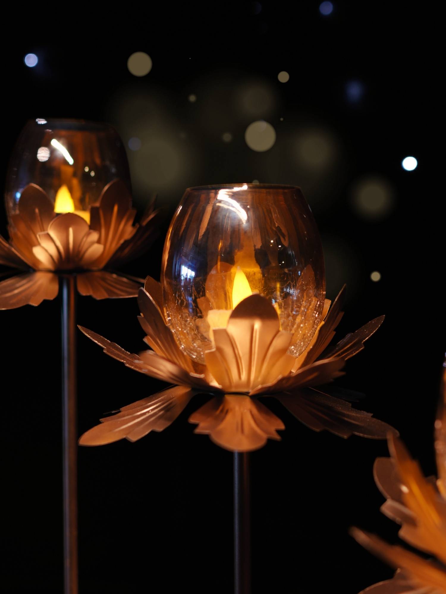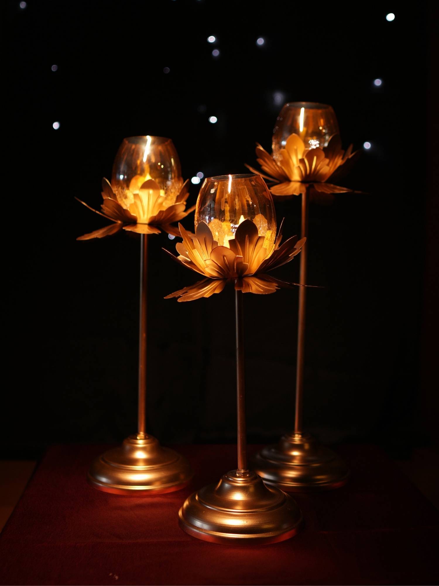 These exquisite Golden Lotus Polish Brass Candle Stands are a perfect addition to any home or special occasion. Crafted with intricate lotus flower designs, these stands add a touch of sophistication and warmth to your decor