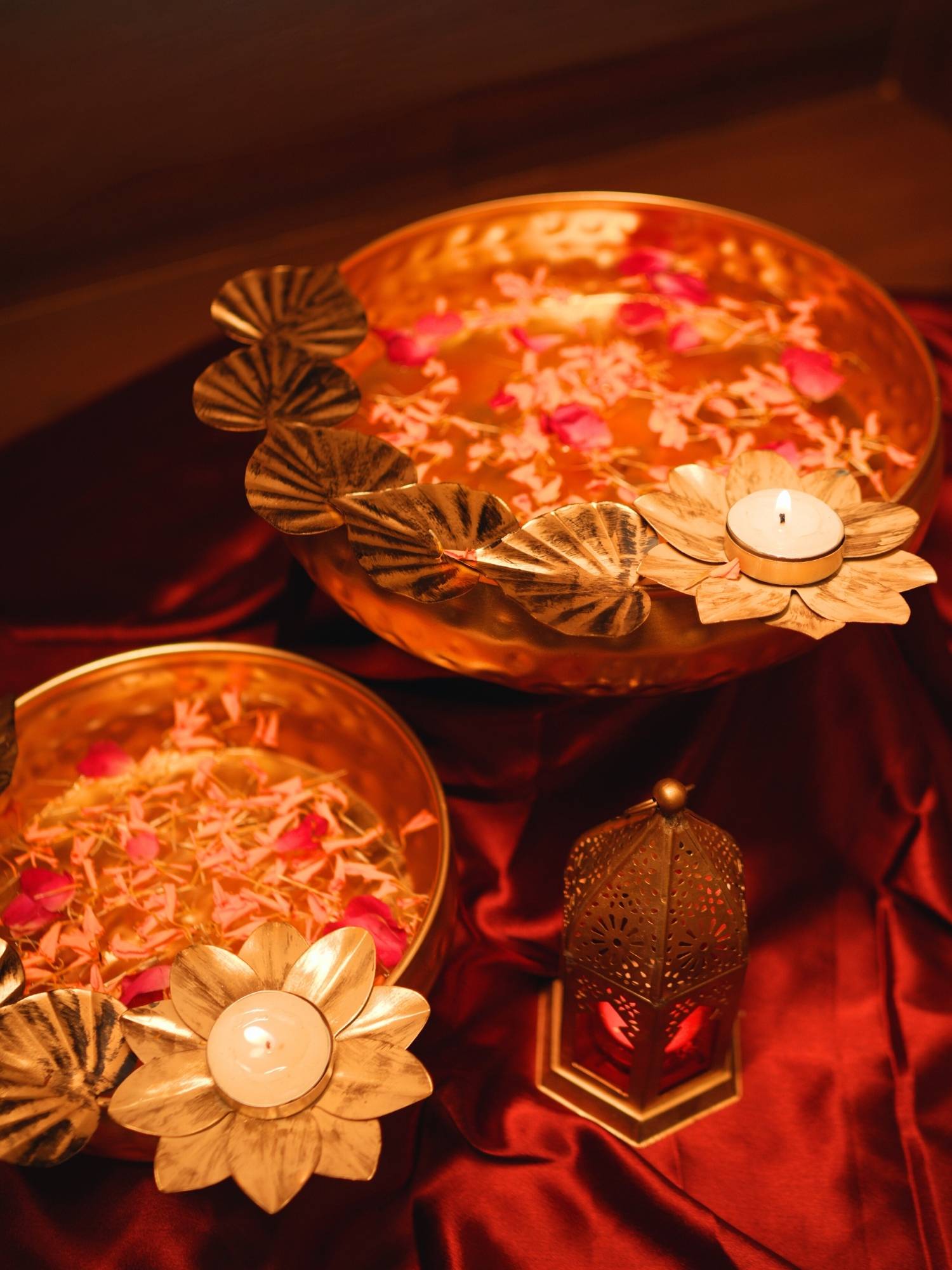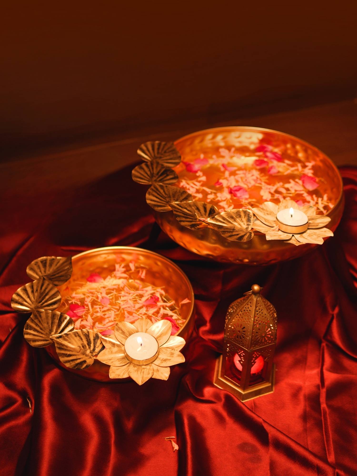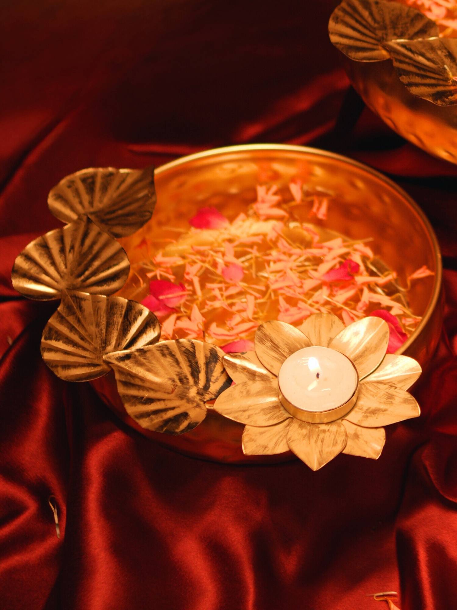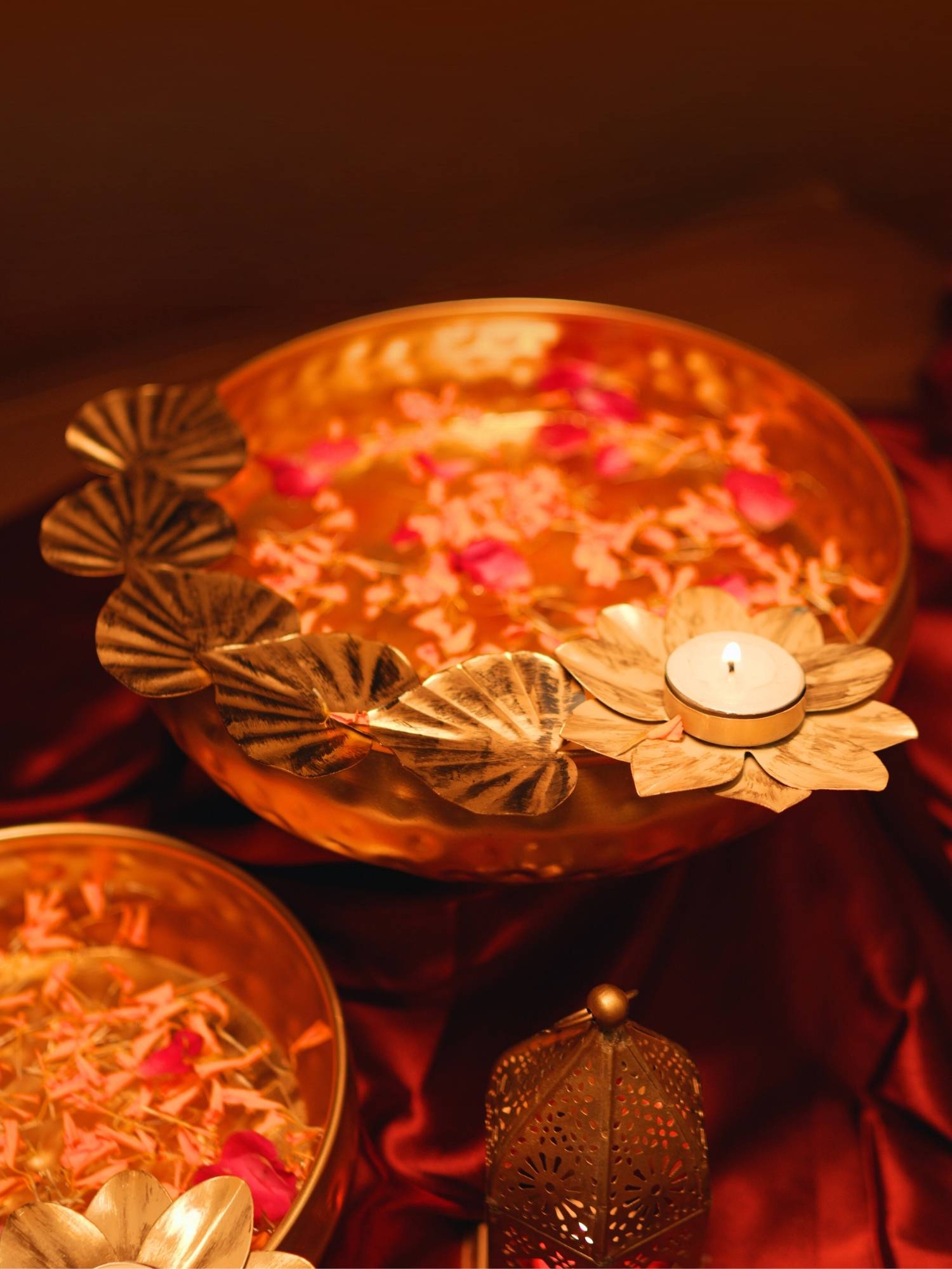 Elevate Your Decor with Exquisite Craftsmanship our handcrafted brass Urli bowls are a testament to the beauty of traditional Indian artistry. Each bowl is meticulously crafted with intricate details, ensuring a unique and visually captivating piece. The lotus leaf-inspired accents add a touch of nature and serenity to your space.