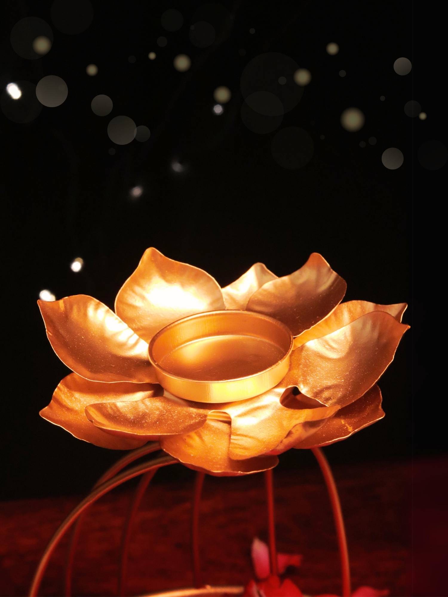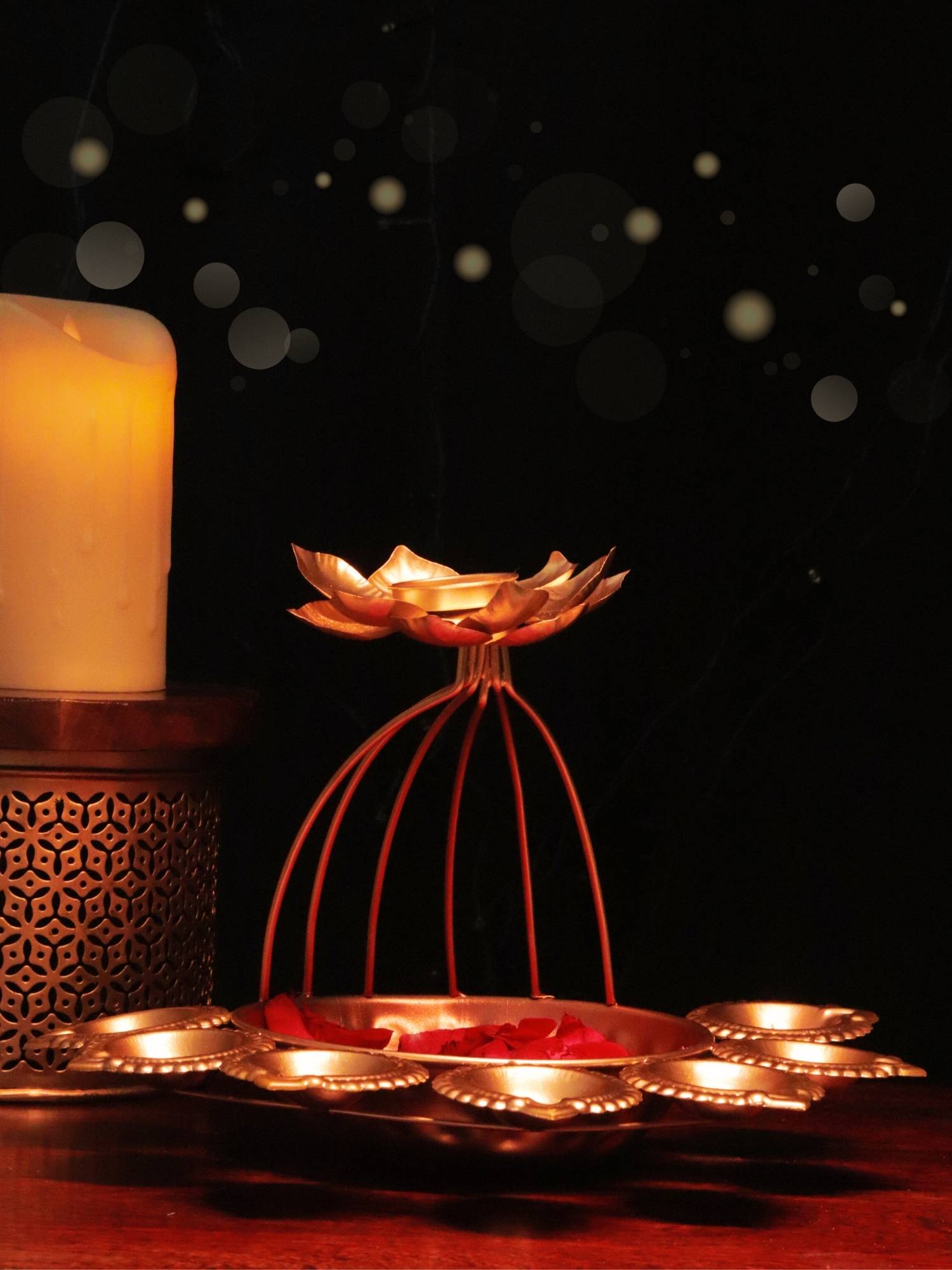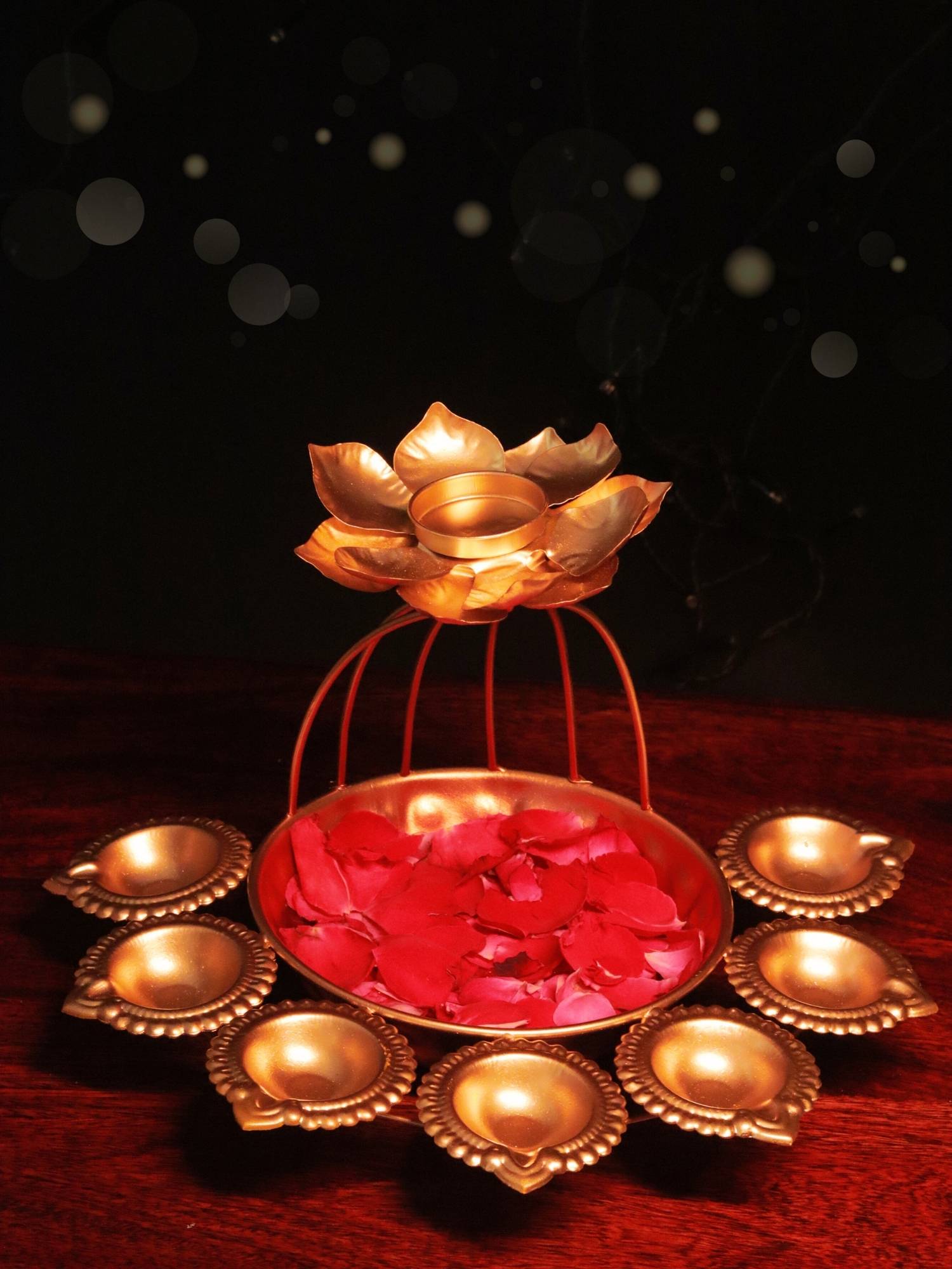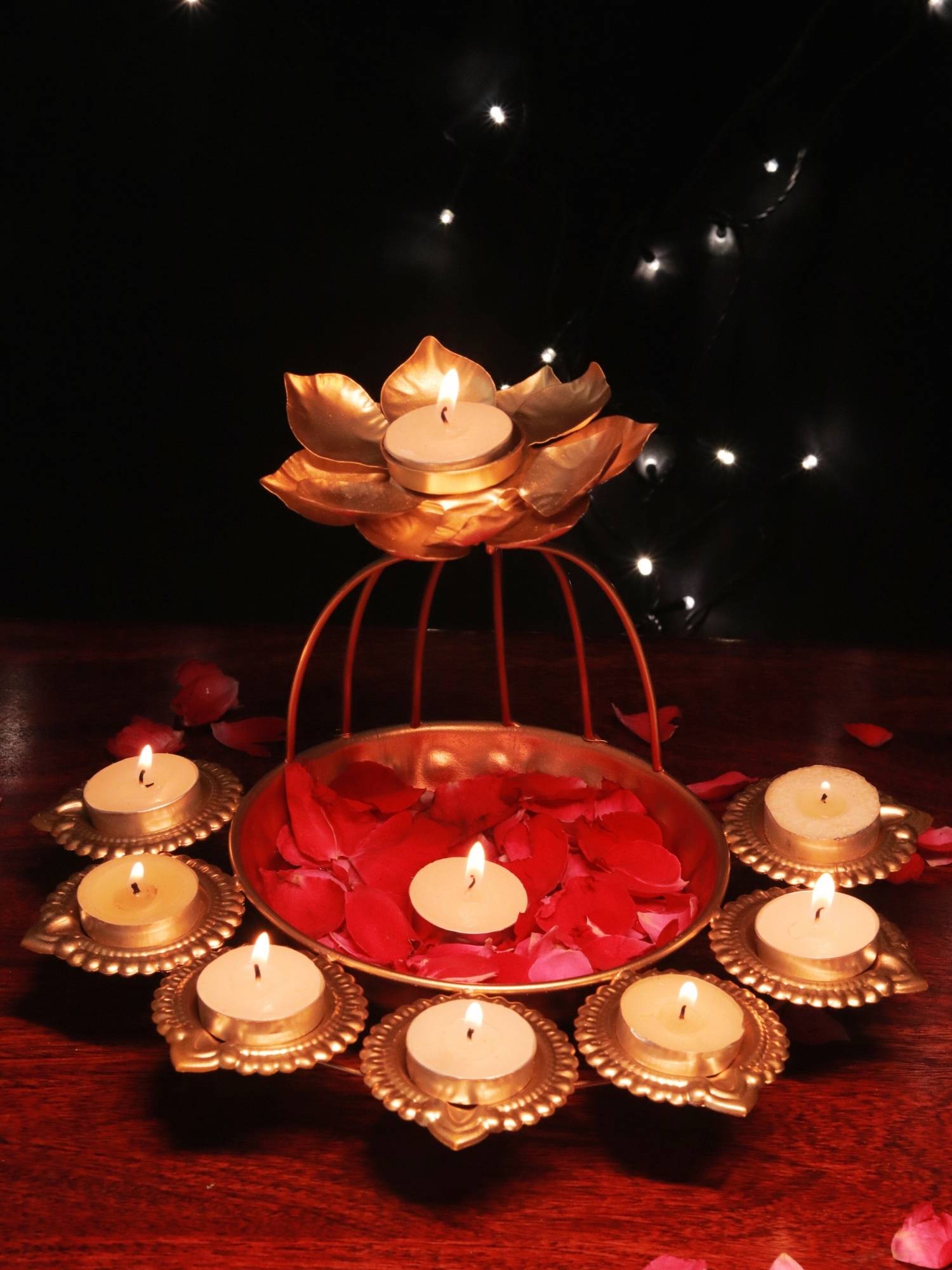 Elevate Your Diwali Decor with This Exquisite Urli celebrate the Festival of Lights with this stunning brass urli, a handcrafted masterpiece that adds a touch of elegance and tradition to your home. The intricate design features a lotus-shaped tealight holder that sits top a curved stand, surrounded by a circular arrangement of smaller diya holders.