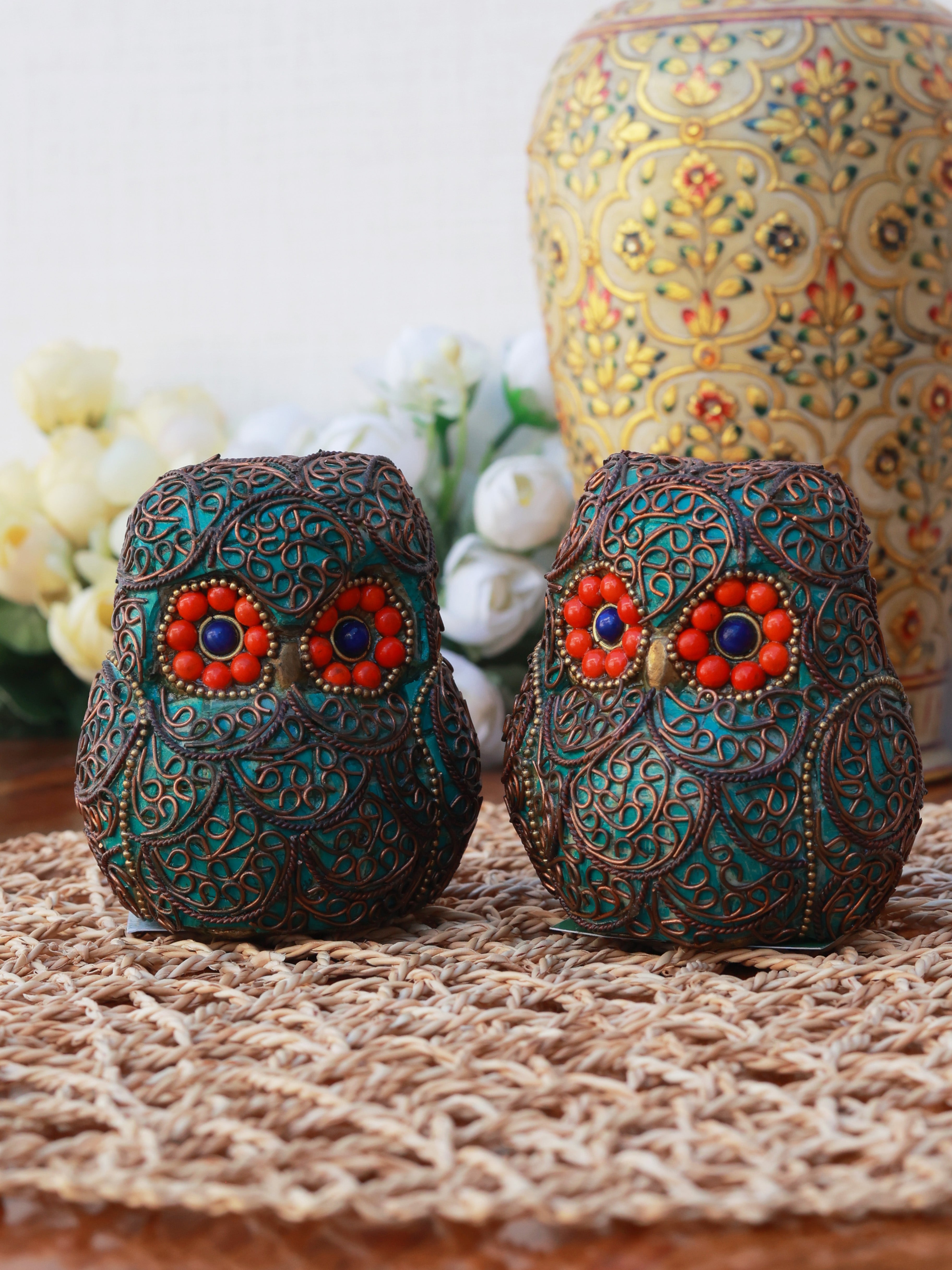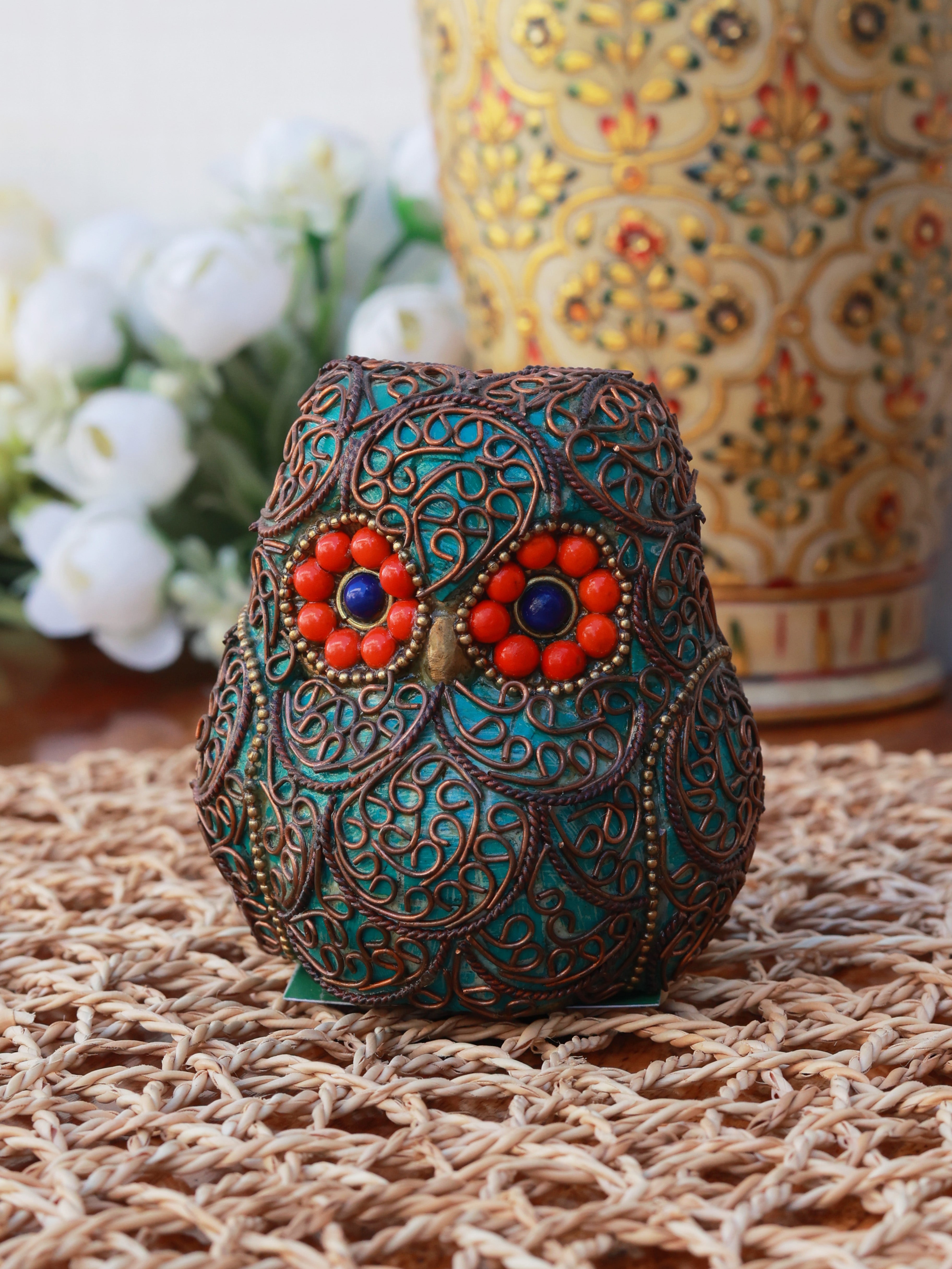 The Heritage Filigree Owl Sculpture is a celebration of traditional metal craftsmanship, featuring finely twisted brass wirework layered over a rich, jewel-toned base. Each swirl and curve is meticulously shaped by skilled artisans, creating a textured, ornamental form that reflects cultural elegance and refined taste. Symbolising wisdom and prosperity, this sculptural accent adds depth and character to consoles, shelves, or curated décor settings, making it a meaningful addition to both modern and heritage-inspired interiors.