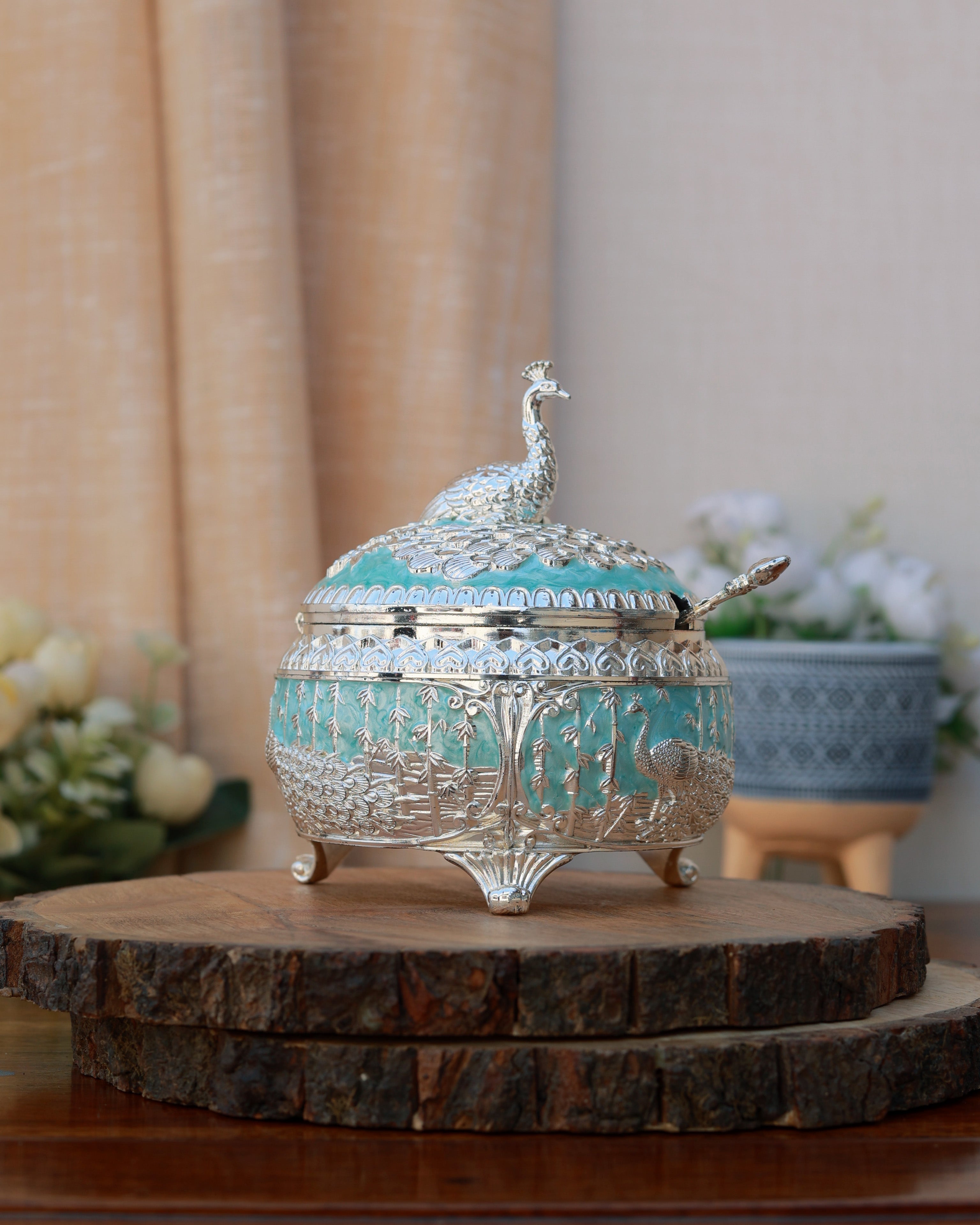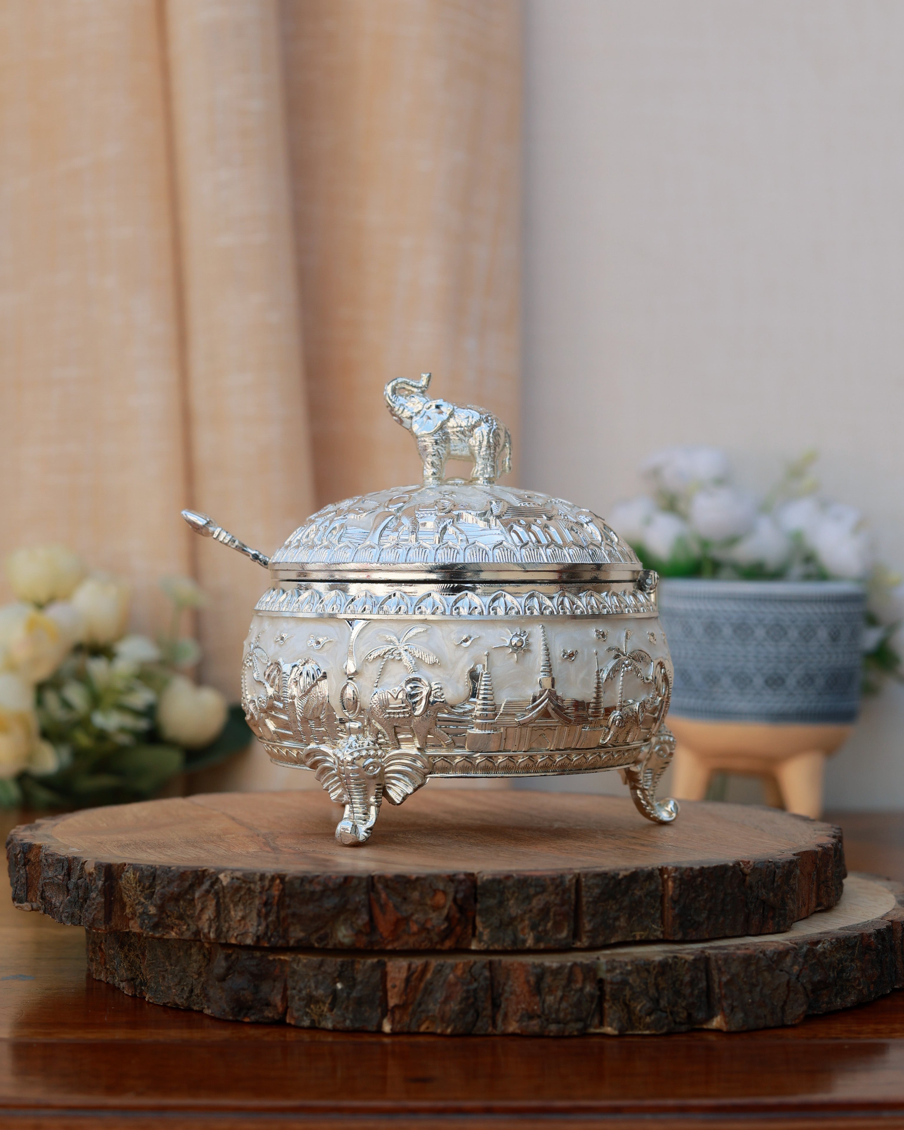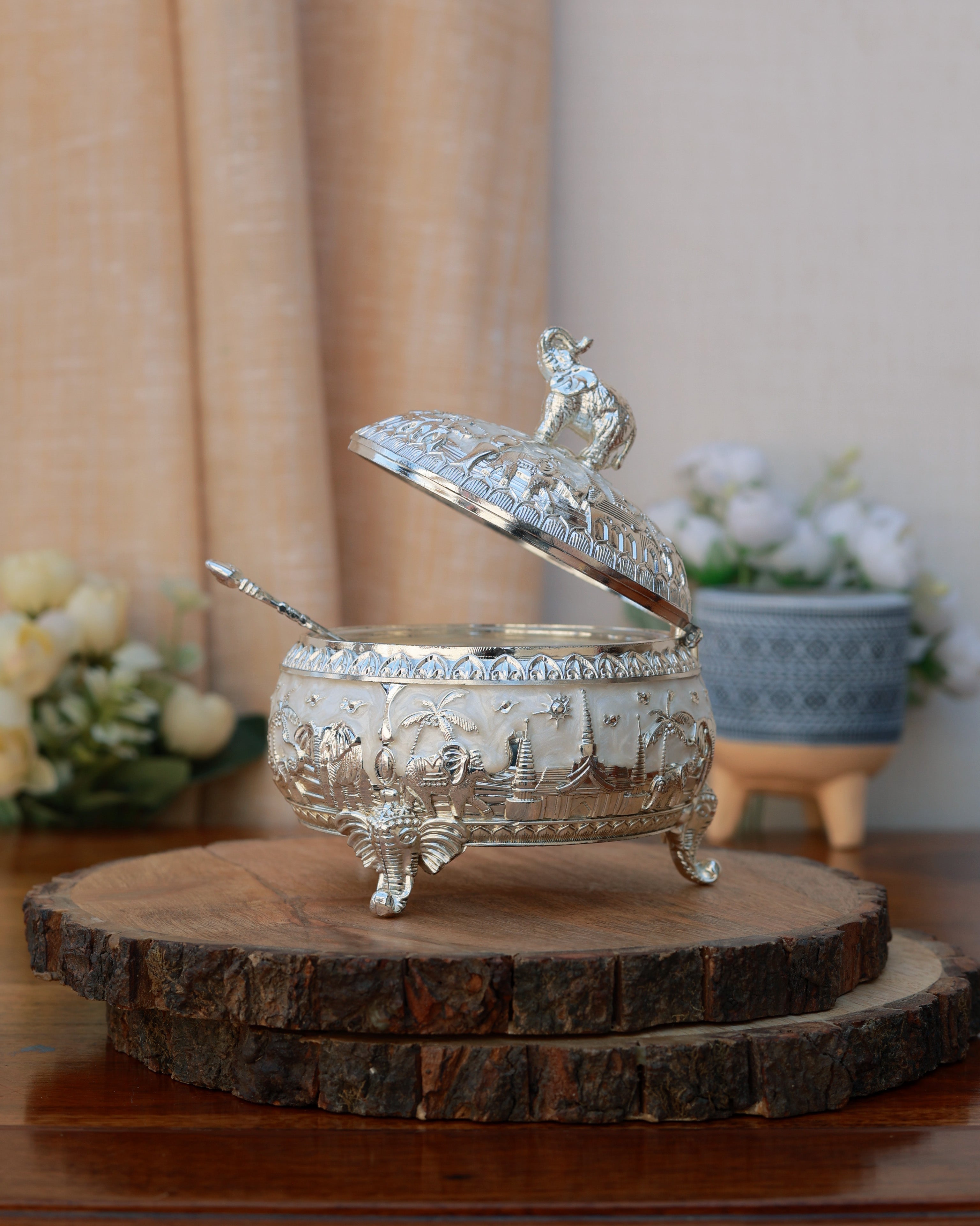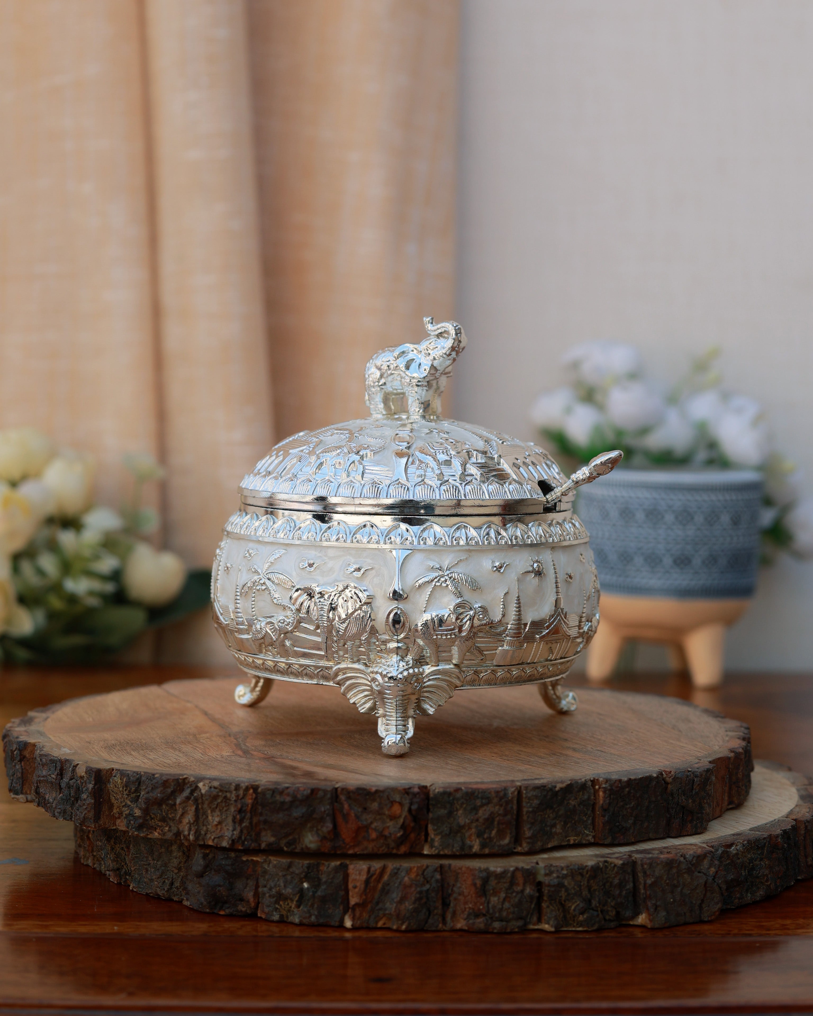 The Imperial Safari Embossed Box with Mini Spoon is a true statement of timeless craftsmanship and regal charm. Adorned with detailed safari-inspired carvings, this silver-tone box sits beautifully on ornate elephant-shaped legs, adding a touch of grandeur to any setting. Ideal for serving refreshments like mishri, saunf, dry fruits, condiments, or desserts, it also doubles as an elegant keepsake or décor accent. A perfect choice for festive gifting, wedding favors, or thoughtful return gifts that leave a lasting impression.
