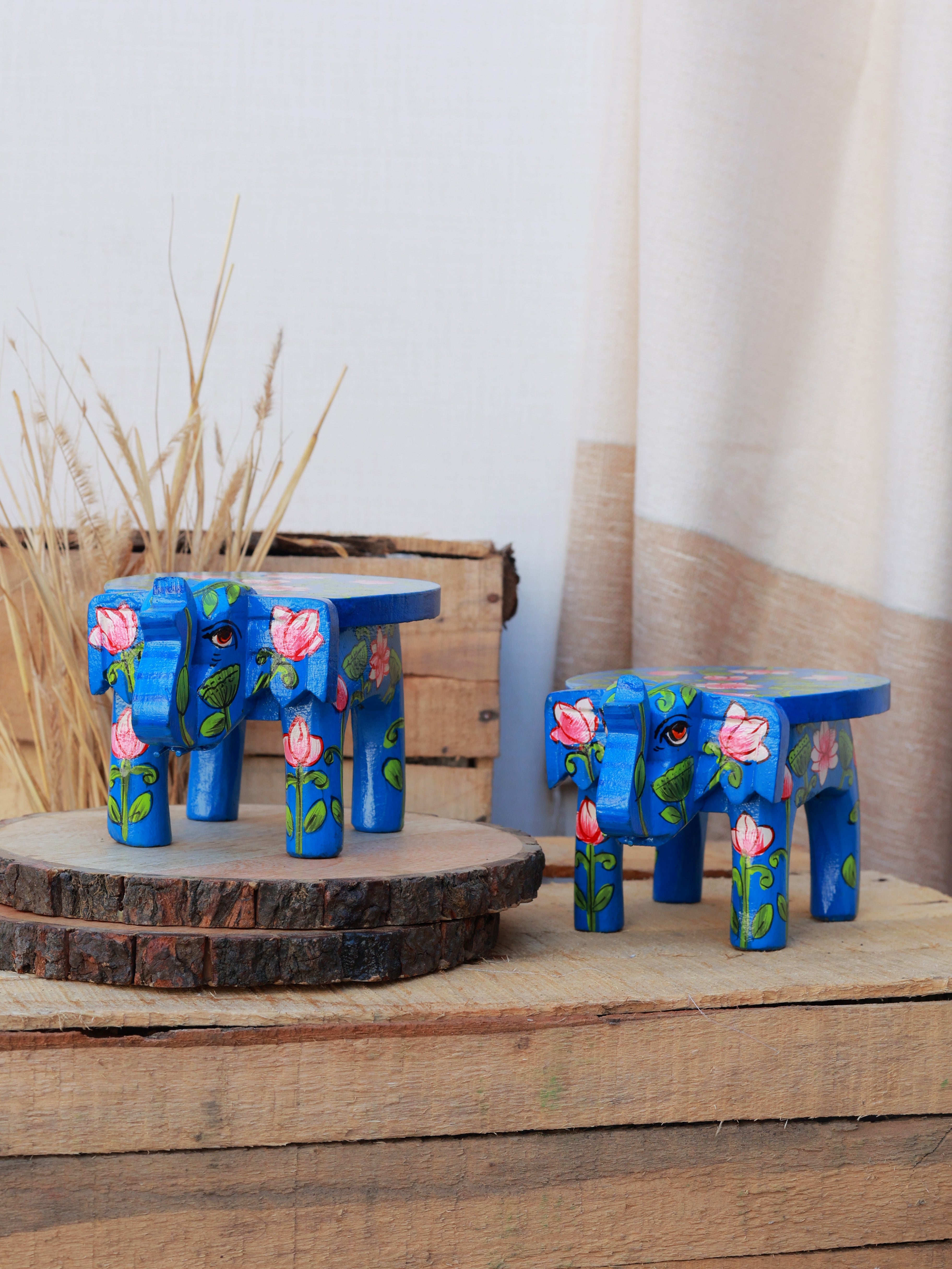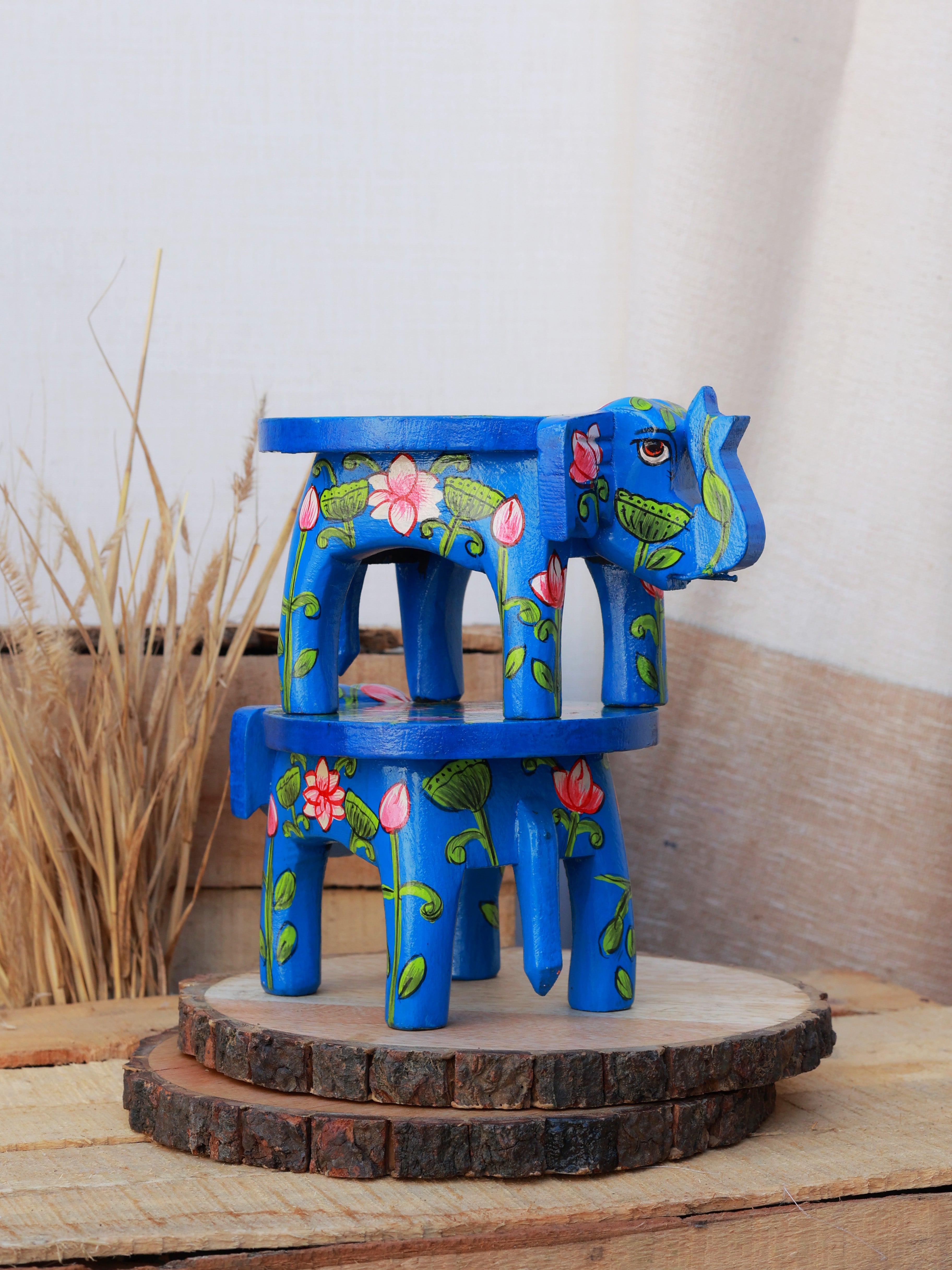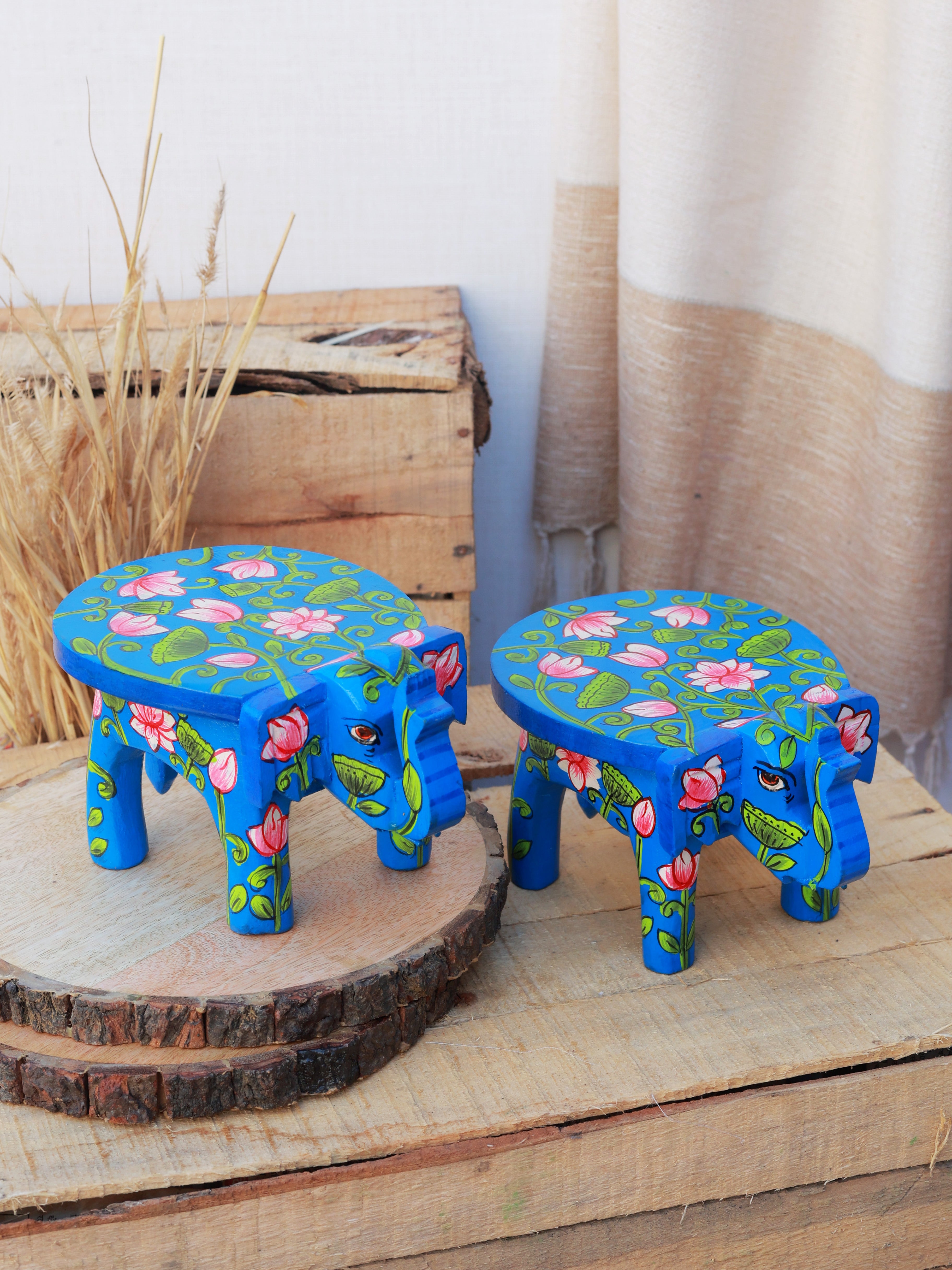 Add a playful yet elegant touch to your space with the Pichwai Elephant Stool. Hand-painted with intricate elephant motifs inspired by traditional Pichwai art, these mini stools are perfect as decorative accents, plant stands, or small side tables. Their compact design makes them versatile for any corner, shelf, or tabletop, infusing color, culture, and charm into your home.