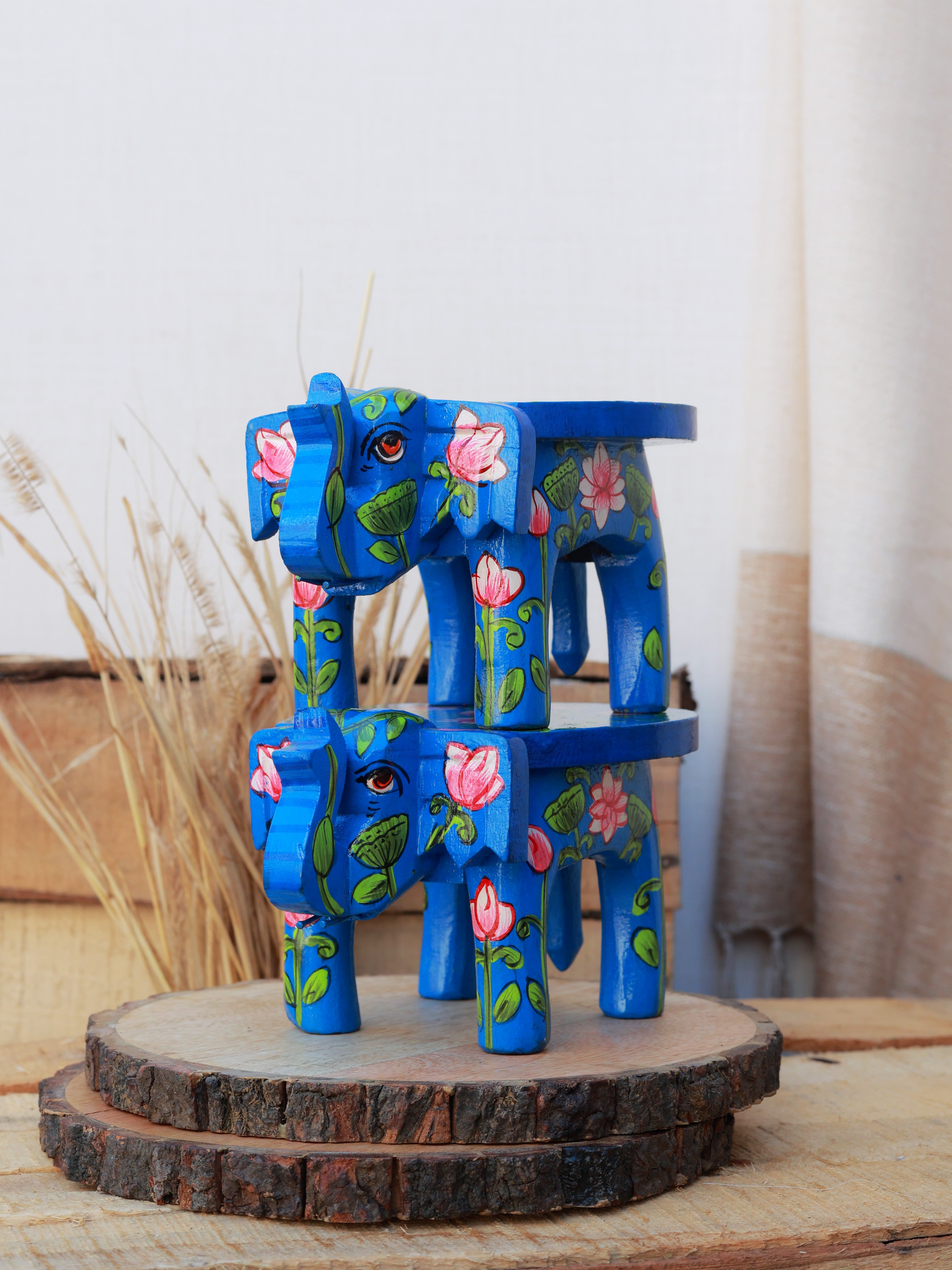 Pichwai Mini Elephant Blue Stool - Set of 2