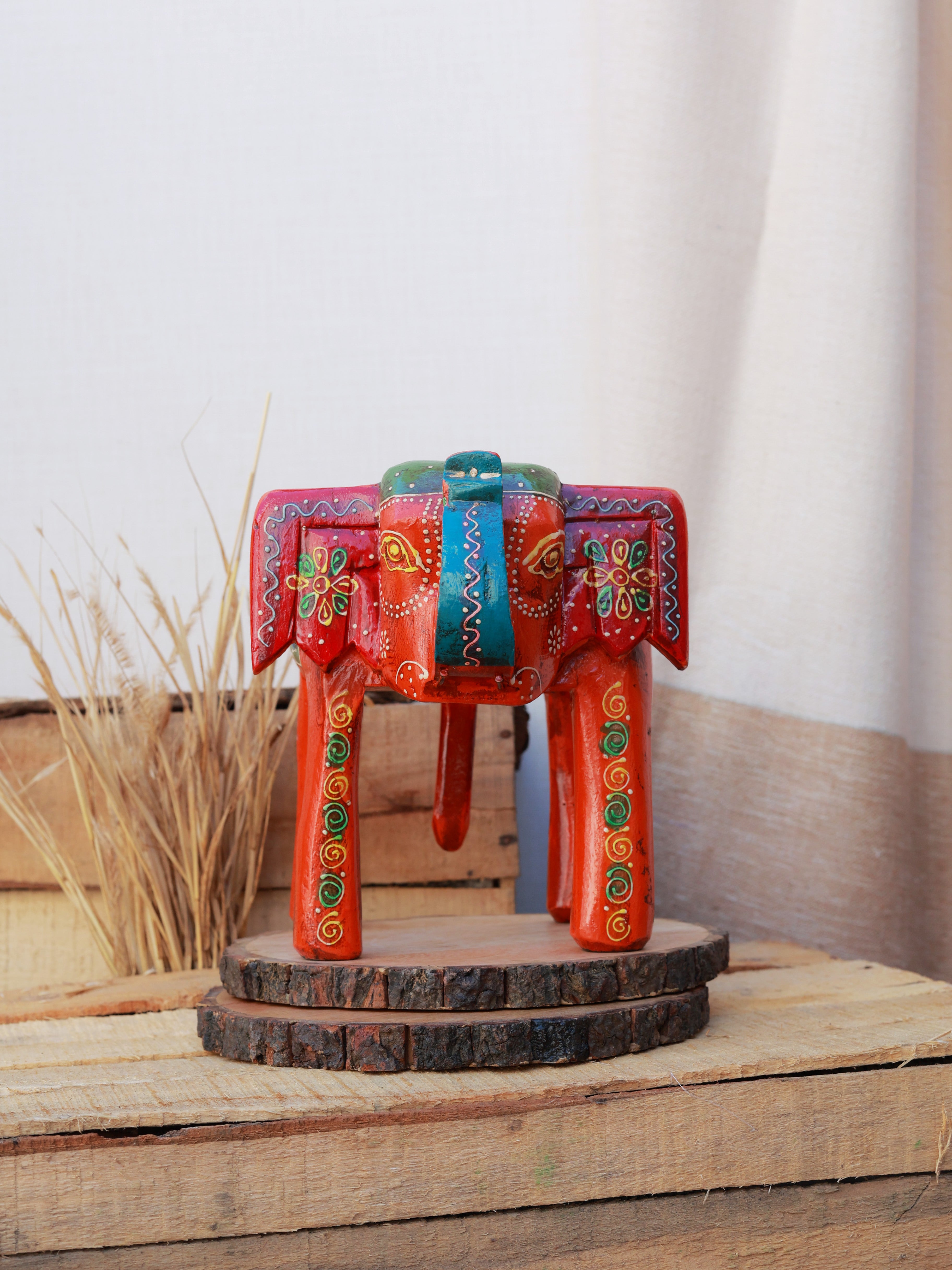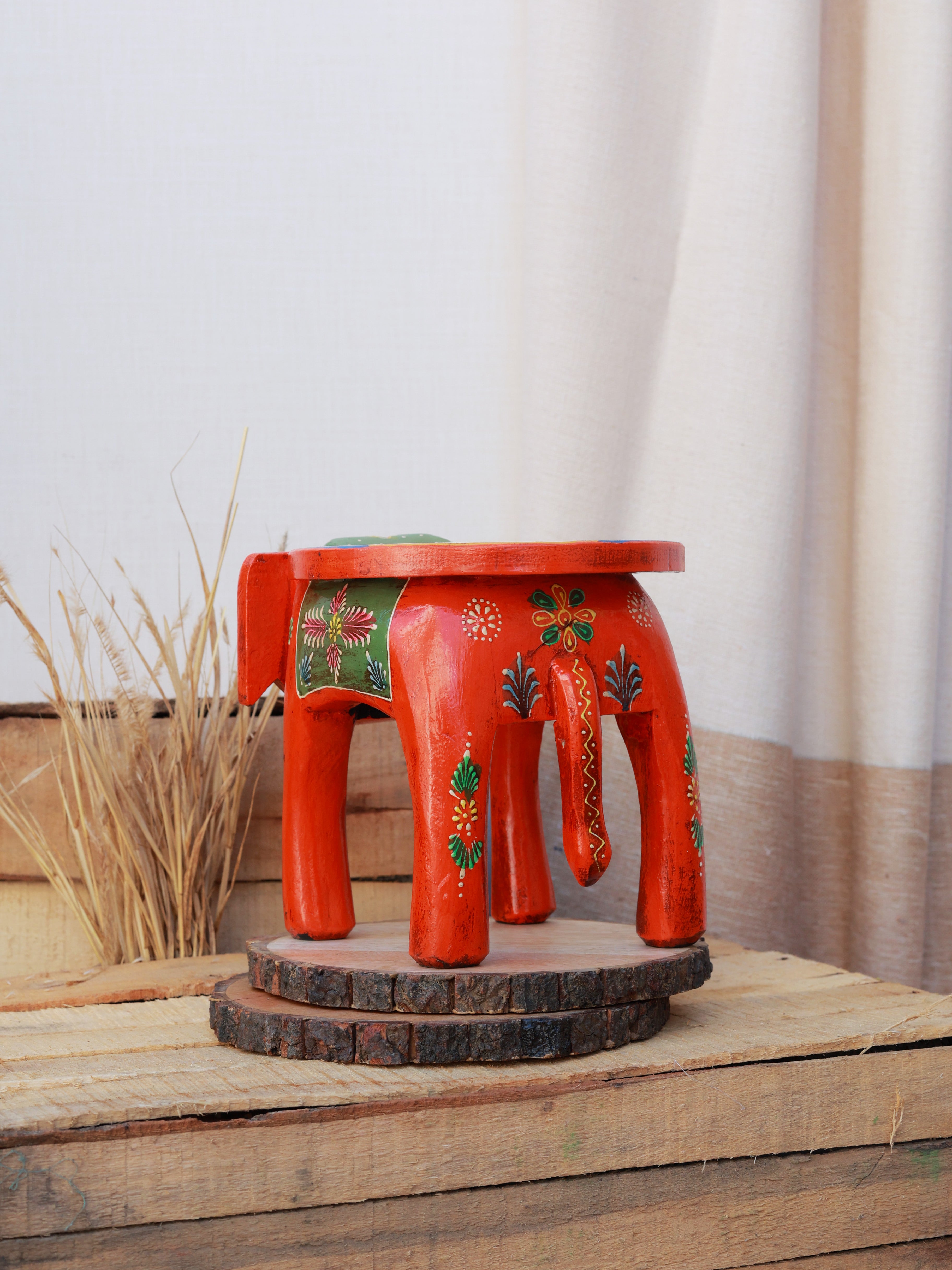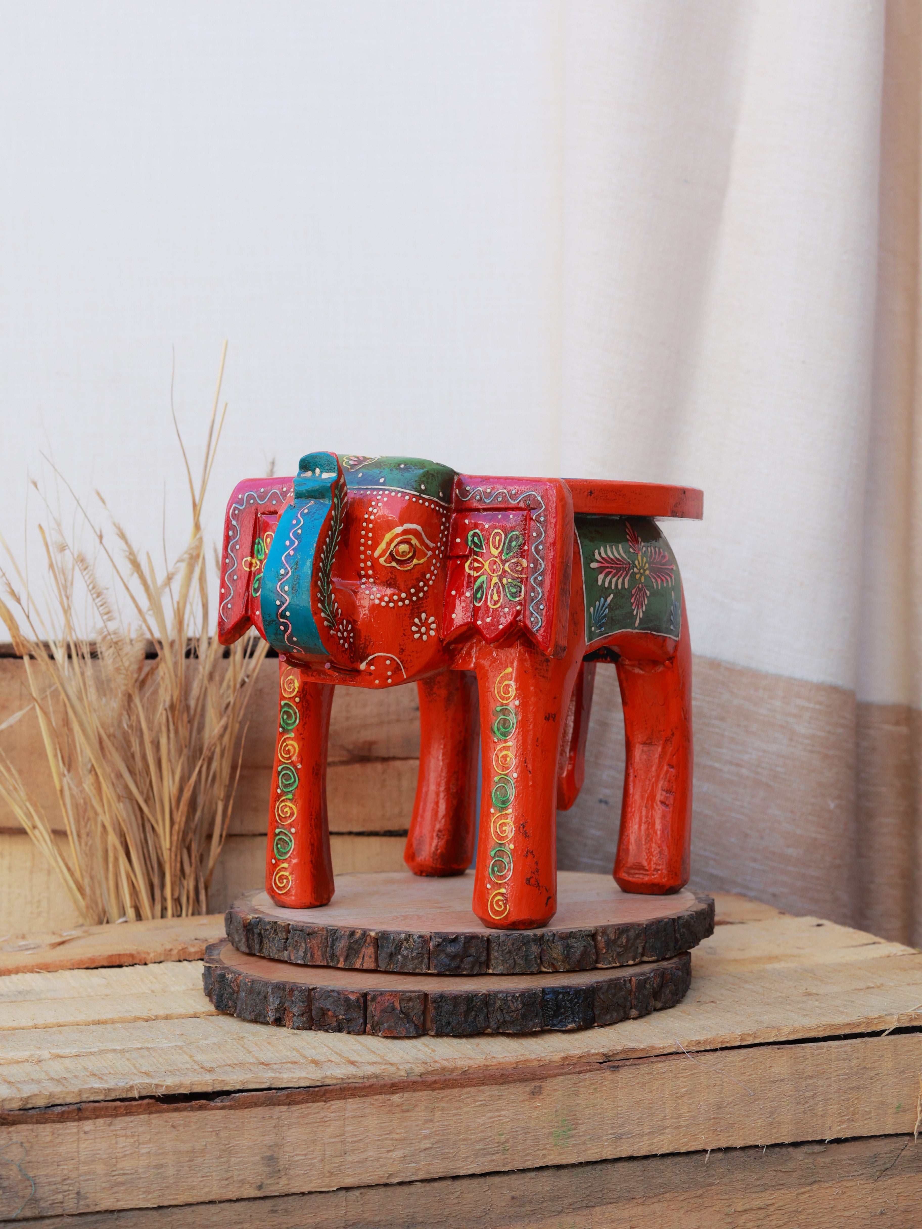 The Rustic Rangrez Elephant Stool is a beautifully hand-painted accent piece that brings vibrant Indian artistry into any space. Crafted in a charming elephant silhouette, it features rich colours, intricate motifs and a rustic finish that adds warmth and character. Perfect as a décor stand, mini side stool or display base for plants, lamps or artefacts. A striking blend of craftsmanship and culture, it uplifts any corner with its ethnic charm.