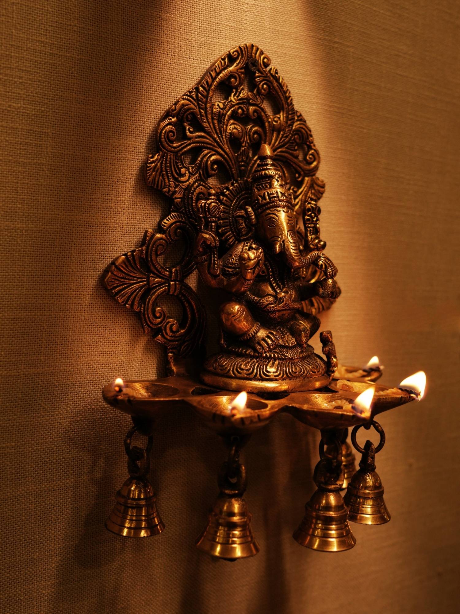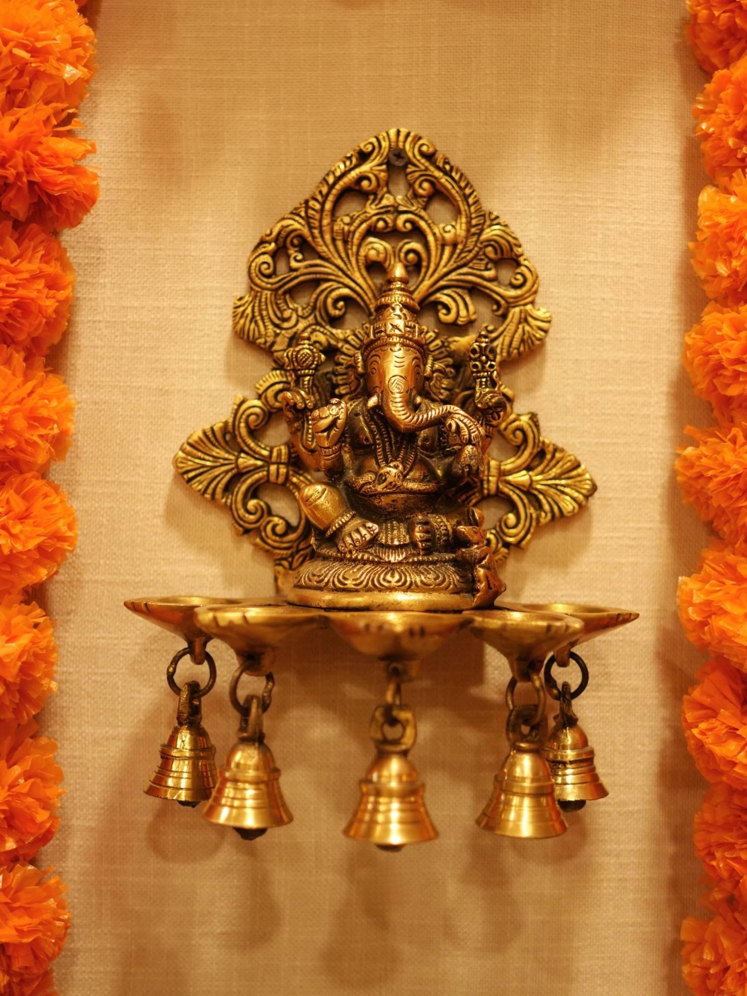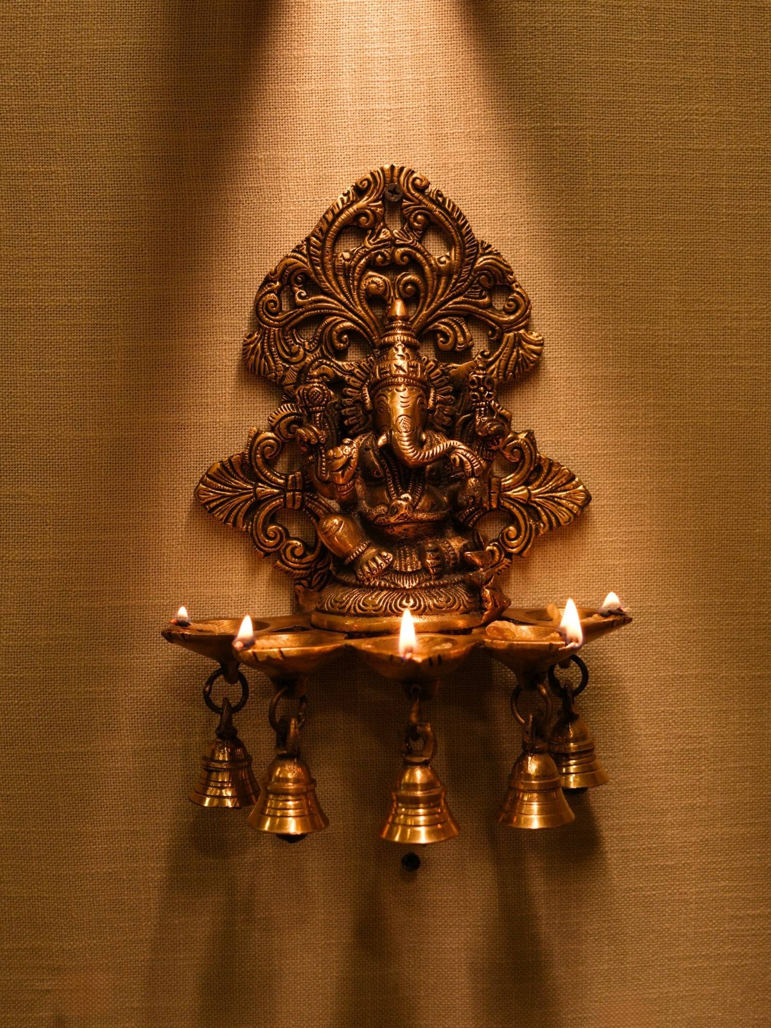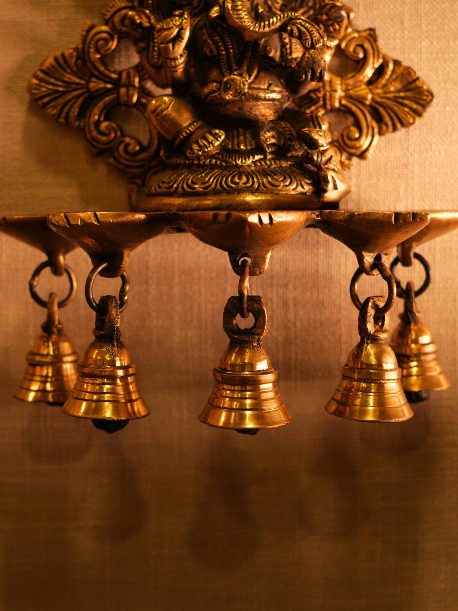 Brass Handcrafted Ganesh Diya With Bell Wall Hanging