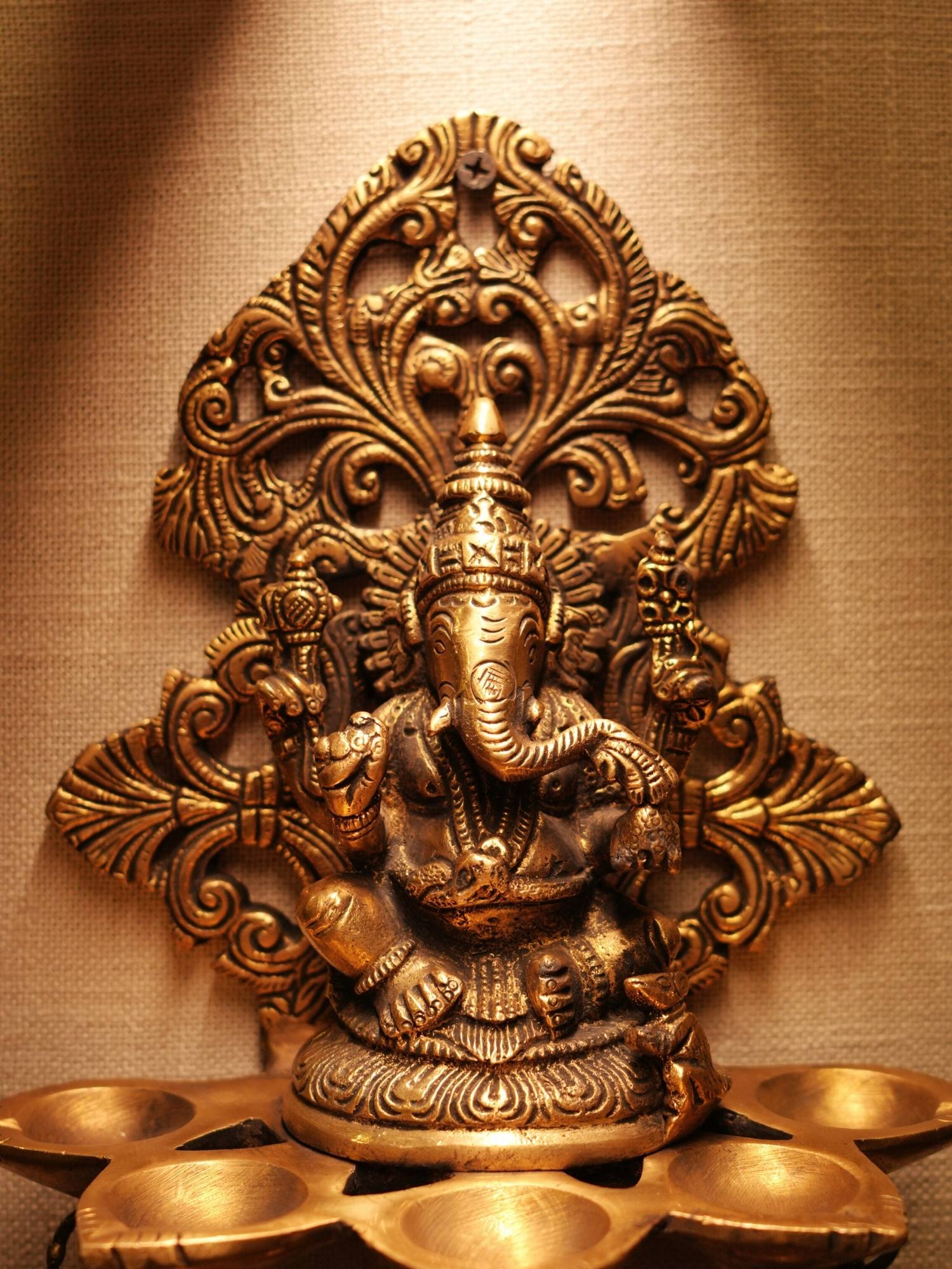 - Intricate Ganesh Design: This exquisite brass wall hanging features a beautifully detailed Lord Ganesha idol, the Hindu deity known for removing obstacles and bringing good fortune. The idol is depicted with his characteristic elephant head, large ears, and single tusk.