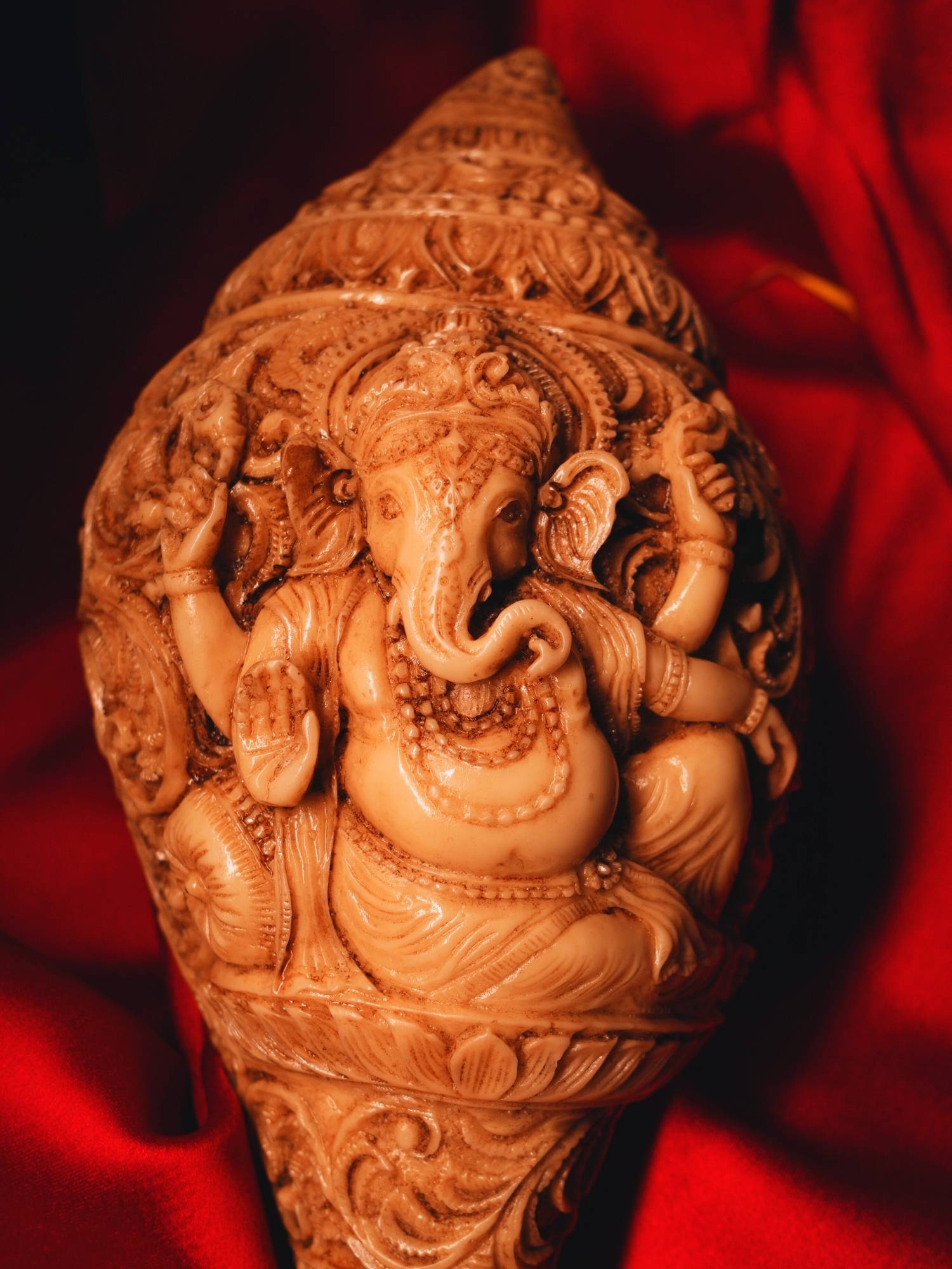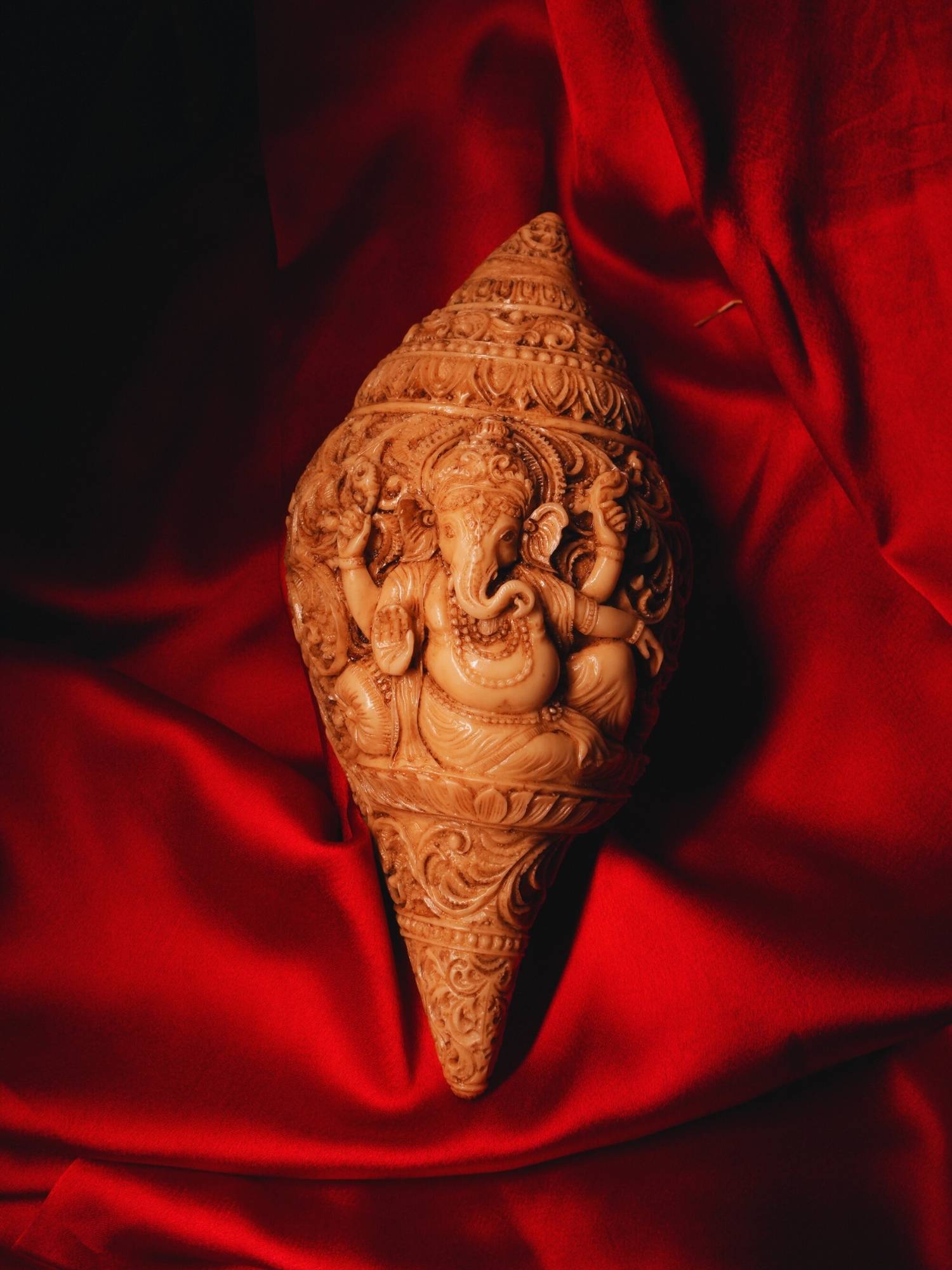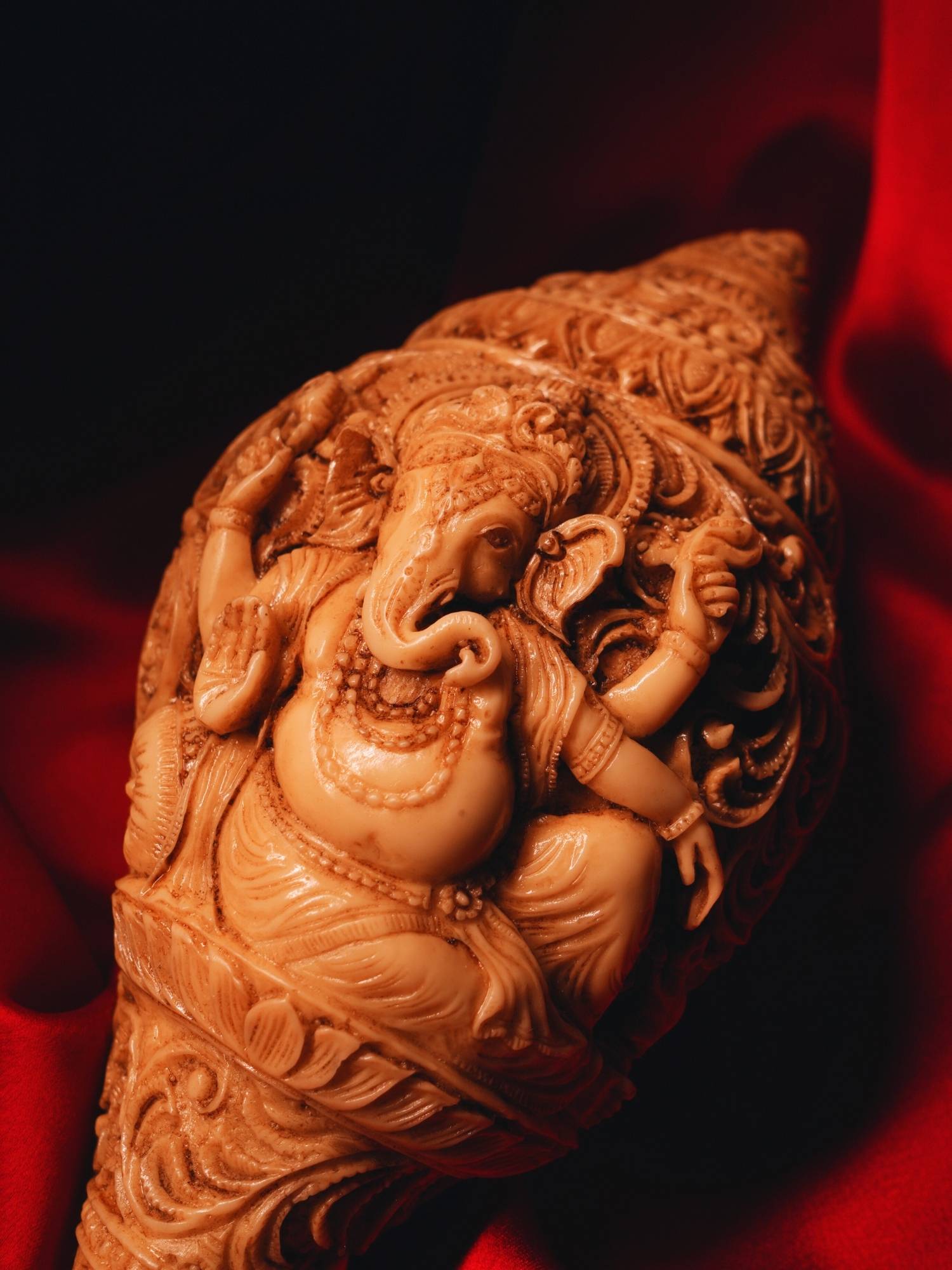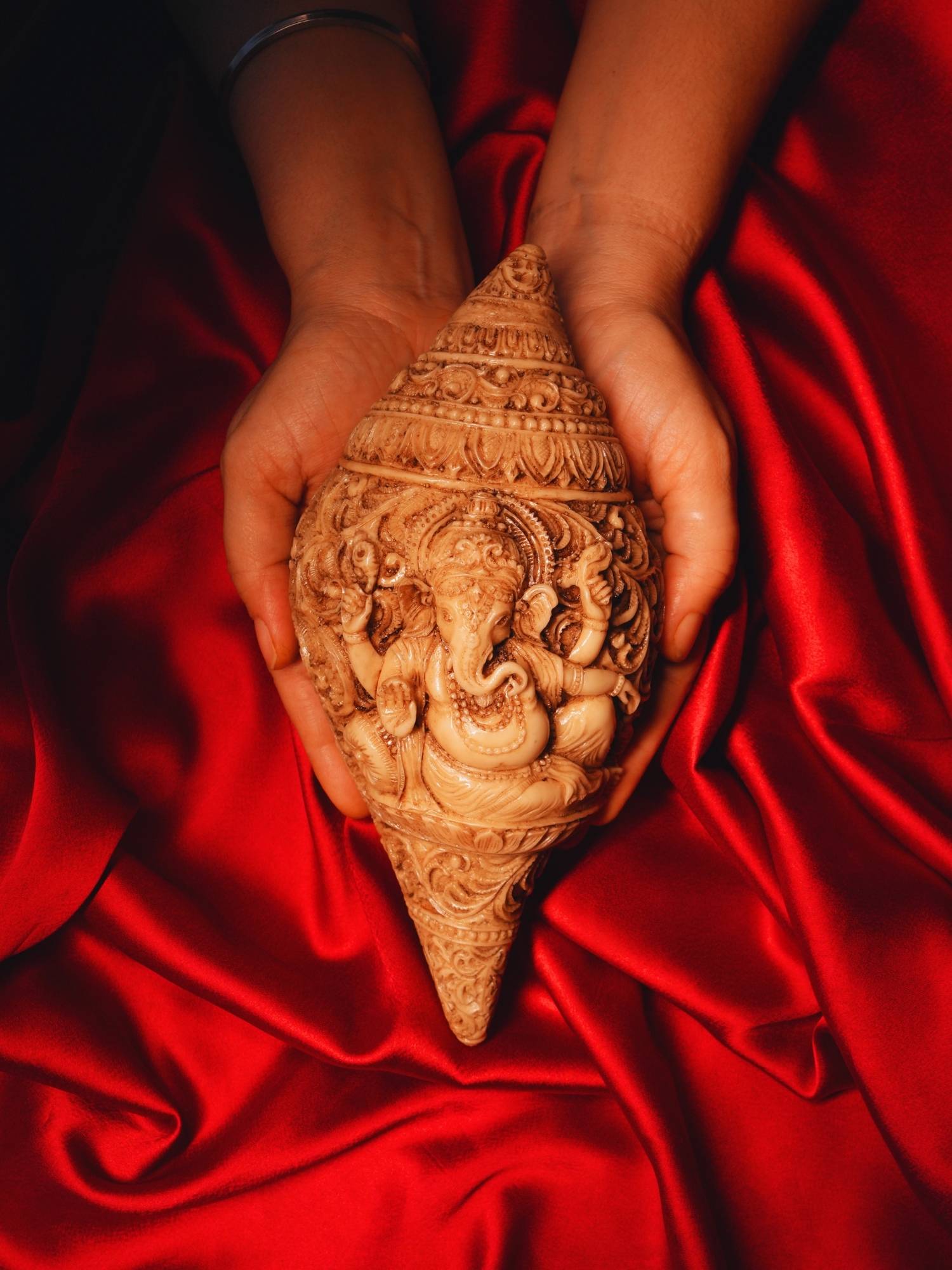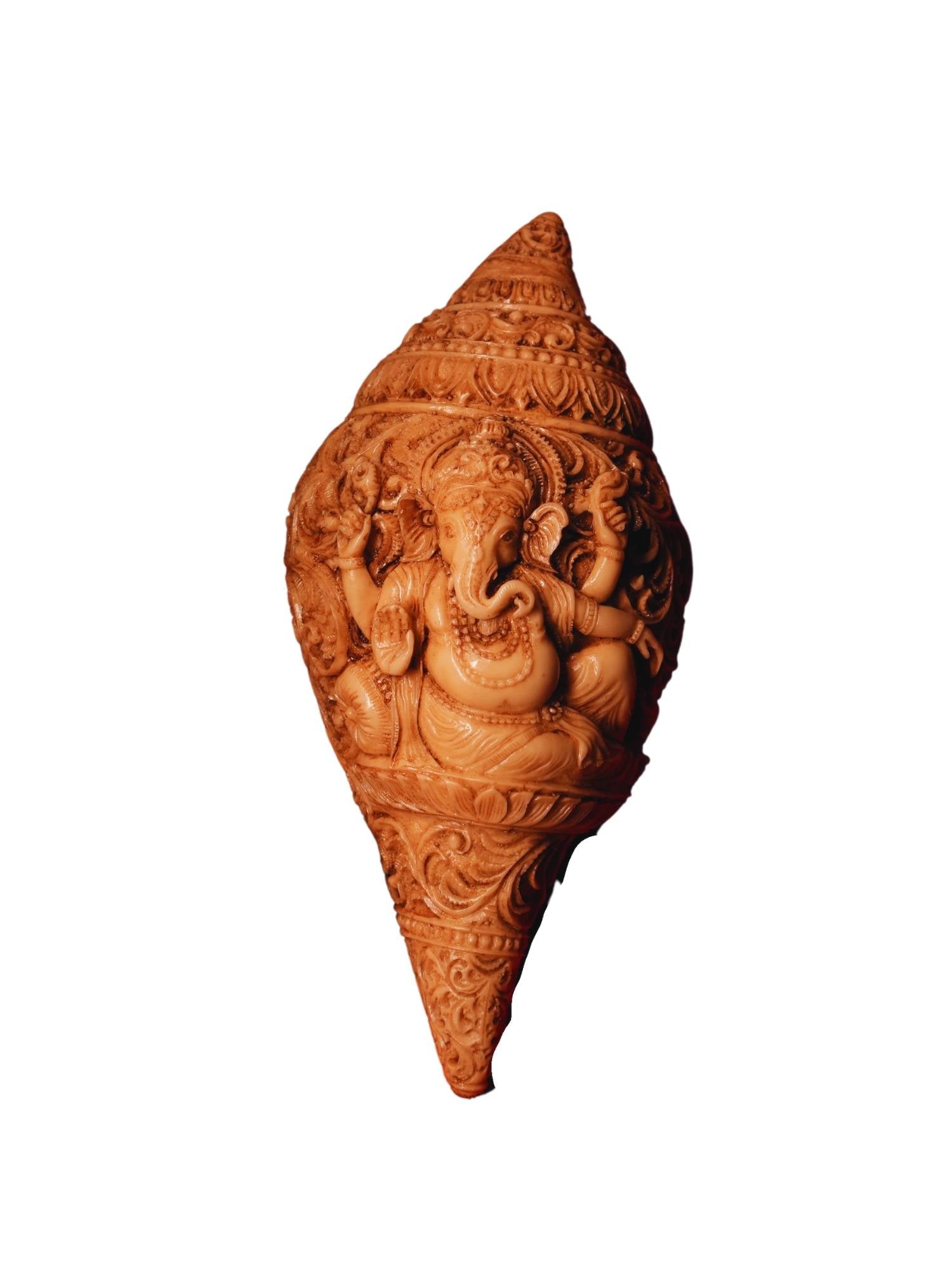 • Sacred Symbol: This beautifully carved Ganesh Shankh, or conch shell with Lord Ganesha, is a revered symbol in Hindu mythology. Ganesha, the remover of obstacles, is depicted sitting on a lotus flower within the conch shell.