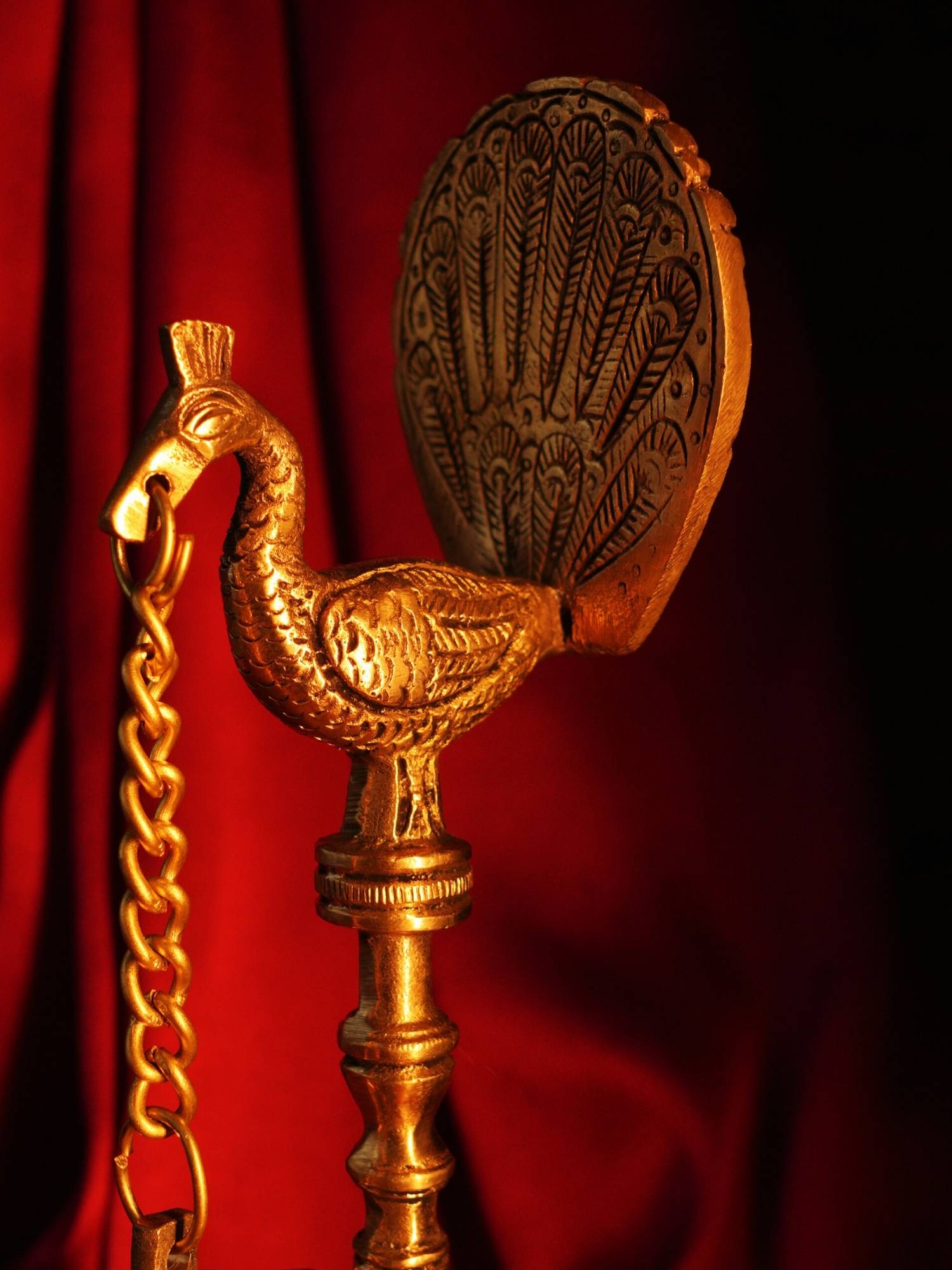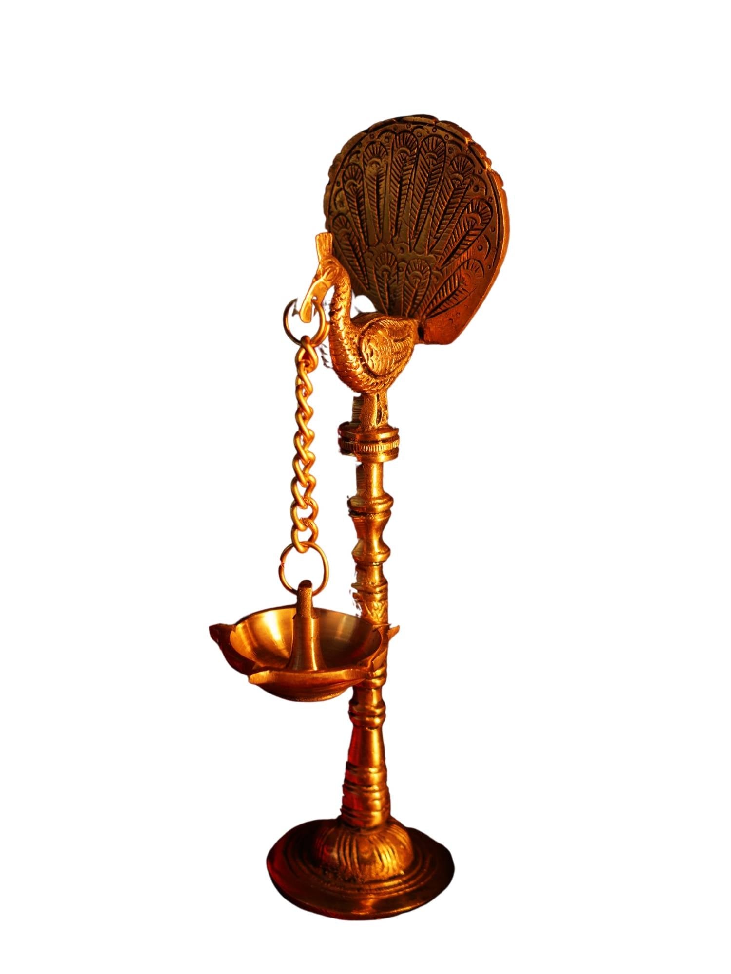 Handcrafted Brass Peacock Chain Hanging Diya Showpiece. Our exquisite Handcrafted Brass Peacock Chain Hanging Diya Showpiece is a beautiful and functional piece of art. This unique diya combines the grace of a peacock with the traditional charm of an oil lamp, making it a perfect addition to any home.