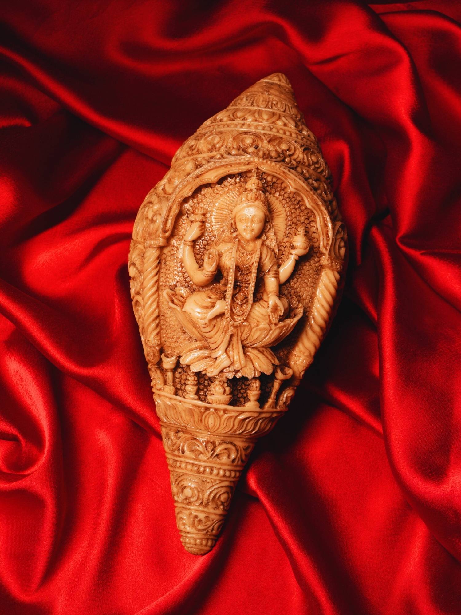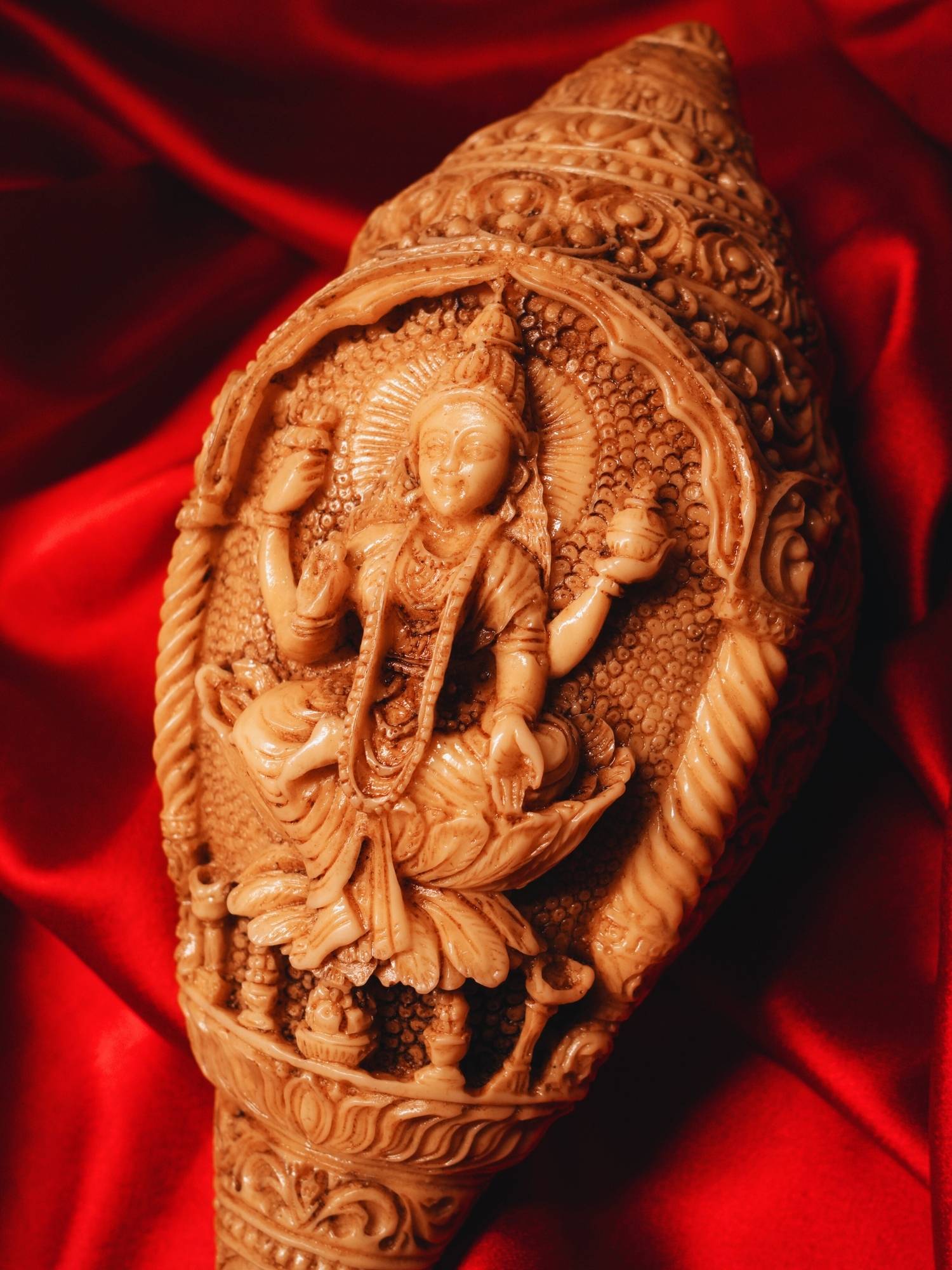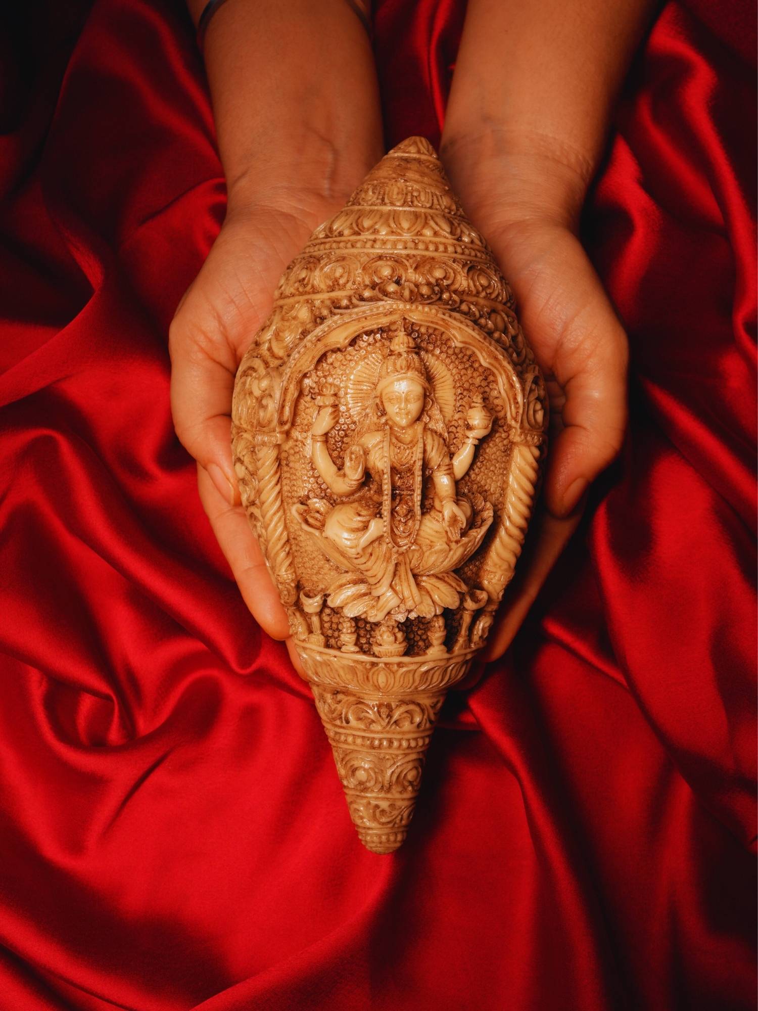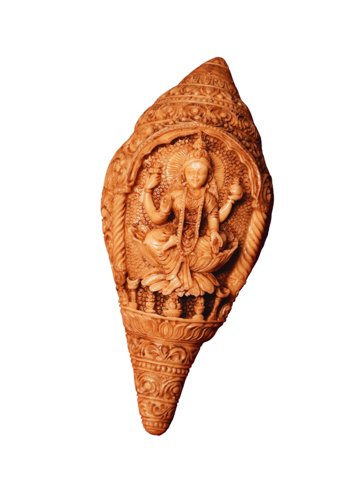 - Sacred Symbol: This beautifully carved Laxmi Shankh, or conch shell with Goddess Lakshmi, is a revered symbol in Hindu mythology. Goddess Lakshmi, the goddess of wealth, prosperity, and fortune, is depicted seated on a lotus flower within the conch shell.