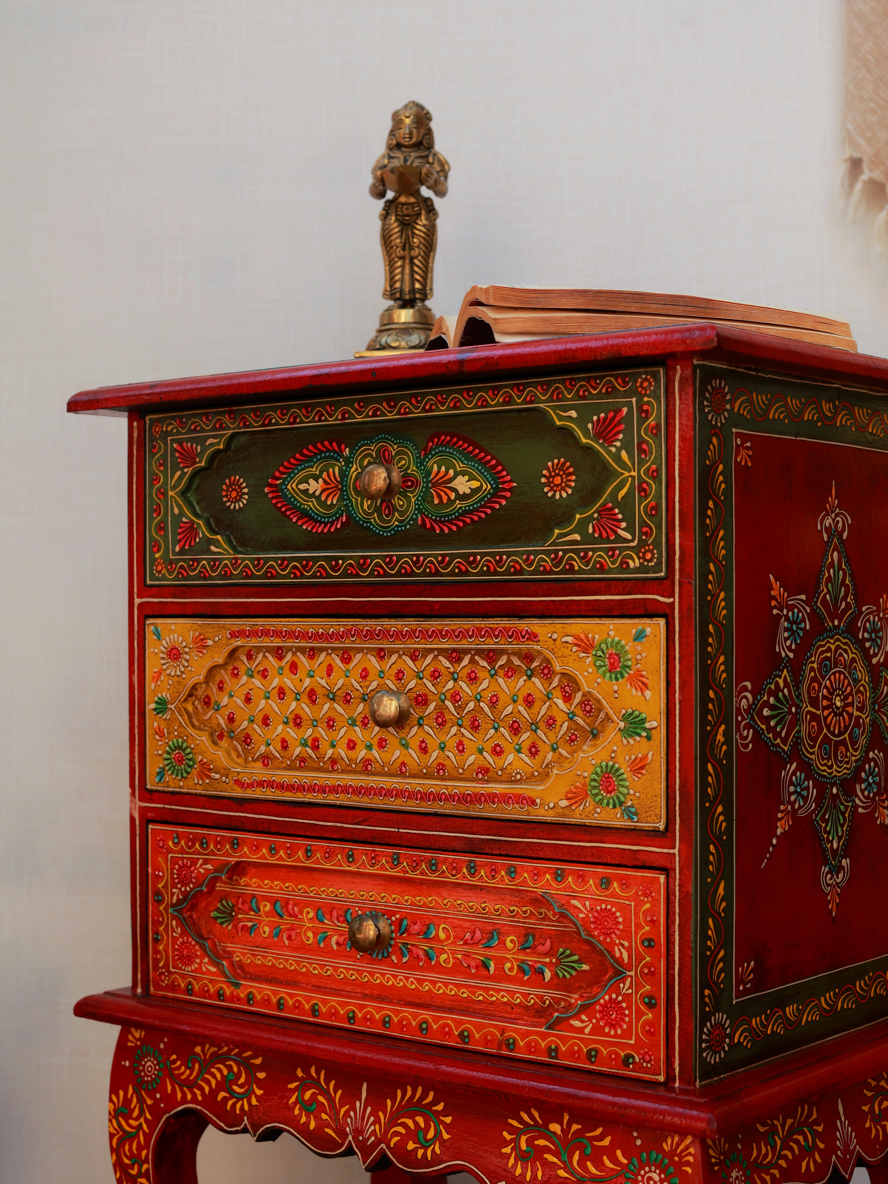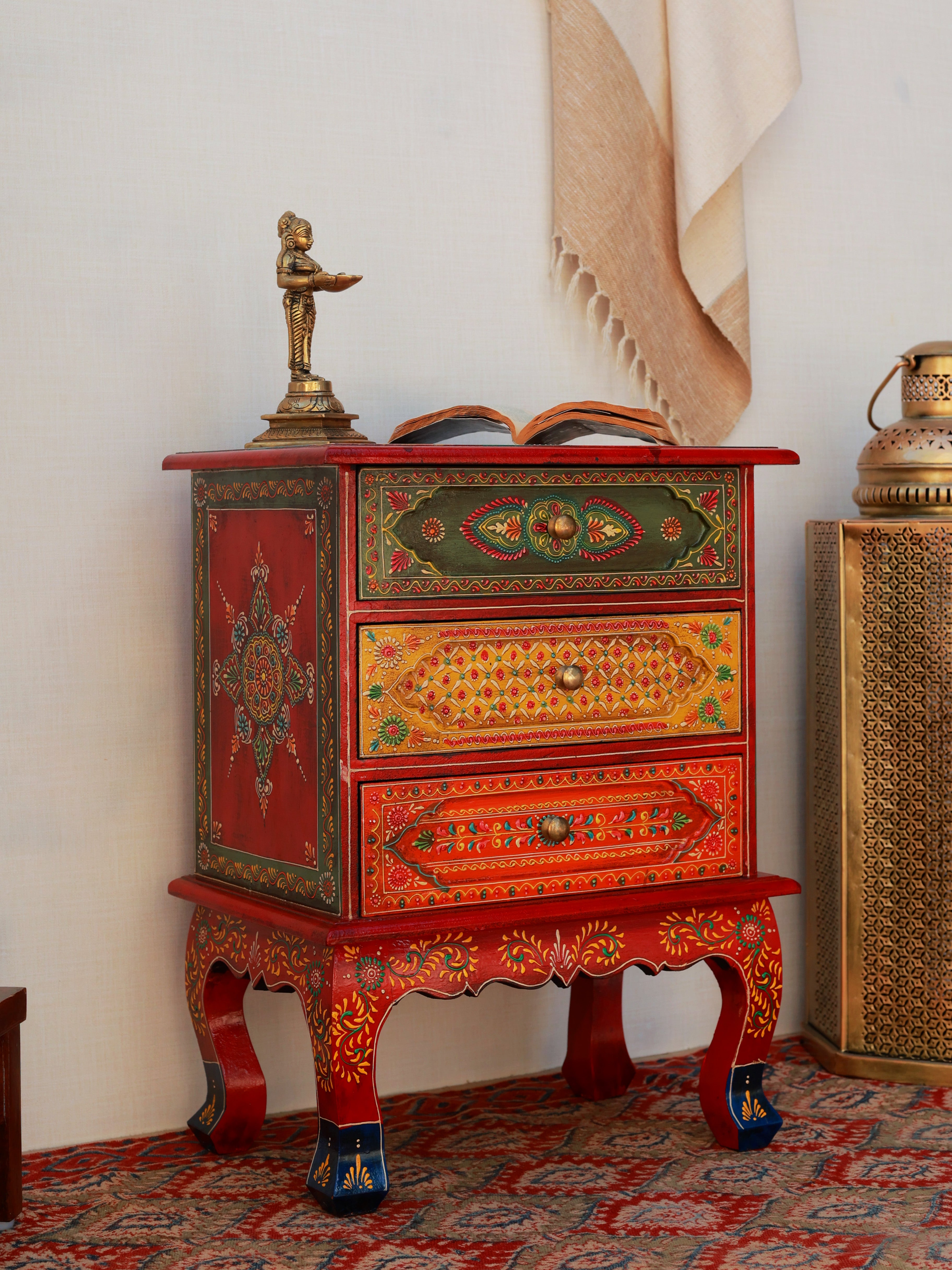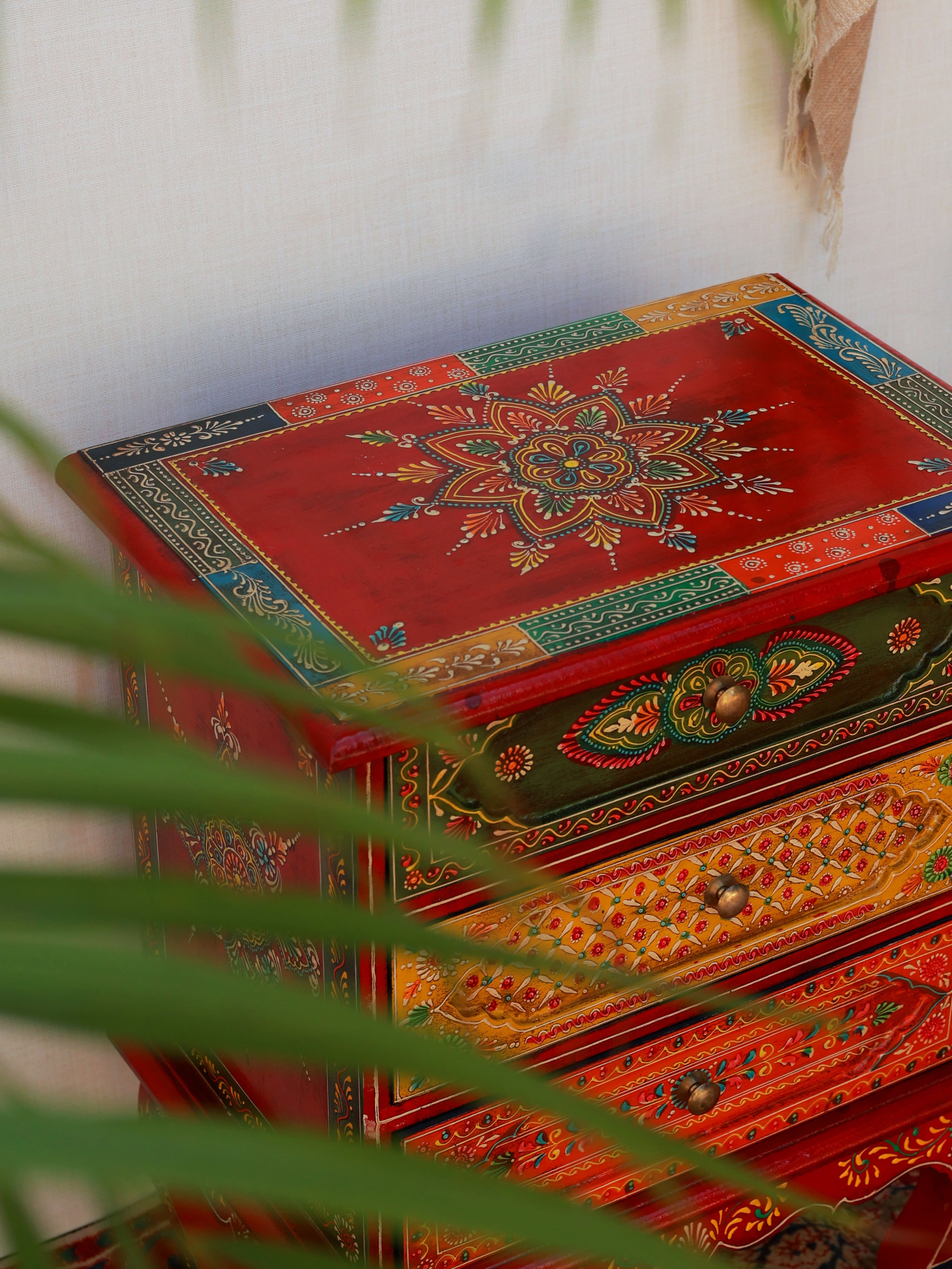 The Aangan-e-Rang Drawer Chest feels like a slice of an old Indian courtyard where colours told stories and every motif carried a blessing. Hand-painted by artisans who have inherited this craft through generations, its vibrant layers of red, green, and gold echo the warmth of festive evenings and the charm of a lived-in haveli. Each drawer opens like a little treasure box—inviting you to store memories, not just things. This piece doesn’t just decorate a space; it fills your home with heritage, artistry, and a sense of timeless Indian beauty.