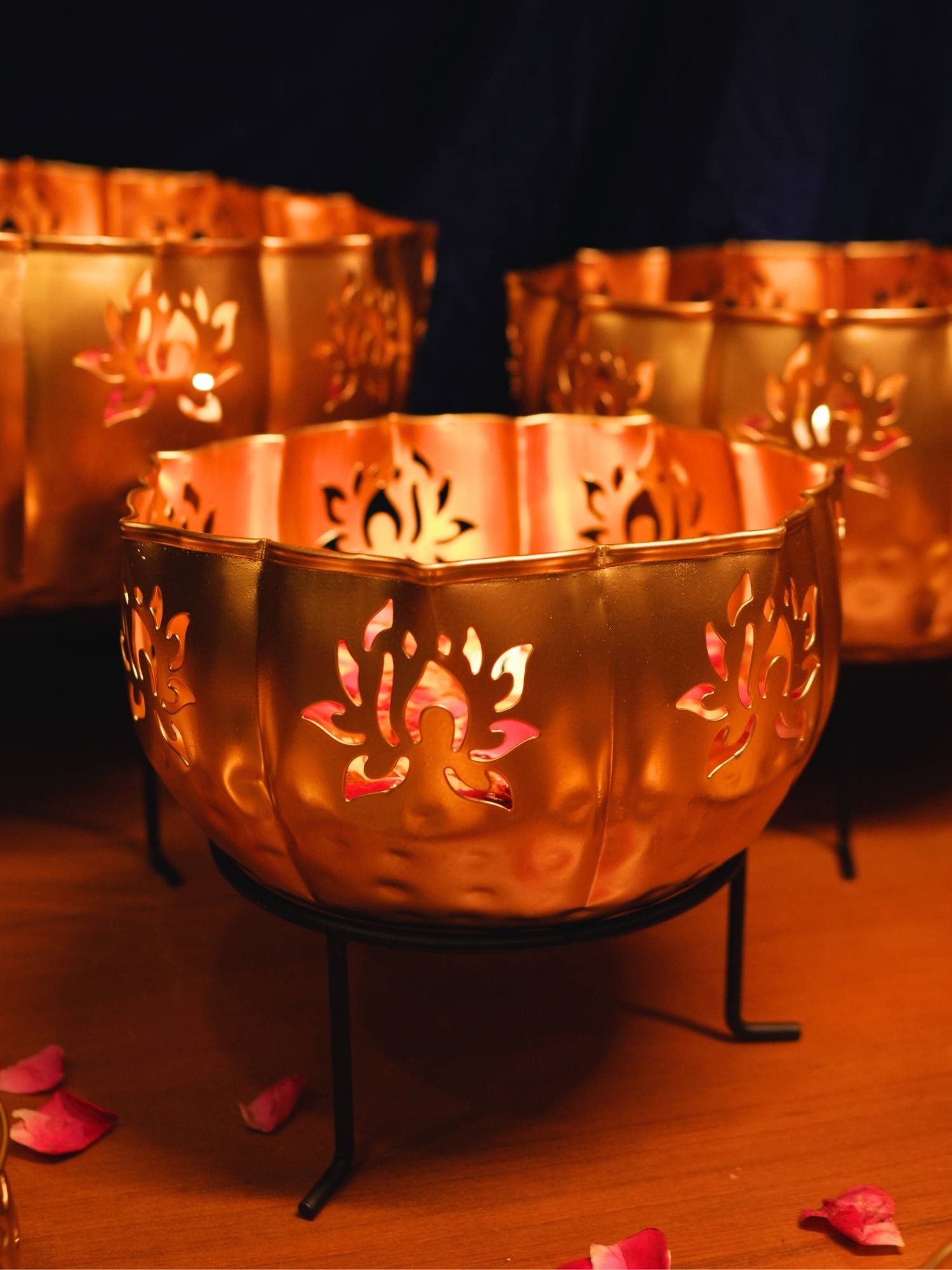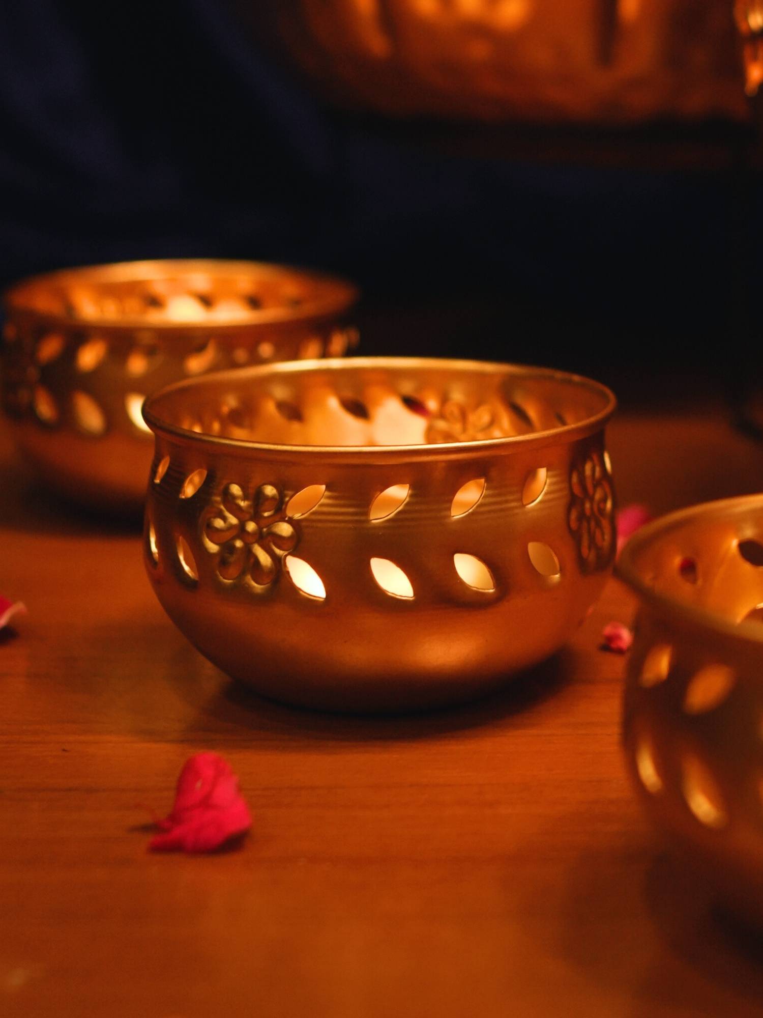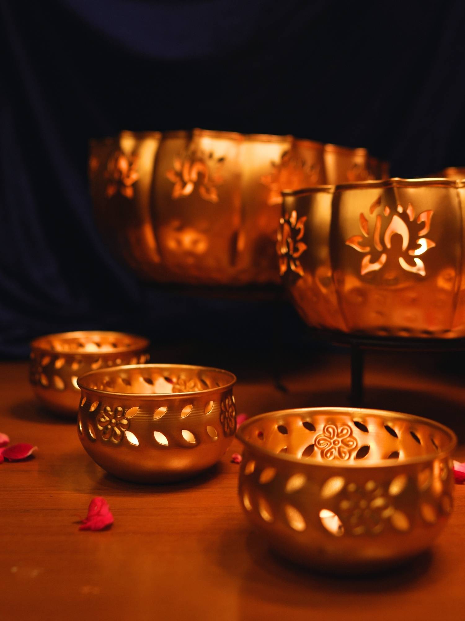 Experience the timeless elegance of this handcrafted brass urli bowl set, a masterpiece designed to elevate your Diwali decor. These exquisite bowls feature intricate lotus-shaped designs, each meticulously crafted to capture the essence of serenity and grace.
