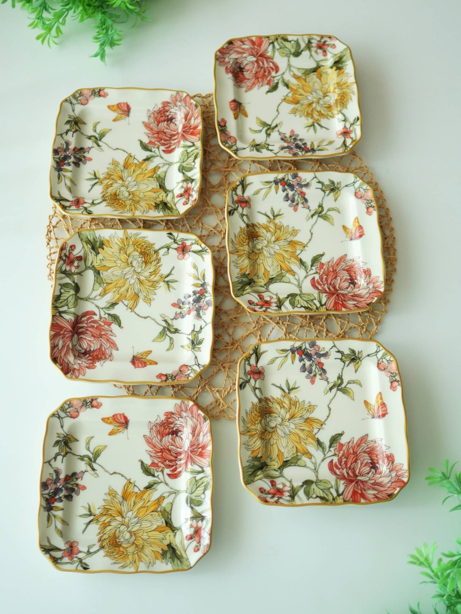 Brighten your dining experience with these vibrant square platters featuring an intricate floral design inspired by the beauty of the highlands. Crafted from durable, dishwasher-safe ceramic, they are perfect for serving appetizers, snacks, or desserts. This versatile set of six complements any interior style and makes a thoughtful gift for special occasions.