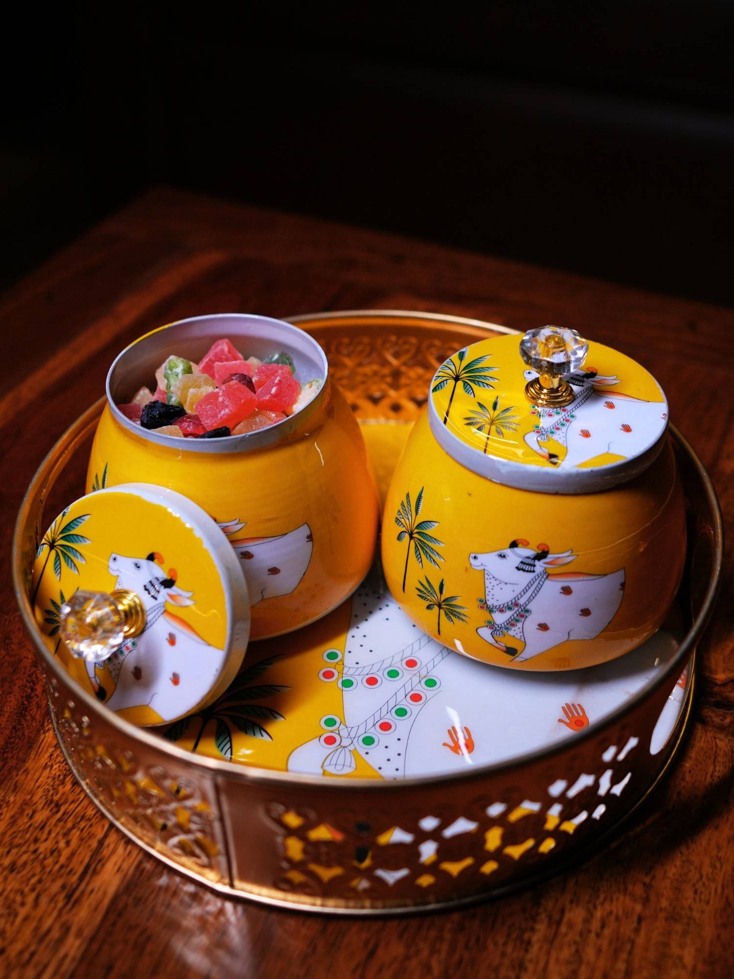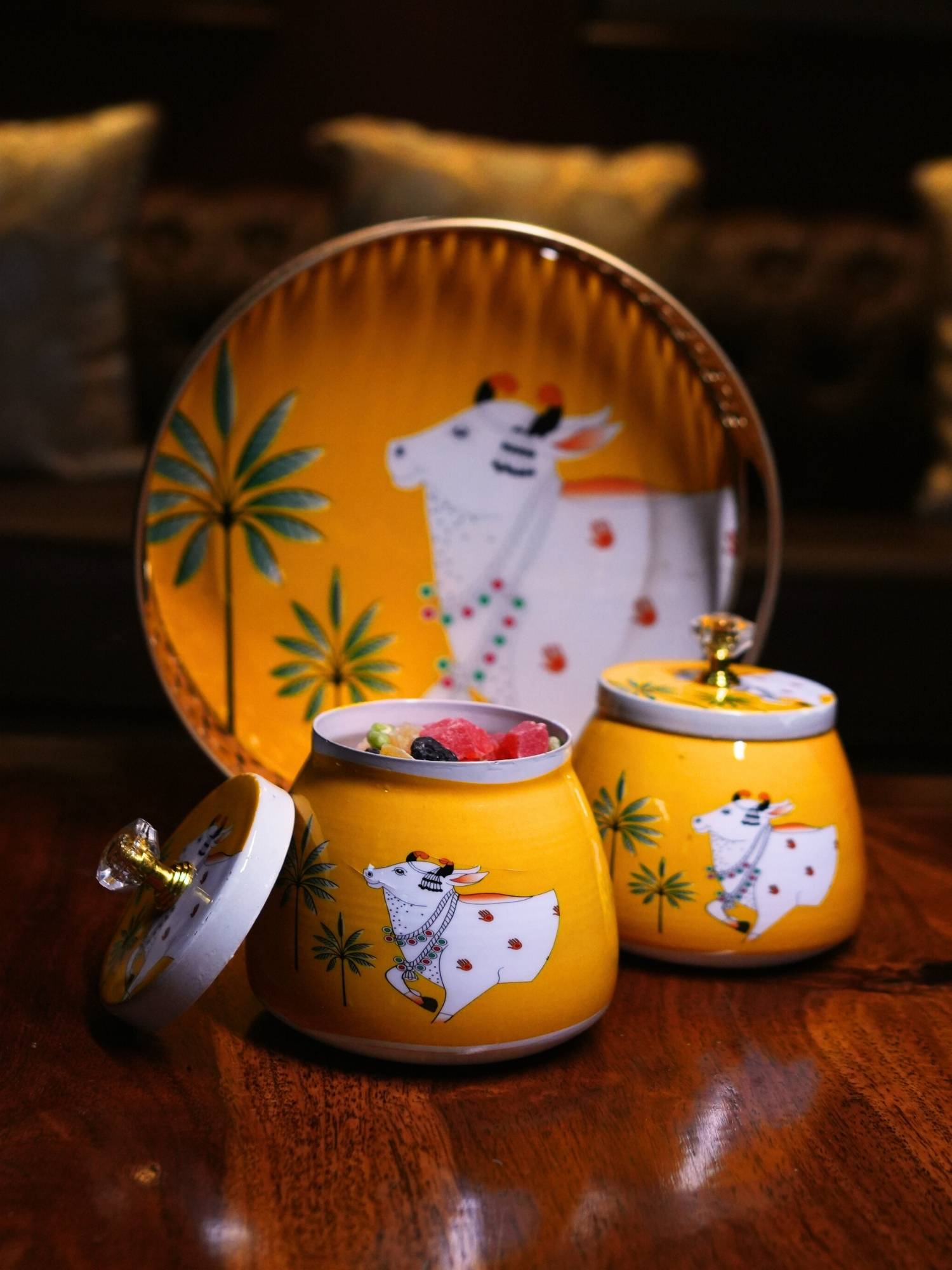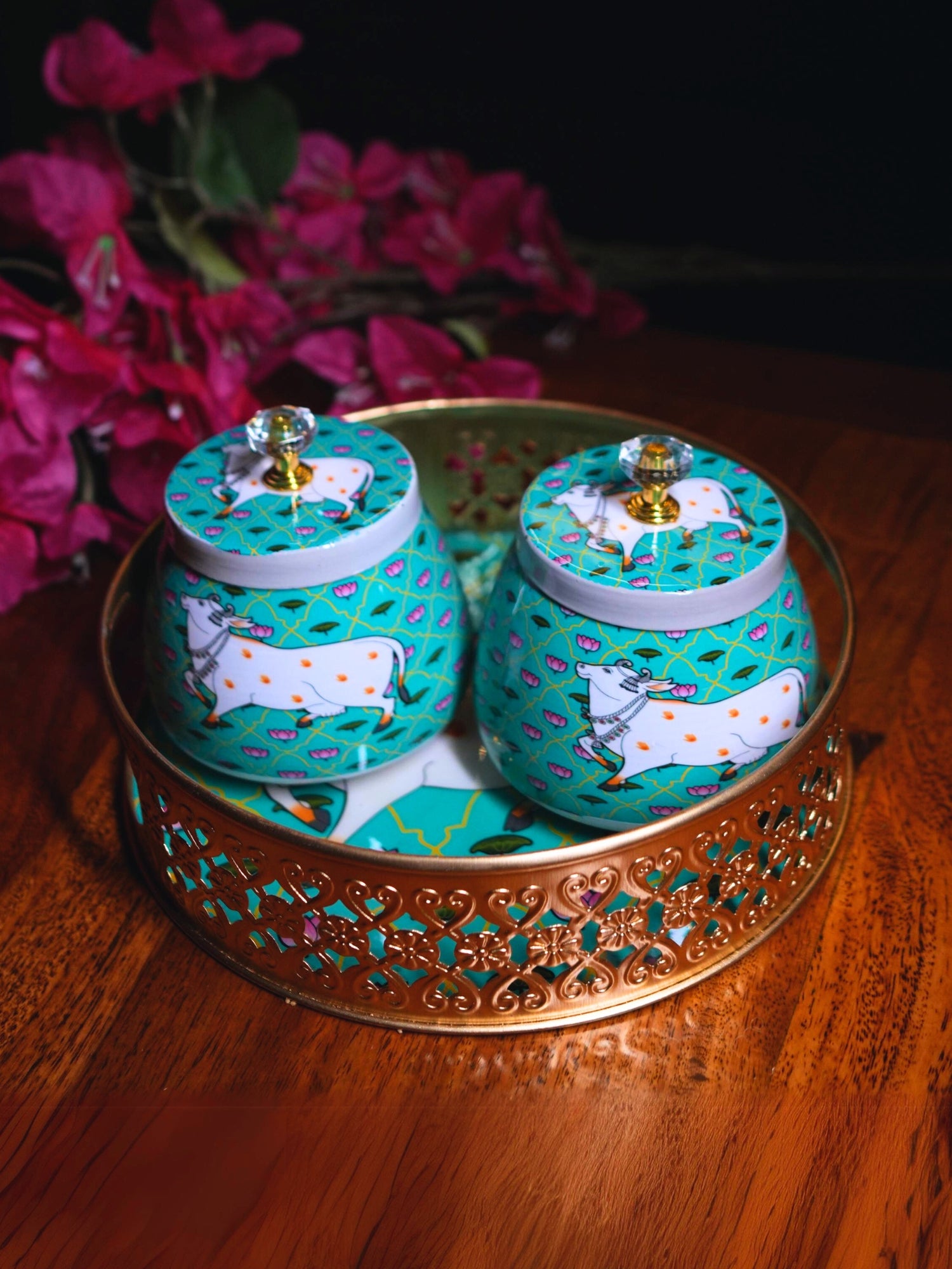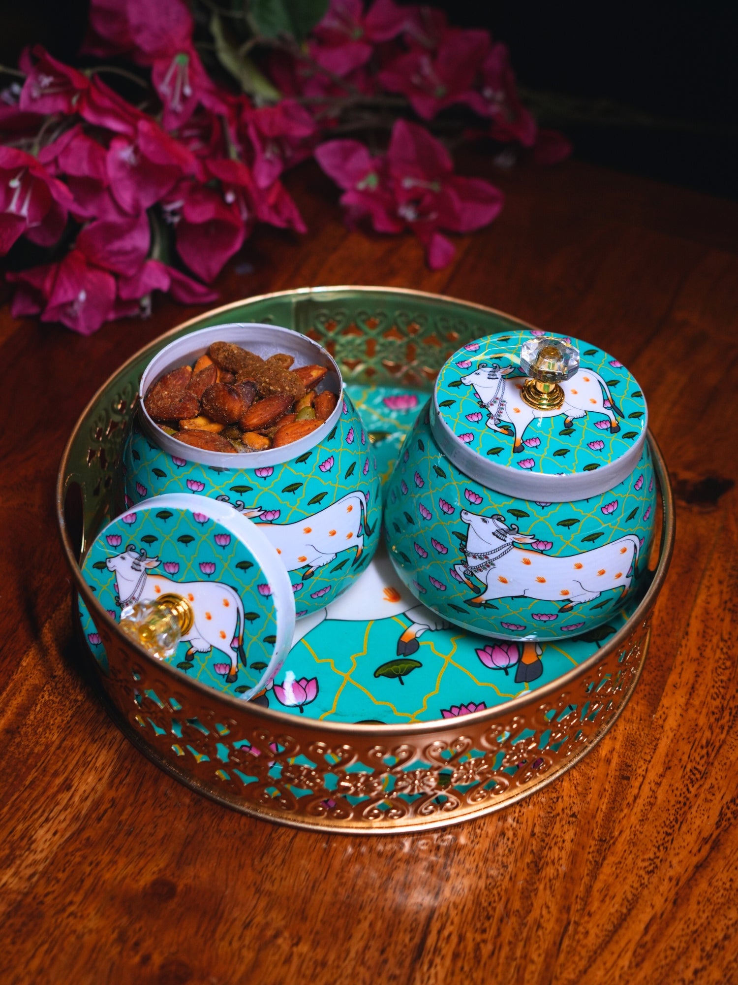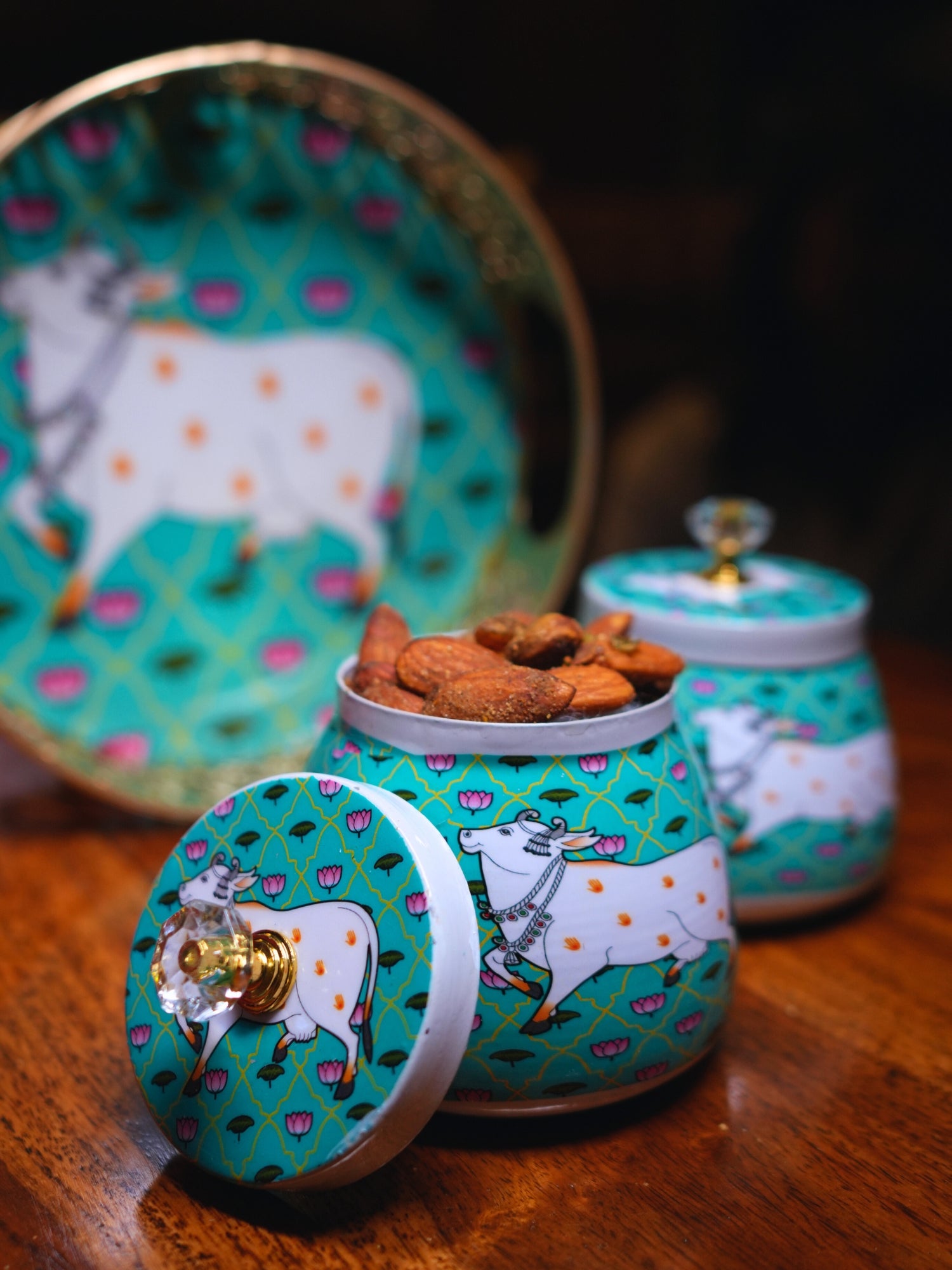 - Two Decorative Jars: The set includes two lidded jars with matching Pichwai designs, perfect for storing treats, jewelry, or other small items.