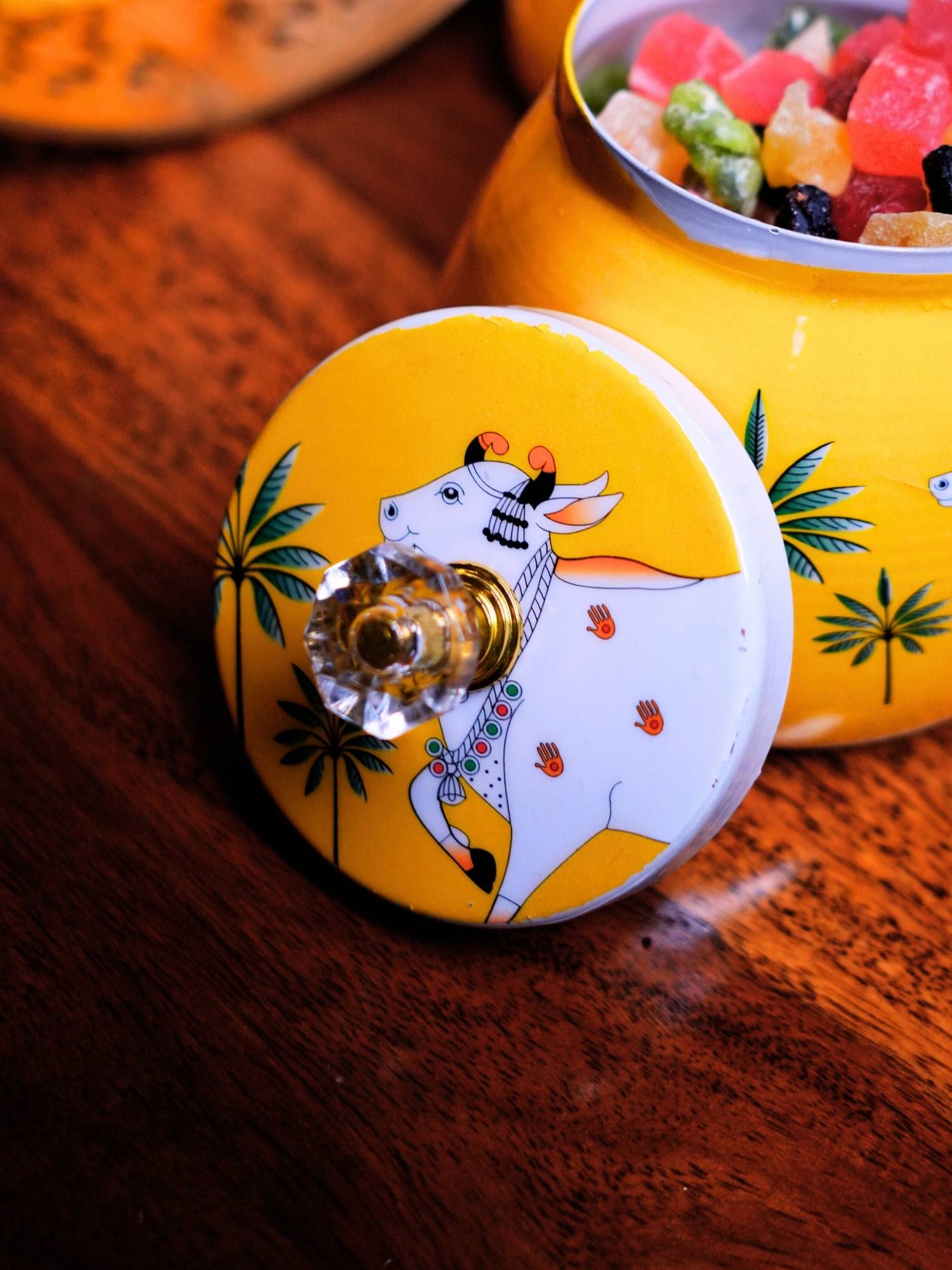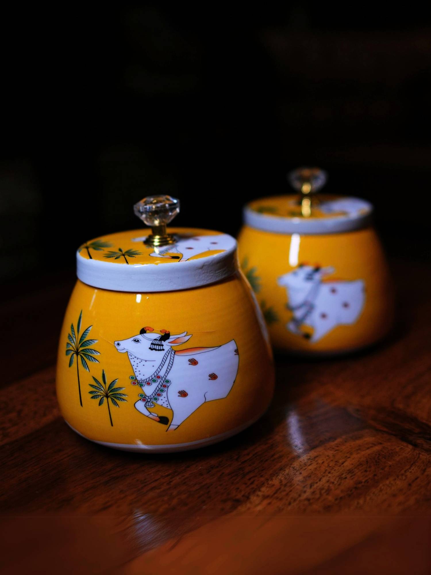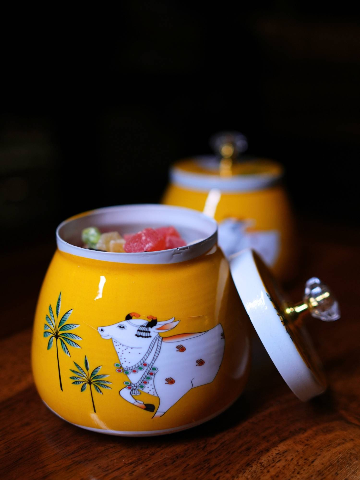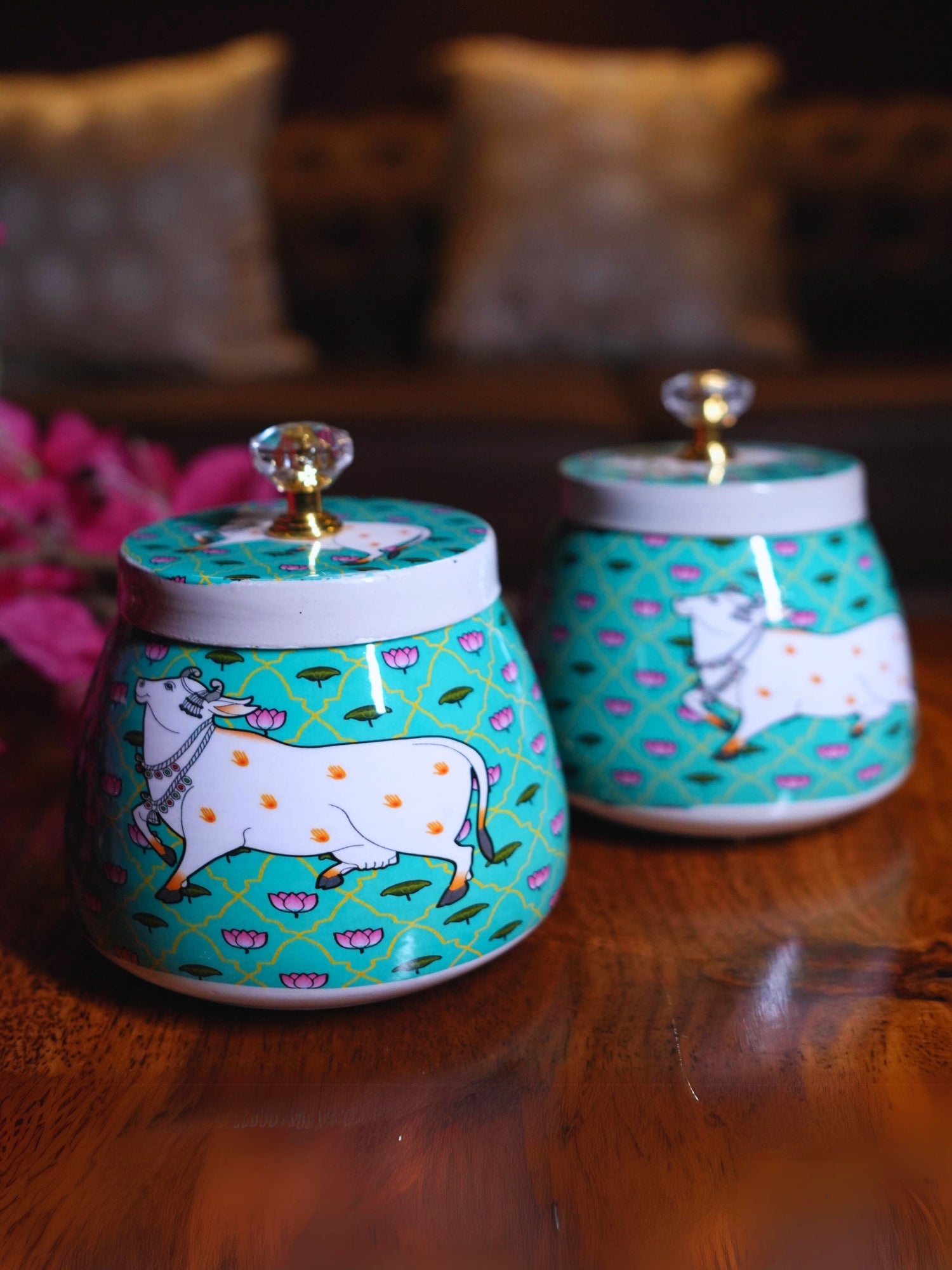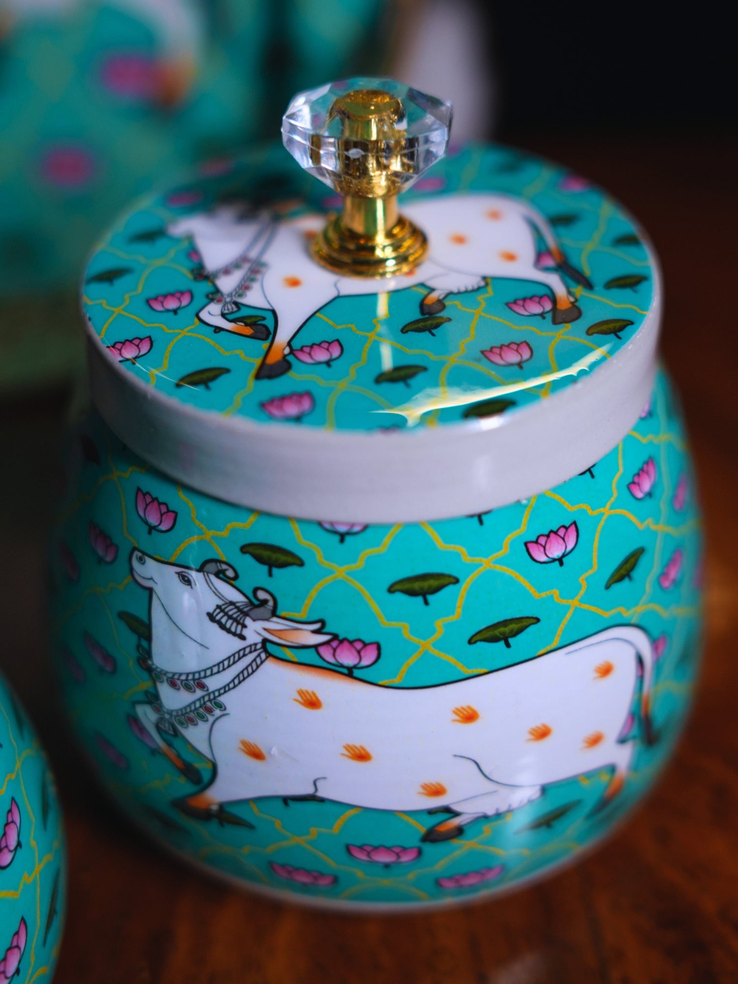 - Two Decorative Jars: The set includes two lidded jars with matching Pichwai designs, perfect for storing treats, jewelry, or other small items.
