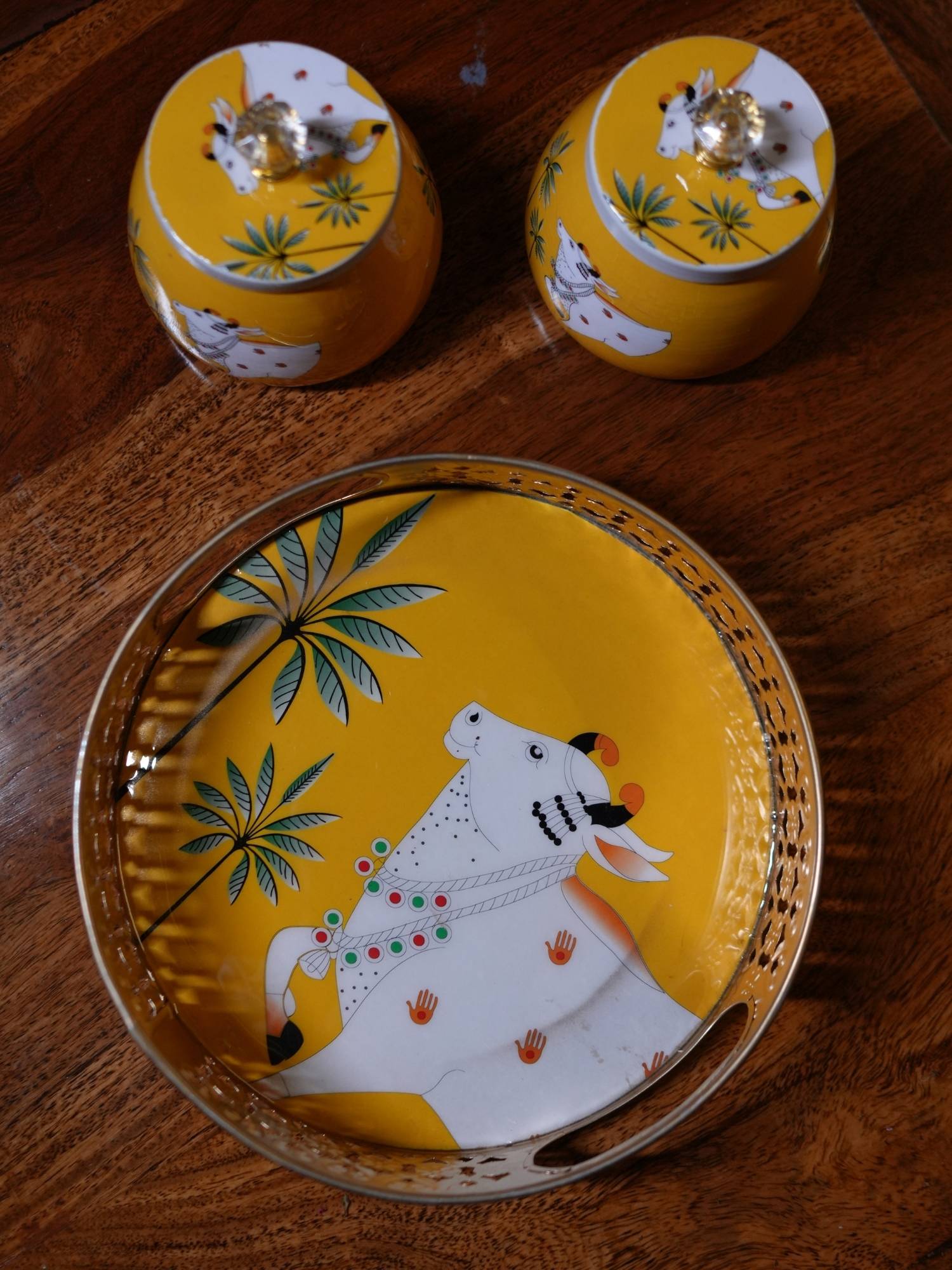 - Pichwai Art: The tray and jars feature beautiful Pichwai designs, depicting scenes from Hindu mythology and religious rituals.