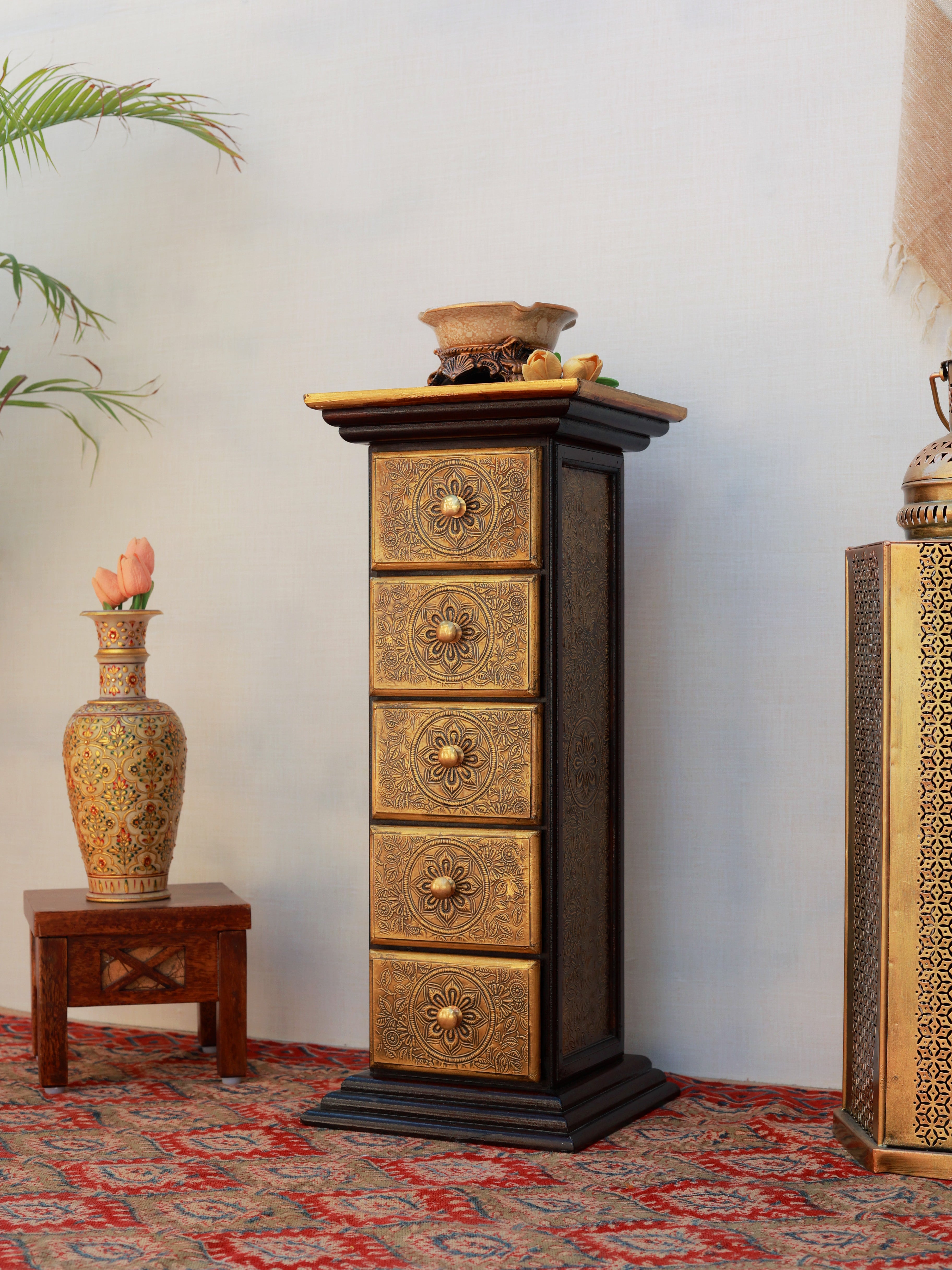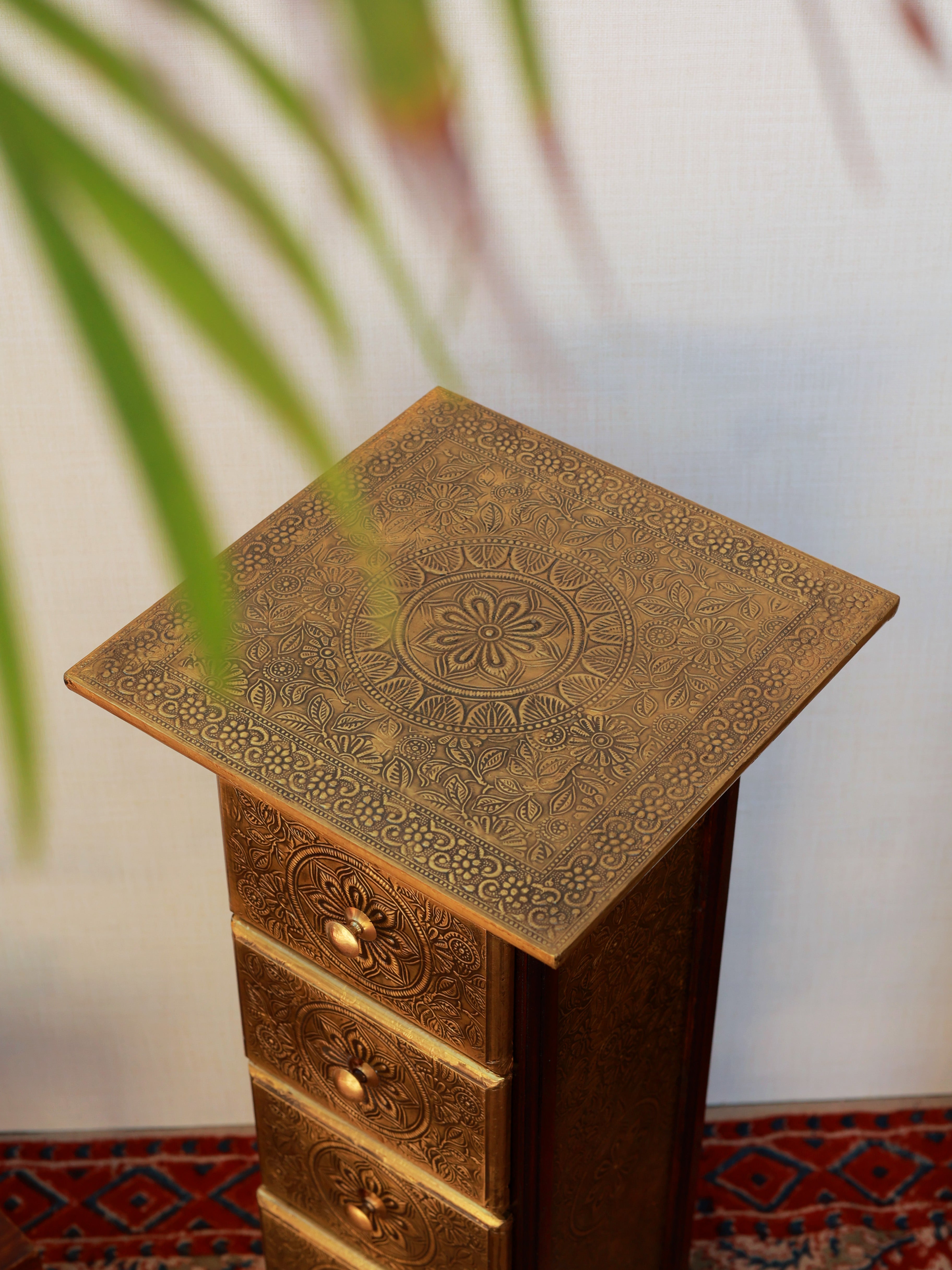 This tall brass-etched tower feels like a fragment of an old Indian courtyard, where pillars carried stories of devotion and craft. Each drawer is hand-etched with delicate florals, glowing softly like temple brass touched by morning light. Place it near your mandir or in a quiet corner, and it becomes a gentle keeper of your daily rituals — a piece that brings warmth, tradition, and a serene heritage charm into your home.